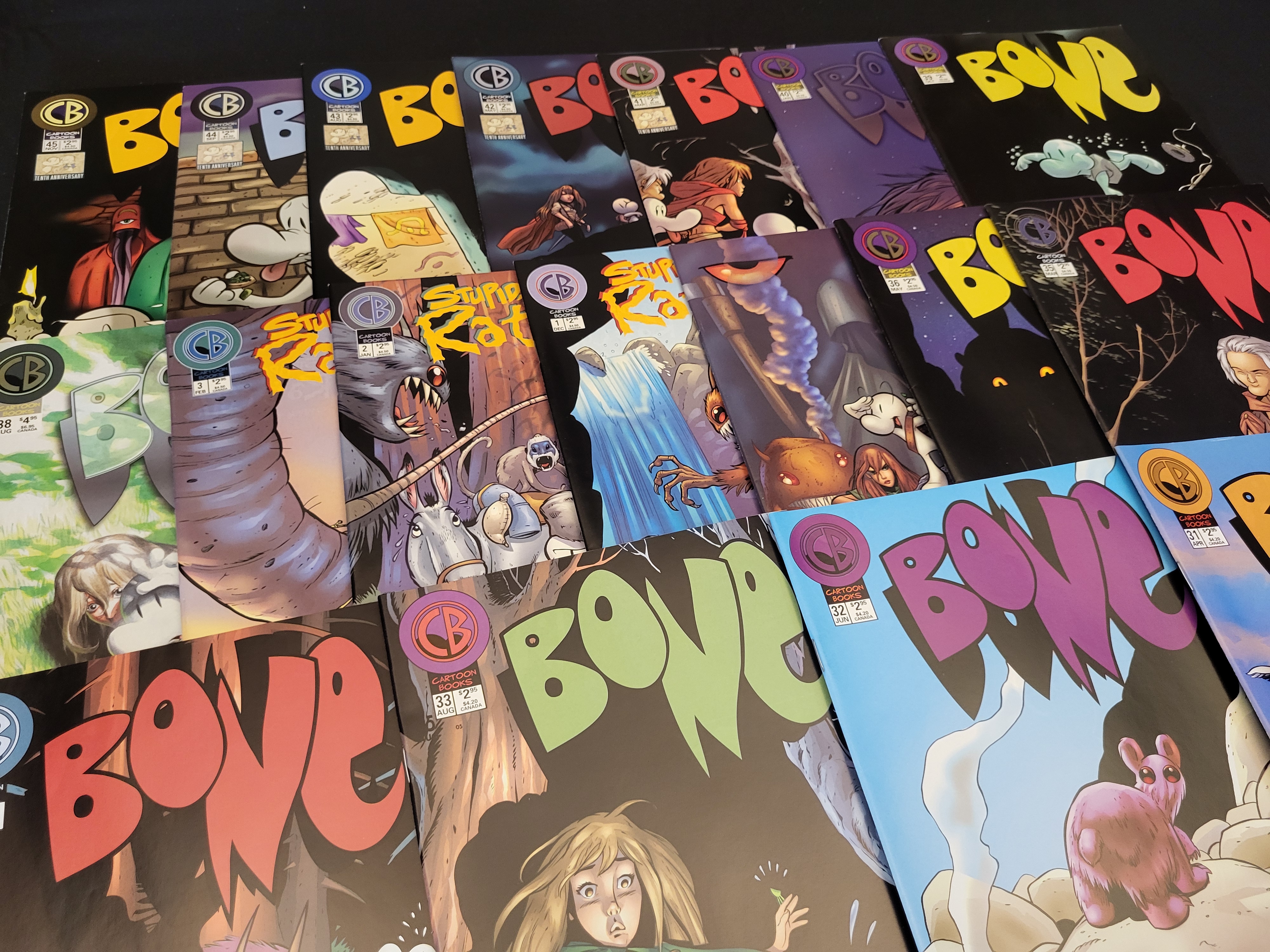 BID PER WHAT YOU SEE IN THE PHOTO, NOT THE AI GENERATED TITLES AND DESCRIPTIONS! A collection of modern era comic books written and illustrated by Jeff Smith, published under the Cartoon Books imprint. The group includes various issues from the fantasy series Bone, featuring issue numbers ranging from 31 to 45. Also included are multiple issues of the spin-off series titled Stupid Rat Creatures. The covers feature stylized title lettering, the Cartoon Books logo, and the creator’s name. Several issues of Bone include a Tenth Anniversary banner on the front cover, dating those specific issues to the early 2000s. The illustrations are in full color.