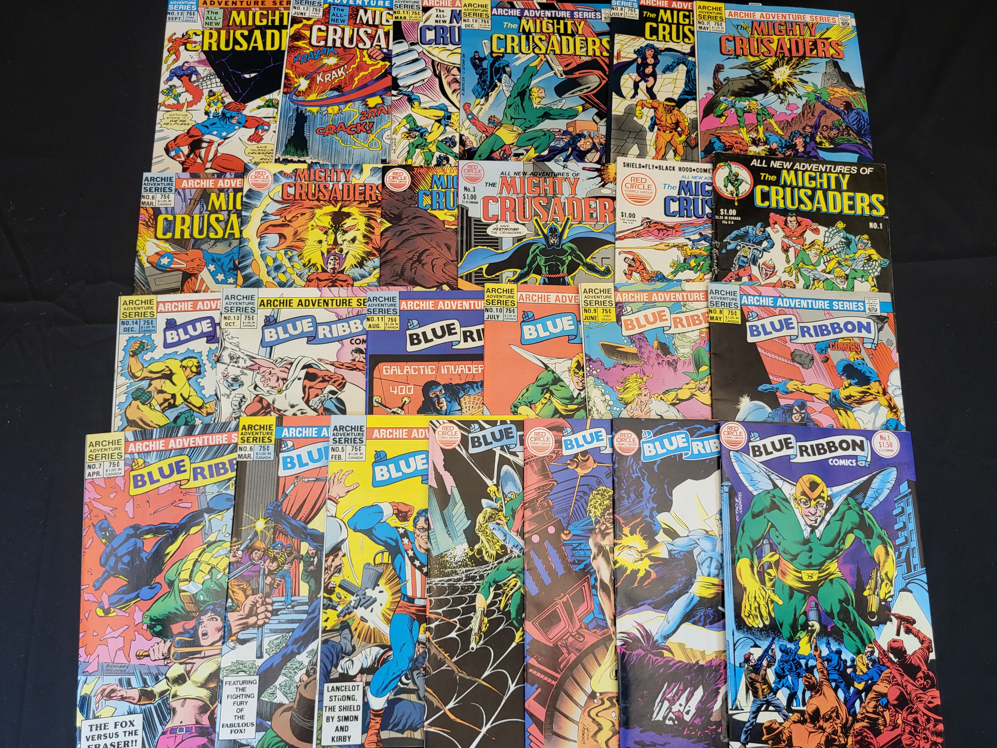 BID PER WHAT YOU SEE IN THE PHOTO, NOT THE AI GENERATED TITLES AND DESCRIPTIONS! A collection of vintage superhero comic books from the 1980s Archie Adventure Series and Red Circle Comics Group. The group primarily features various issues from The Mighty Crusaders and Blue Ribbon Comics titles. Individual issues show cover prices ranging from $0.75 to $1.50. Visible issue numbers include The Mighty Crusaders No. 1, No. 3, No. 6, No. 7, No. 8, No. 10, No. 11, No. 12, and No. 13, as well as Blue Ribbon Comics No. 1, No. 5, No. 6, No. 7, No. 8, No. 9, No. 10, No. 11, No. 13, and No. 14. The cover art depicts various superheroes including The Shield, Fly-Girl, The Black Hood, The Fox, and Lancelot Strong in dynamic action scenes. The items are presented unbagged and unboarded.