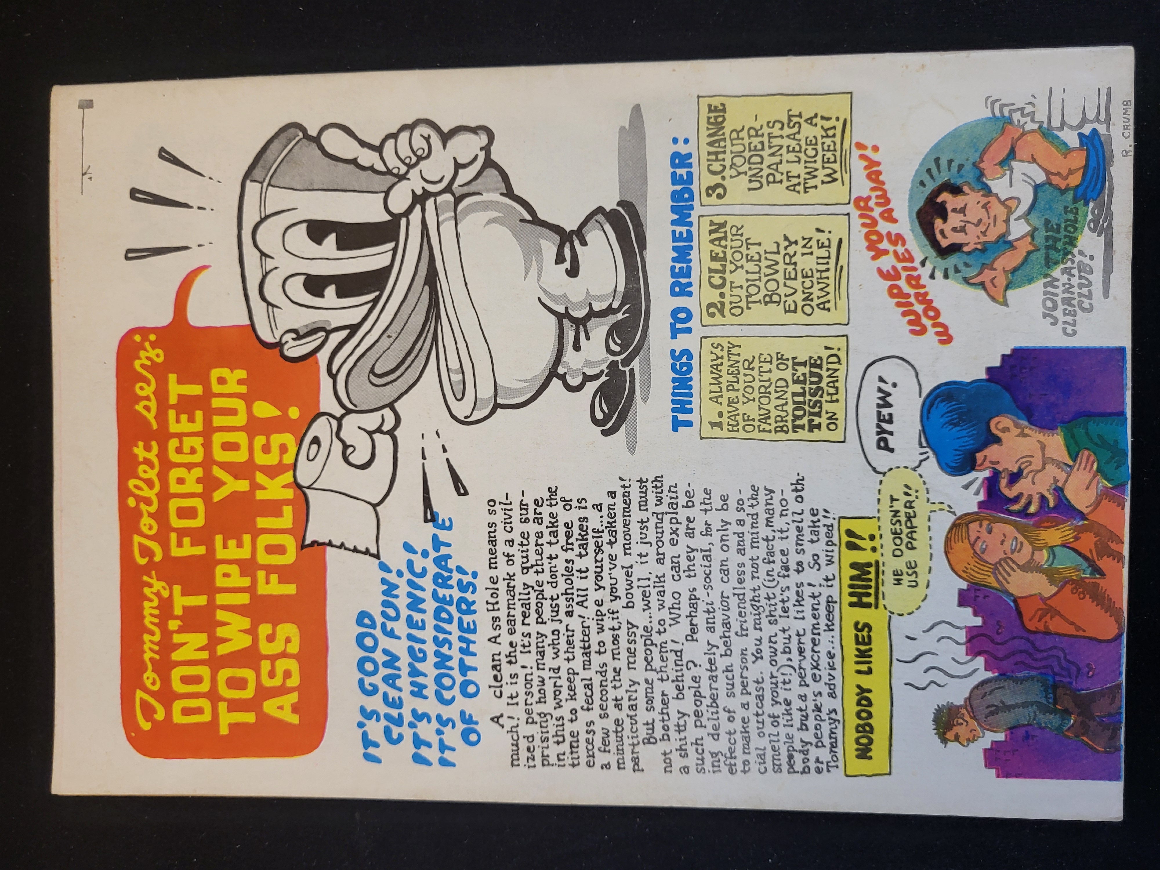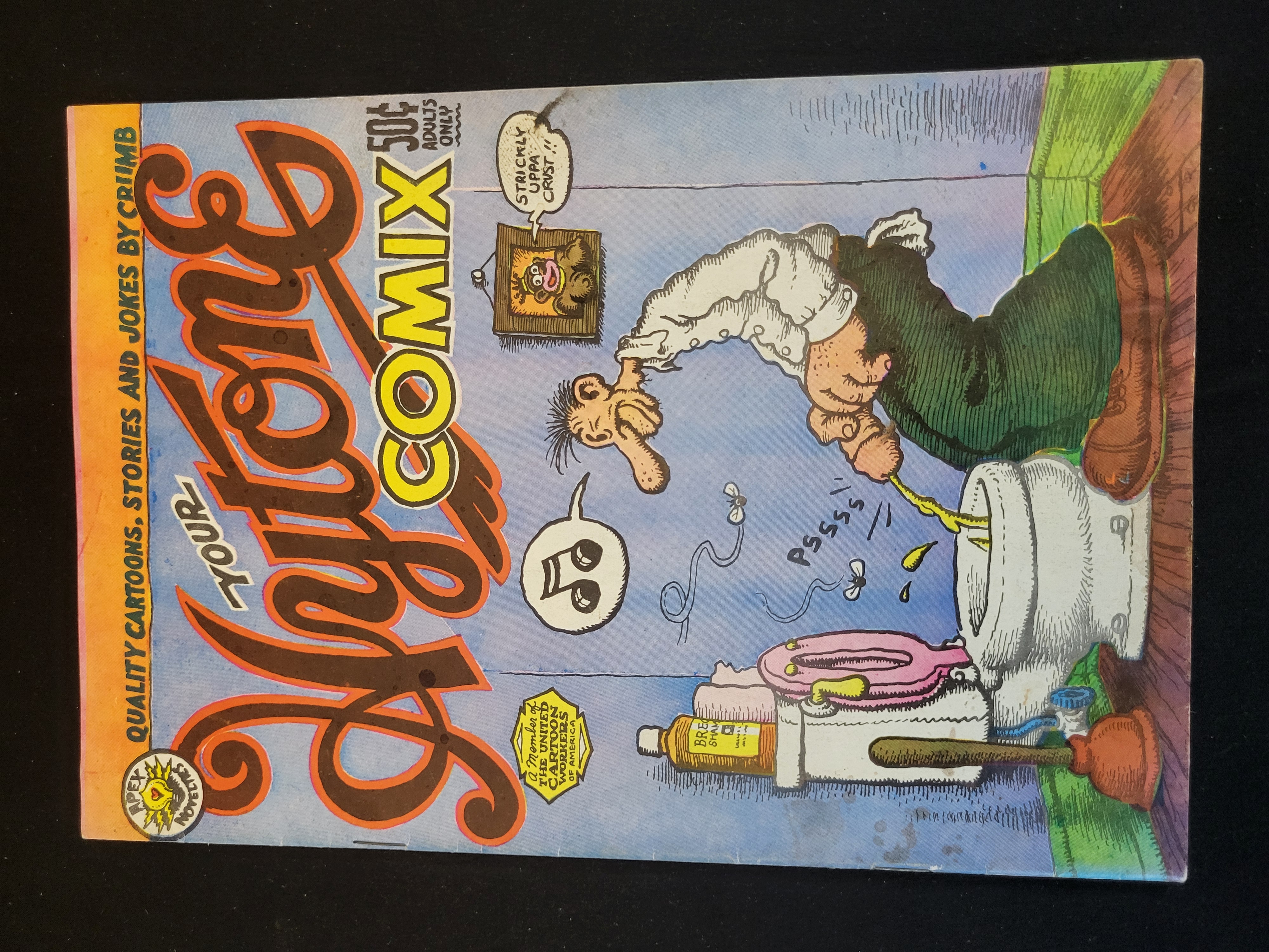BID PER WHAT YOU SEE IN THE PHOTO, NOT THE AI GENERATED TITLES AND DESCRIPTIONS! Your Hytone Comix No. 1 is an underground comic book featuring the work of artist Robert Crumb, published by Apex Novelties. The front cover displays a 50 cent price point and the designation Adults Only. The cover illustration depicts a character in a bathroom interior, accompanied by the text Quality Cartoons, Stories and Jokes by Crumb. The back cover contains a color-illustrated hygiene parody featuring the character Tommy Toilet and is signed R. Crumb in the lower right corner. The work is printed on standard paper stock with a color-printed cover. The Apex Novelties logo is visible in the lower left corner of the front cover.