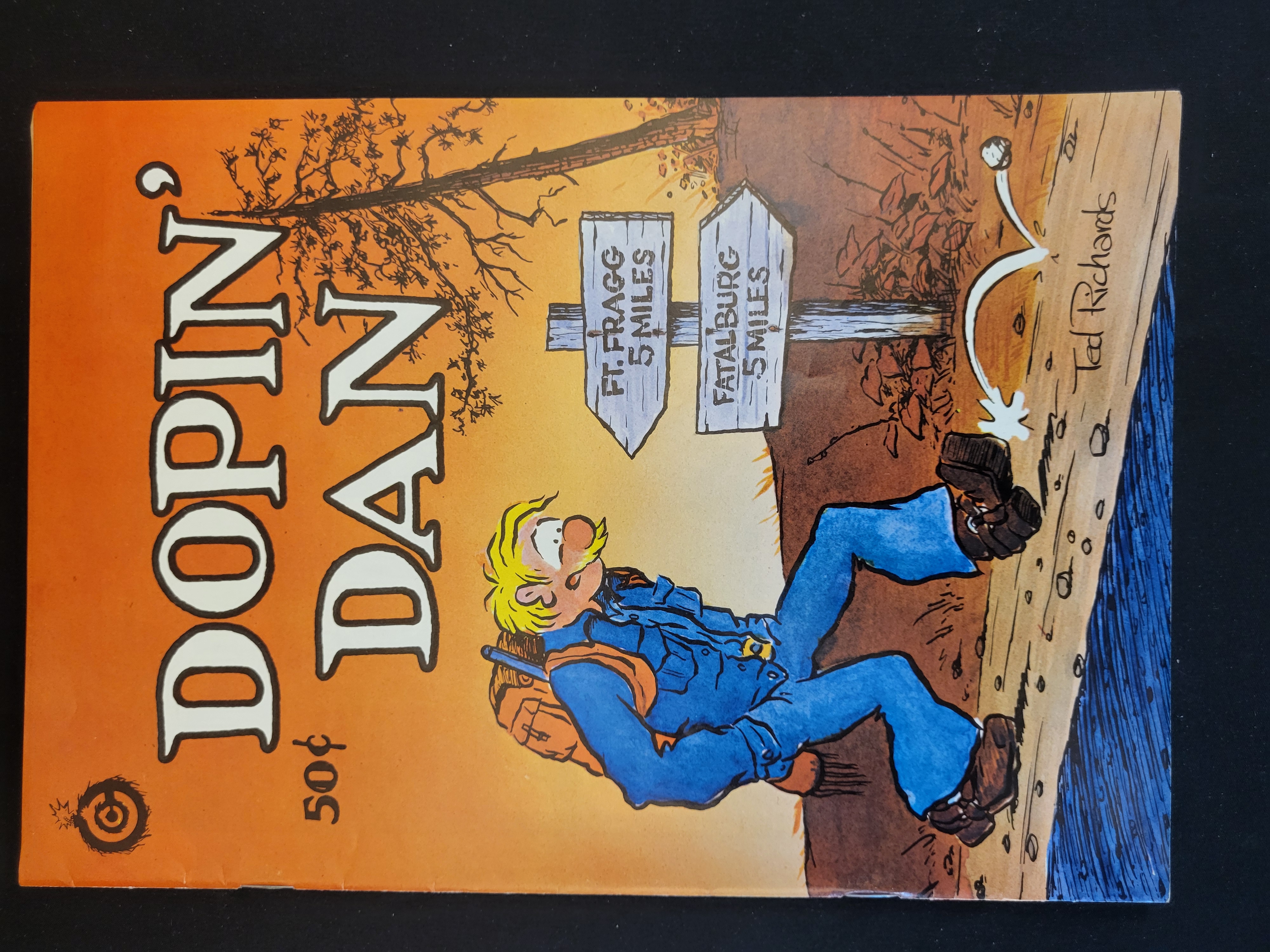 BID PER WHAT YOU SEE IN THE PHOTO, NOT THE AI GENERATED TITLES AND DESCRIPTIONS! Dopin Dan No. 3, an underground comic book published by Last Gasp Eco-Funnies in October 1973. The cover features illustrative work by artist Ted Richards, with a signature present in the lower right corner. The artwork depicts a blonde male character wearing blue utility fatigues, seated on the ground beside a wooden signpost indicating Ft. Fragg 5 Miles and Fatalburg 5 Miles. The front cover displays a 50-cent price mark and a circular logo in the bottom left corner. The background is rendered in a vibrant orange-to-yellow gradient. This is a staple-bound paper publication.