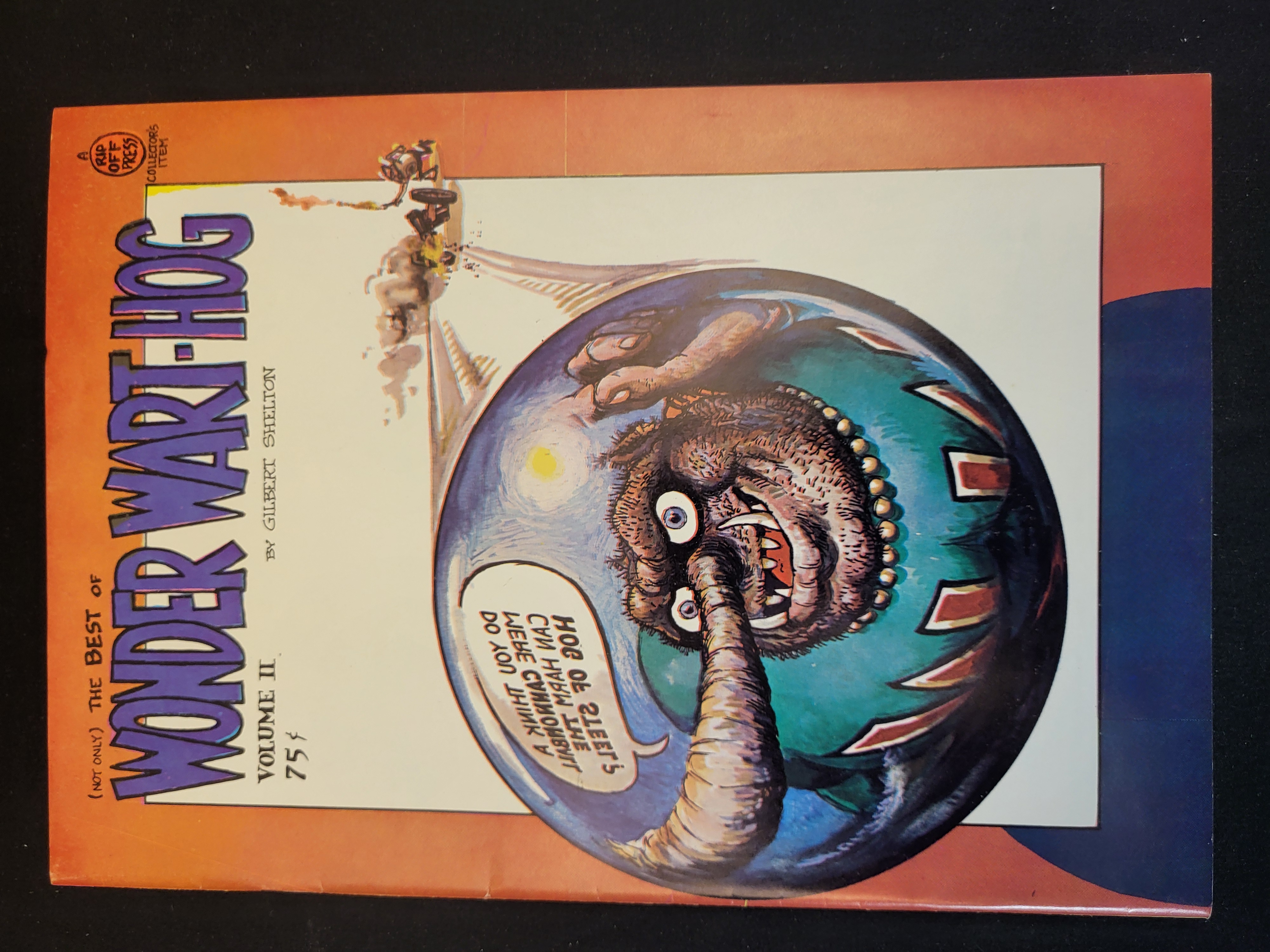 BID PER WHAT YOU SEE IN THE PHOTO, NOT THE AI GENERATED TITLES AND DESCRIPTIONS! This underground comic book, titled (Not Only) The Best of Wonder Wart-Hog Volume II, is written and illustrated by Gilbert Shelton and published by Rip Off Press. The front cover features a color illustration of the anthropomorphic Wonder Wart-Hog character contained within a blue sphere, set against an orange and white gradient background. The cover includes a speech bubble with mirrored text and is marked with a Rip Off Press Collector’s Item seal and an original 75 cent price. The back cover displays black and white comic strip panels in Shelton’s signature style, including headlines such as Merangsters Exterminated in Bloody Street Massacre. The publication features a stapled spine.