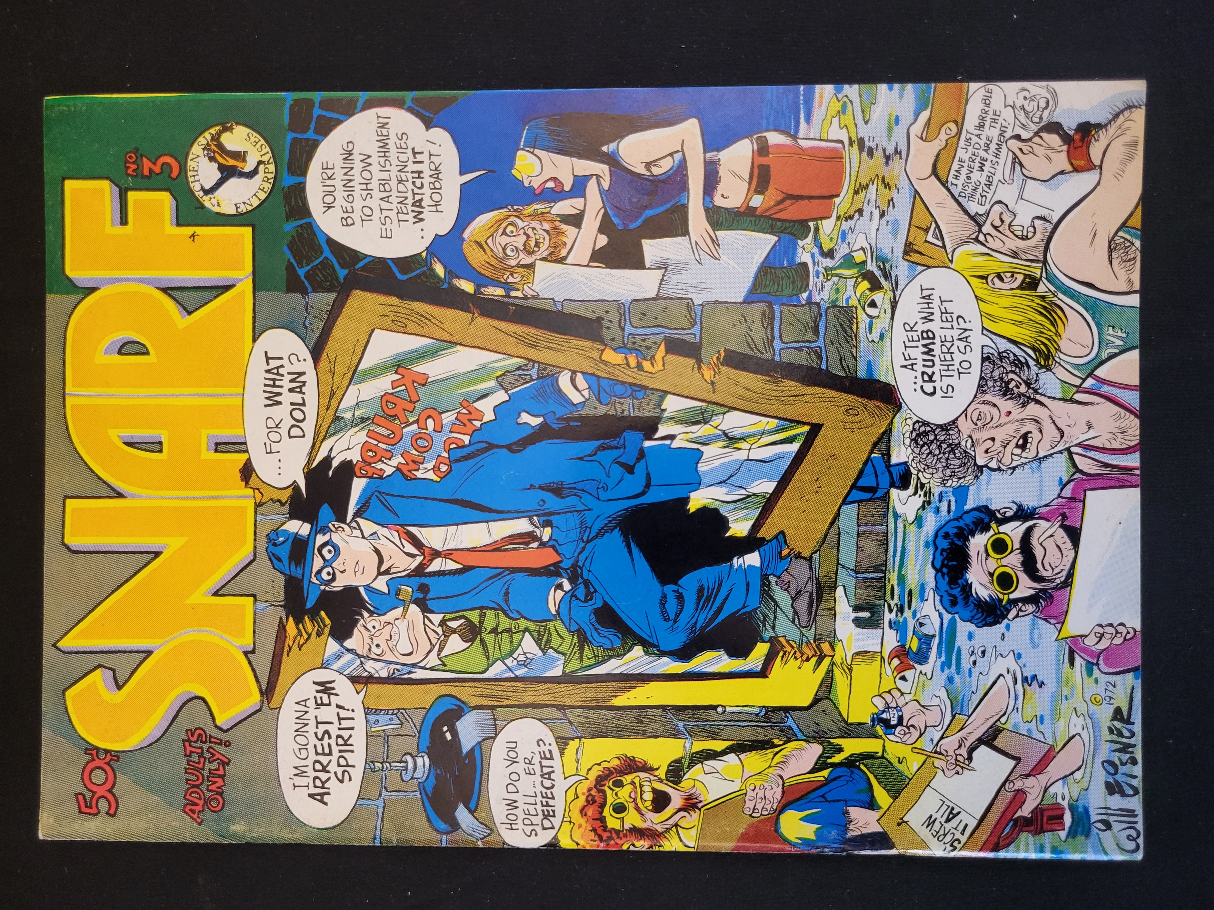 BID PER WHAT YOU SEE IN THE PHOTO, NOT THE AI GENERATED TITLES AND DESCRIPTIONS! This single issue of the underground comic Snarf No. 3 was published by Kitchen Sink Enterprises in 1972 and is labeled for Adults Only. The publication features a satirical front cover illustration by Will Eisner, signed and dated 1972, depicting his character The Spirit breaking through a comic panel surrounded by various counterculture characters and speech bubbles. The back cover displays a full-page color illustration titled Foot-Long Hotdog! by artist Tim Boxell, signed T. Boxell and dated 1972. The comic is a staple-bound softcover. Web intelligence identifies additional contributors to this issue as Denis Kitchen, Tom Christopher Poplaski, Evert Geradts, and Pete Loft.