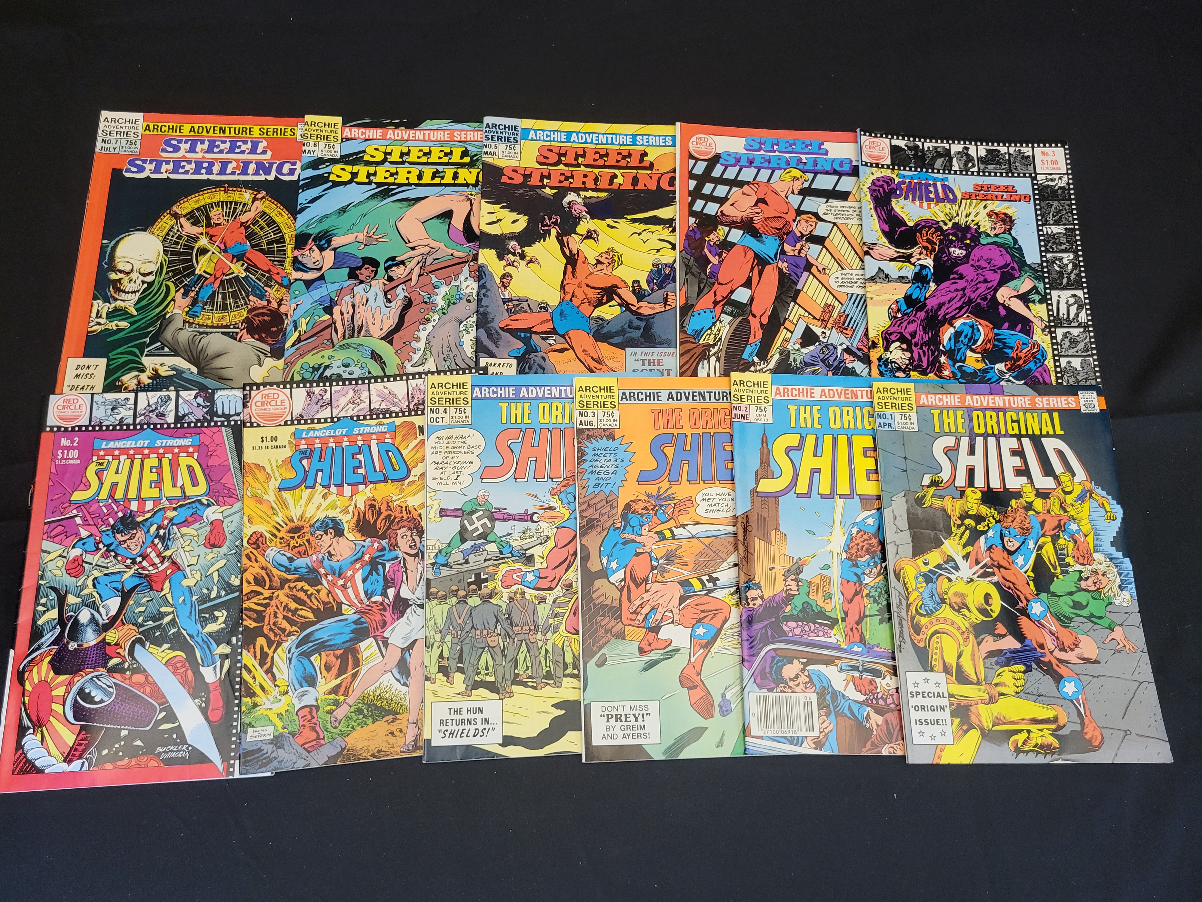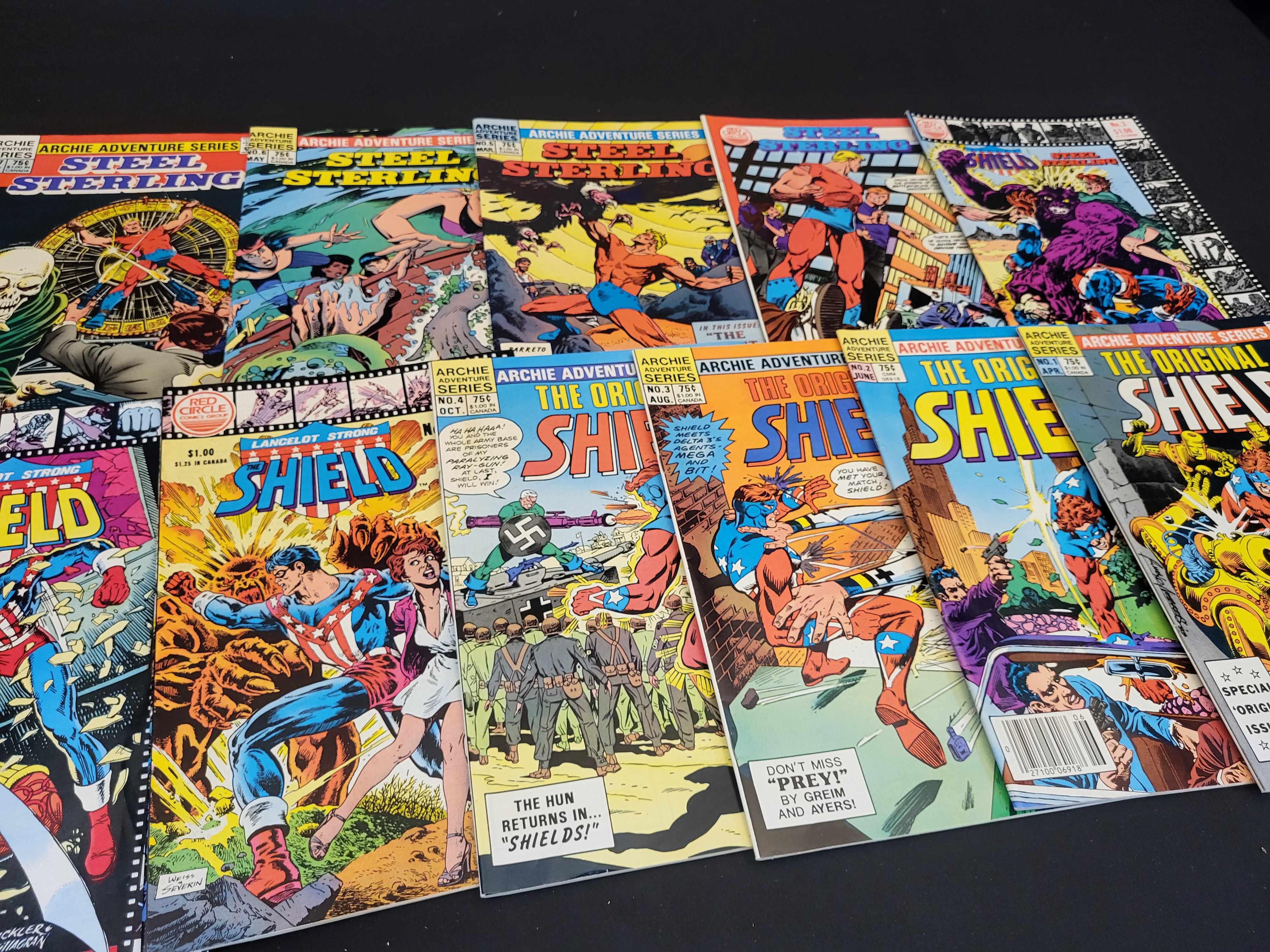 BID PER WHAT YOU SEE IN THE PHOTO, NOT THE AI GENERATED TITLES AND DESCRIPTIONS! A group of vintage comic books from the early 1980s published under the Archie Adventure Series and Red Circle Comics Group imprints. The collection includes several issues of Steel Sterling, The Original Shield, and Lancelot Strong: The Shield. The issues feature cover art by notable illustrators including Dick Ayers, Rich Buckler, and John Severin. The books are printed on standard comic paper and carry original cover prices ranging from 75 cents to $1.00. The assortment includes a run of The Original Shield issues 1 through 4 and various issues of Steel Sterling.