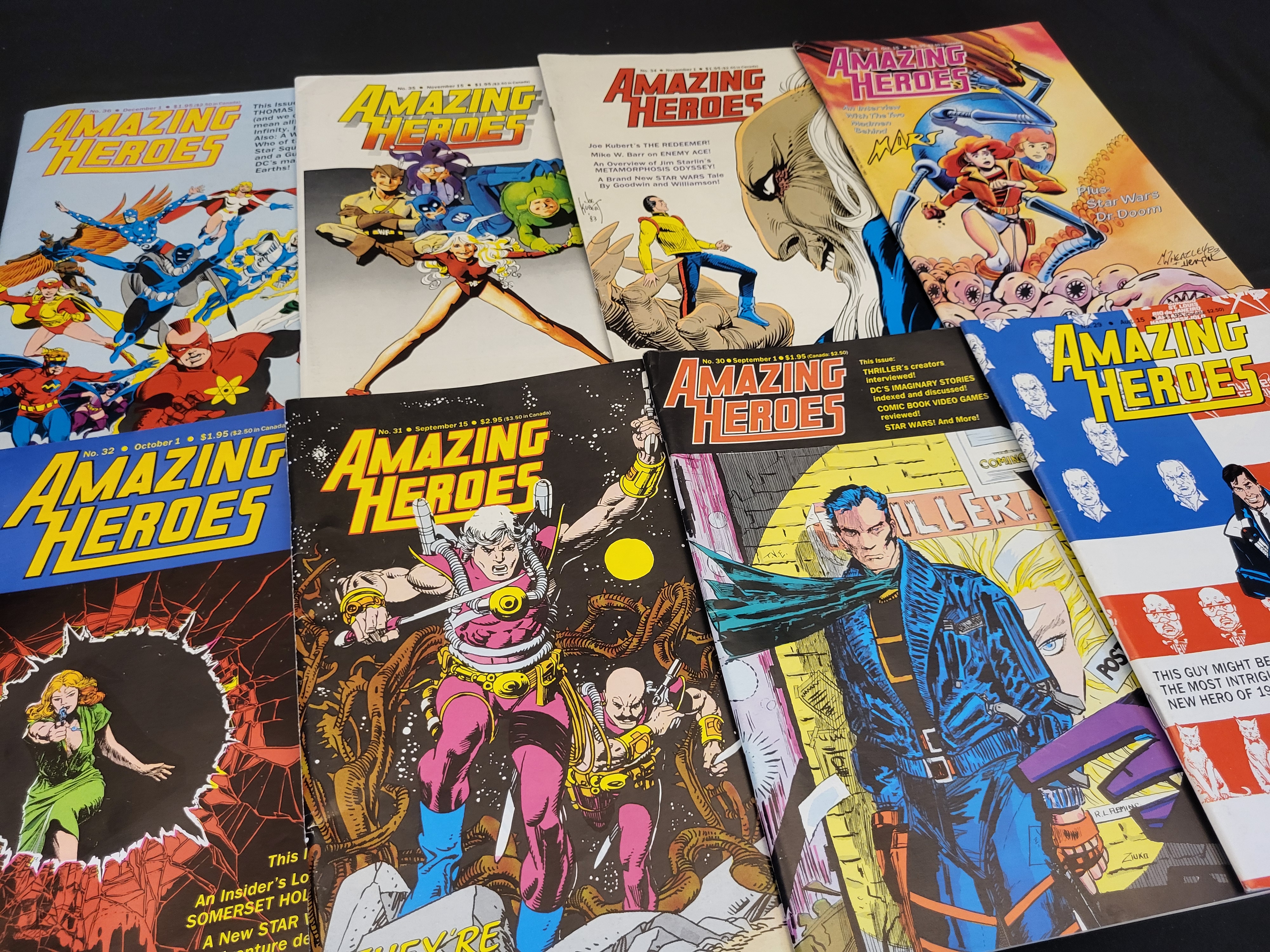 BID PER WHAT YOU SEE IN THE PHOTO, NOT THE AI GENERATED TITLES AND DESCRIPTIONS! A group of Amazing Heroes comic book industry magazines published by Fantagraphics Books. This collection includes sequential issues ranging from No. 29 through No. 36, dated from August 1983 to December 1983. The publications are in a standard magazine format with glossy color covers. Featured cover illustrations include Reuben Flagg, Thriller, and various superhero ensembles. The magazines contain interviews, industry news, reviews, and historical retrospectives of the comic book industry.