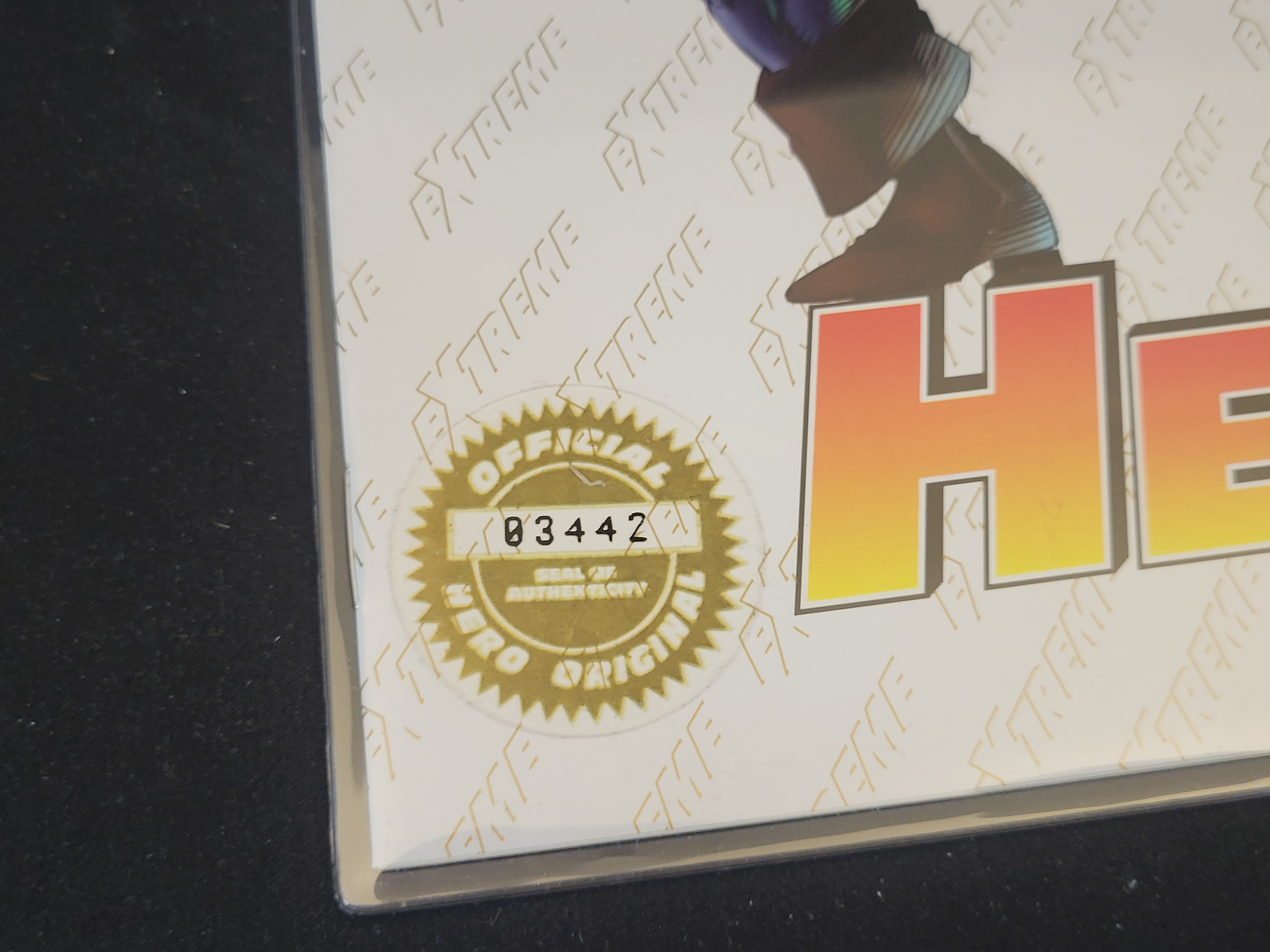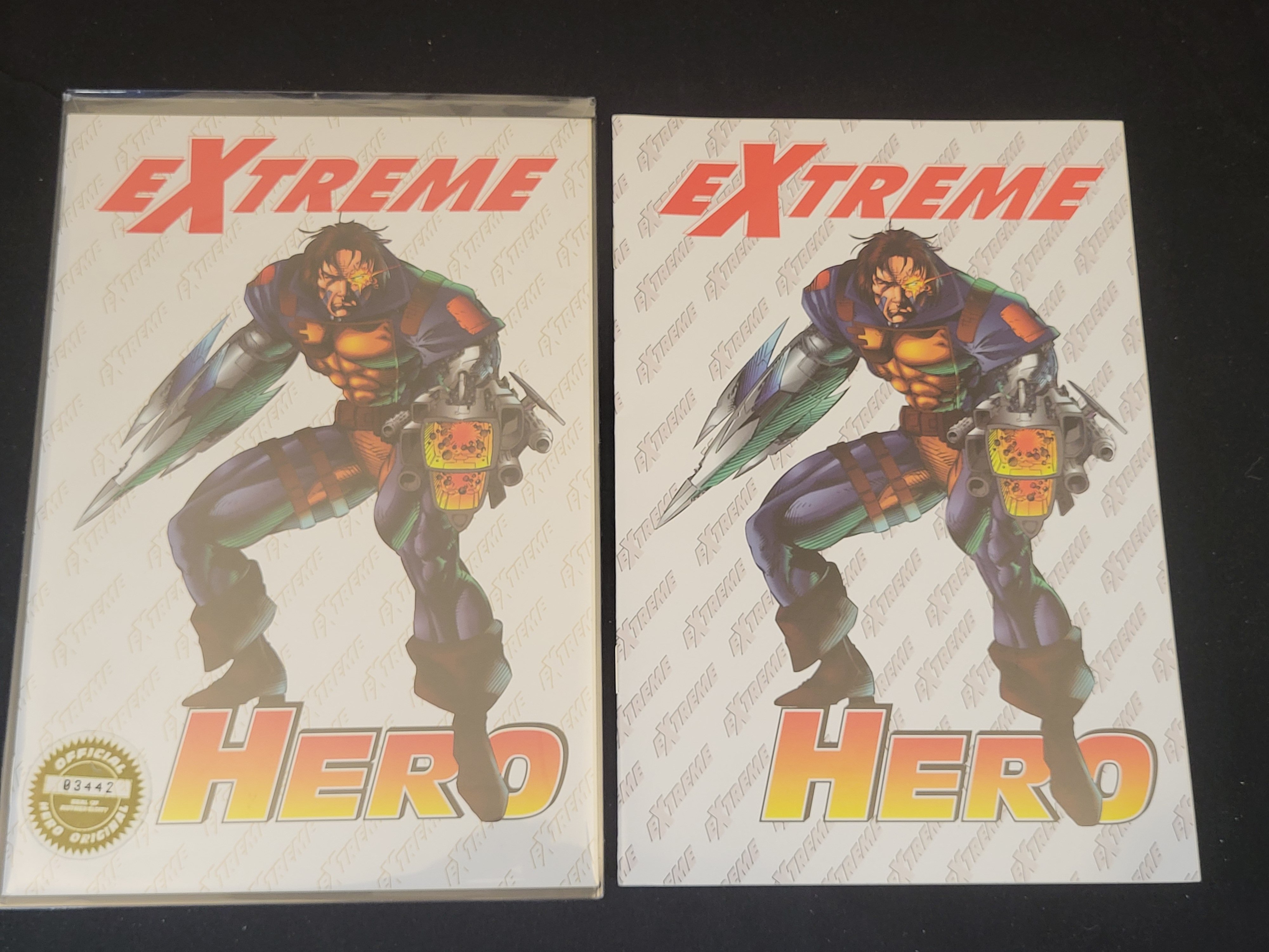 BID PER WHAT YOU SEE IN THE PHOTO, NOT THE AI GENERATED TITLES AND DESCRIPTIONS! A pair of Extreme Hero Illustrated Special preview issue #1 comic books published by Extreme Studios in 1994. These premiere edition collectibles feature stylized cover illustrations of a cybernetic warrior. The covers are constructed from white cardstock featuring a repeating diagonal watermark pattern of the word EXTREME. The title typography is rendered in bold red and yellow gradient tones. One item is housed in a clear protective plastic sleeve featuring a gold foil Official Hero Original seal of authenticity on the lower left corner with serial number 03442. The reverse of the sleeve is secured with a matching gold foil Hero Premiere Edition seal. The reverse of both items displays the repeating watermark pattern on a plain white background.
