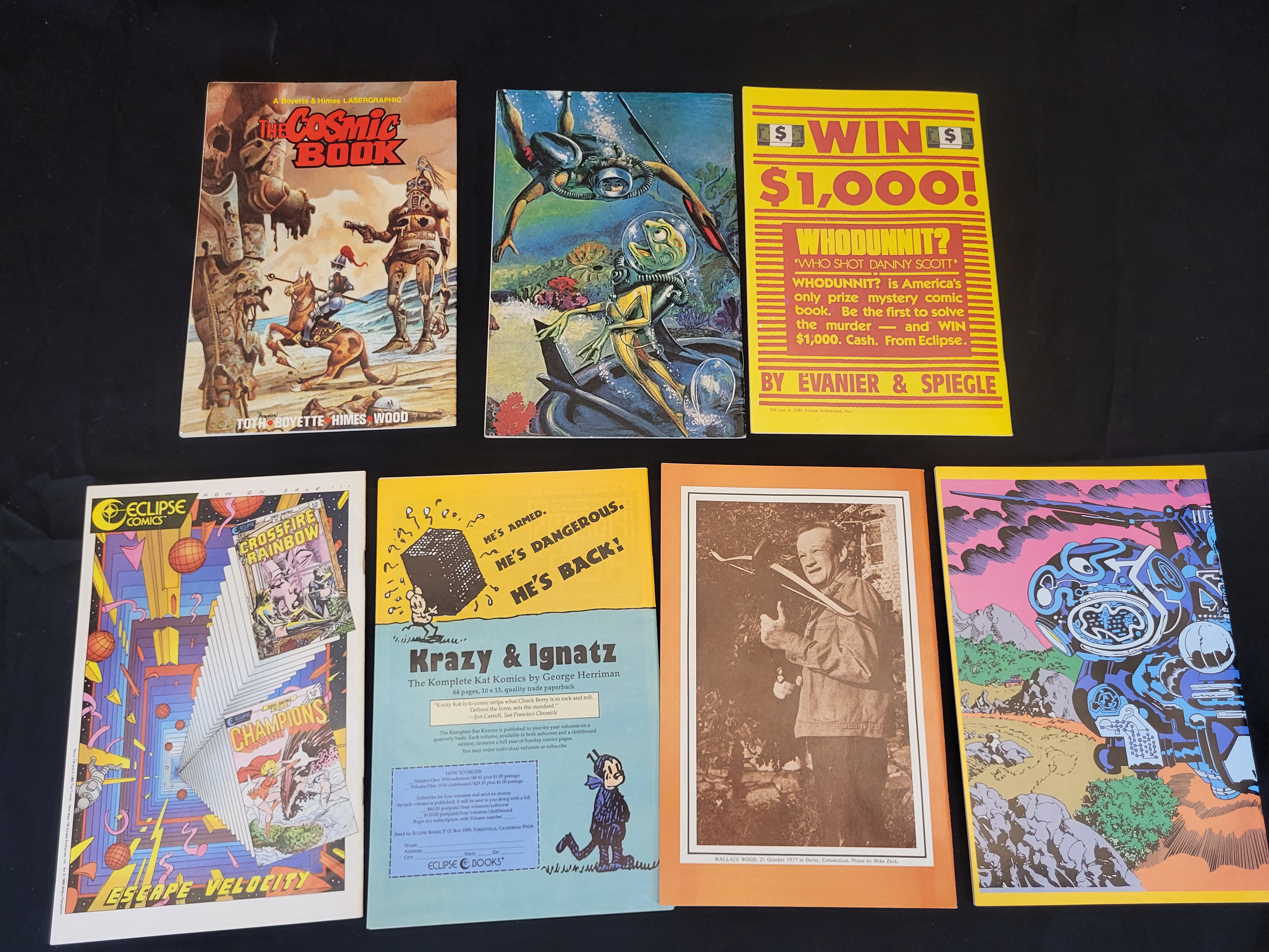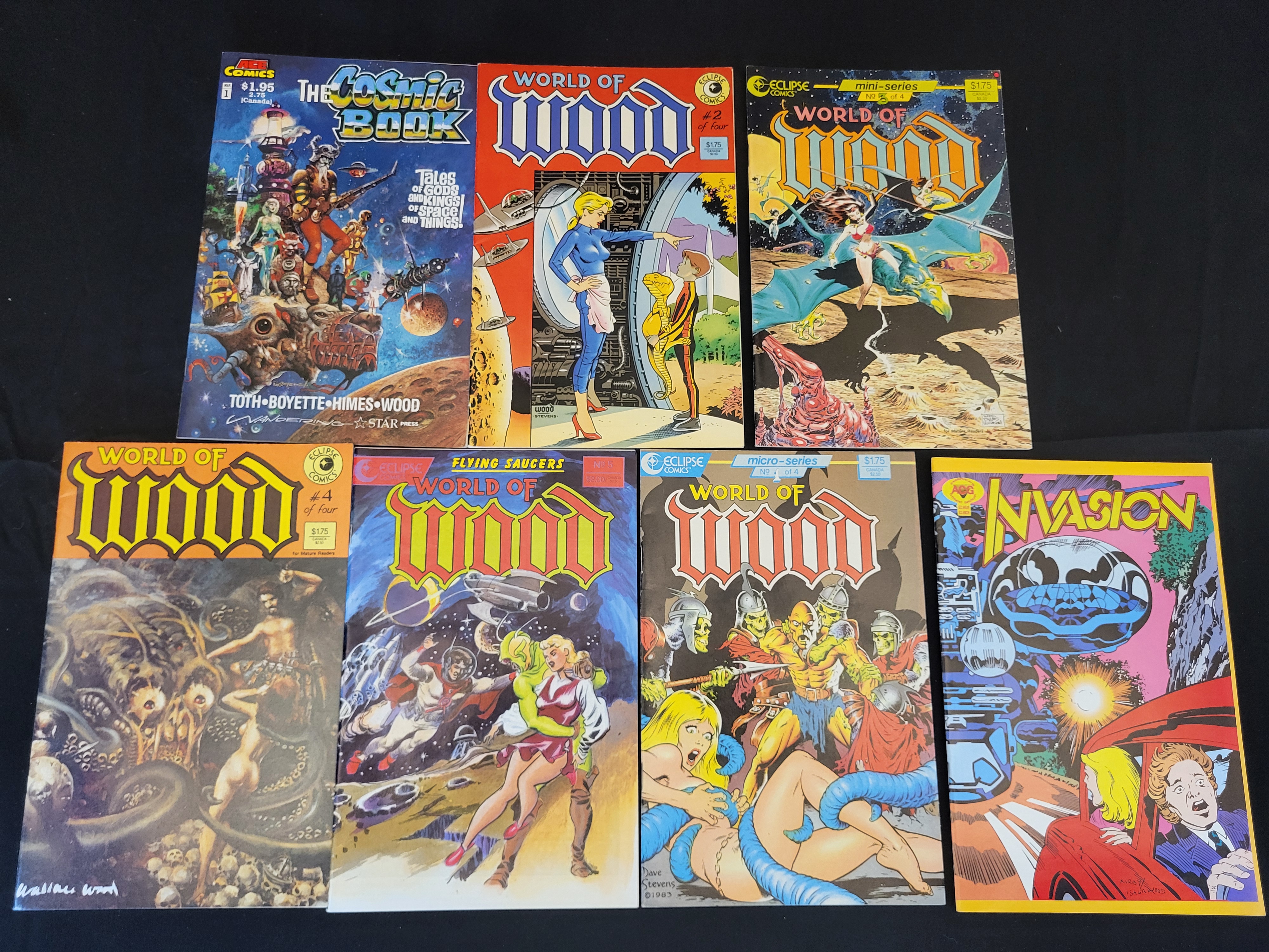 BID PER WHAT YOU SEE IN THE PHOTO, NOT THE AI GENERATED TITLES AND DESCRIPTIONS! This collection of independent science fiction and fantasy comic books primarily features the work of artist Wallace Wally Wood. The group includes multiple issues of the World of Wood series published by Eclipse Comics, including collaborations with artists such as Dave Stevens. Specific titles present include World of Wood issues number 2, 3, 4, and 5, alongside a micro-series issue, The Cosmic Book number 1 published by Ace Comics, and an issue of Invasion. The publications date from the late 1970s through the late 1980s. These staple-bound paper ephemera items feature vibrant cover art, publisher logos, and original cover prices. The back covers display various advertisements and biographical information, including a photograph of Wallace Wood dated 1977.