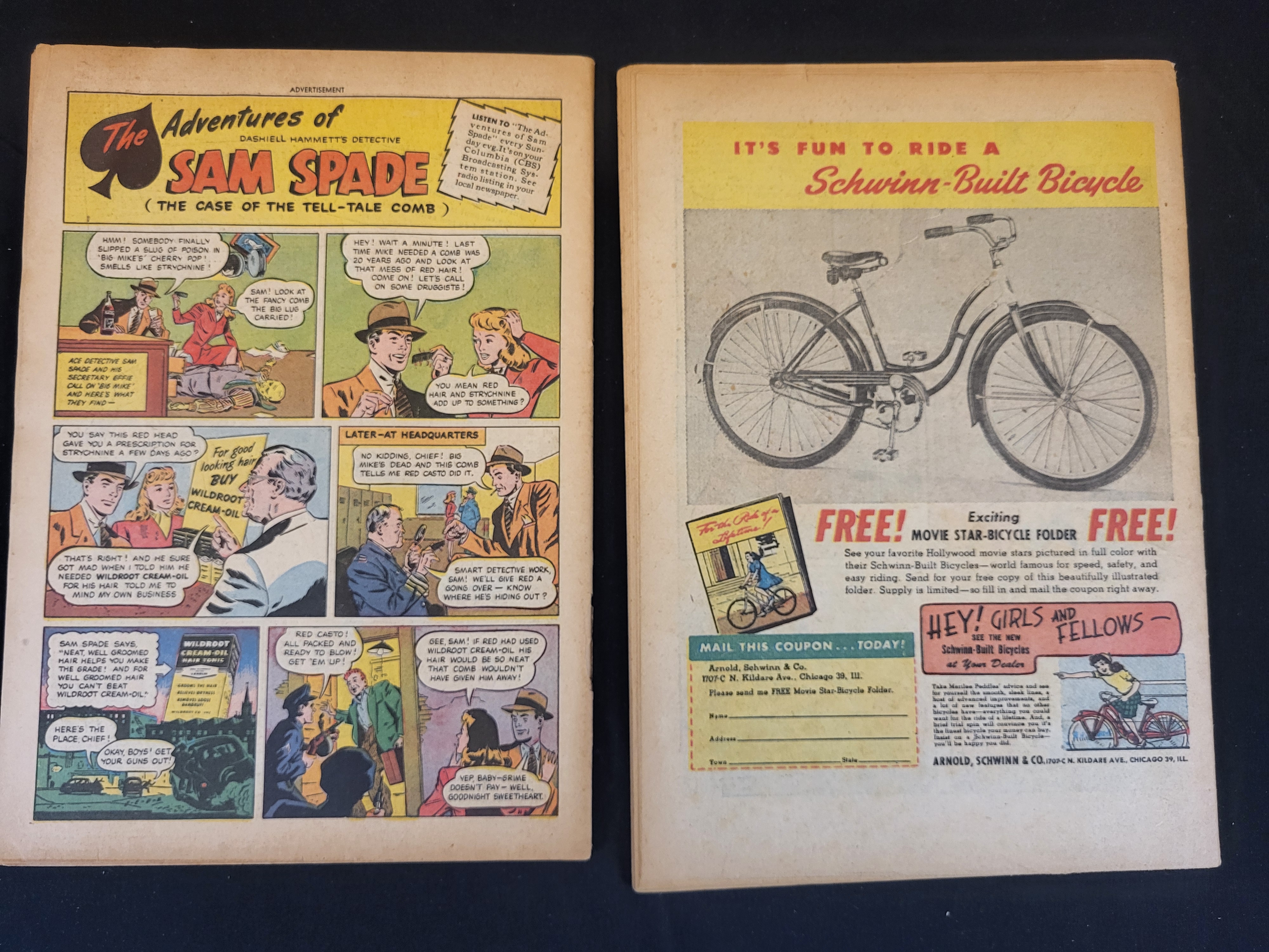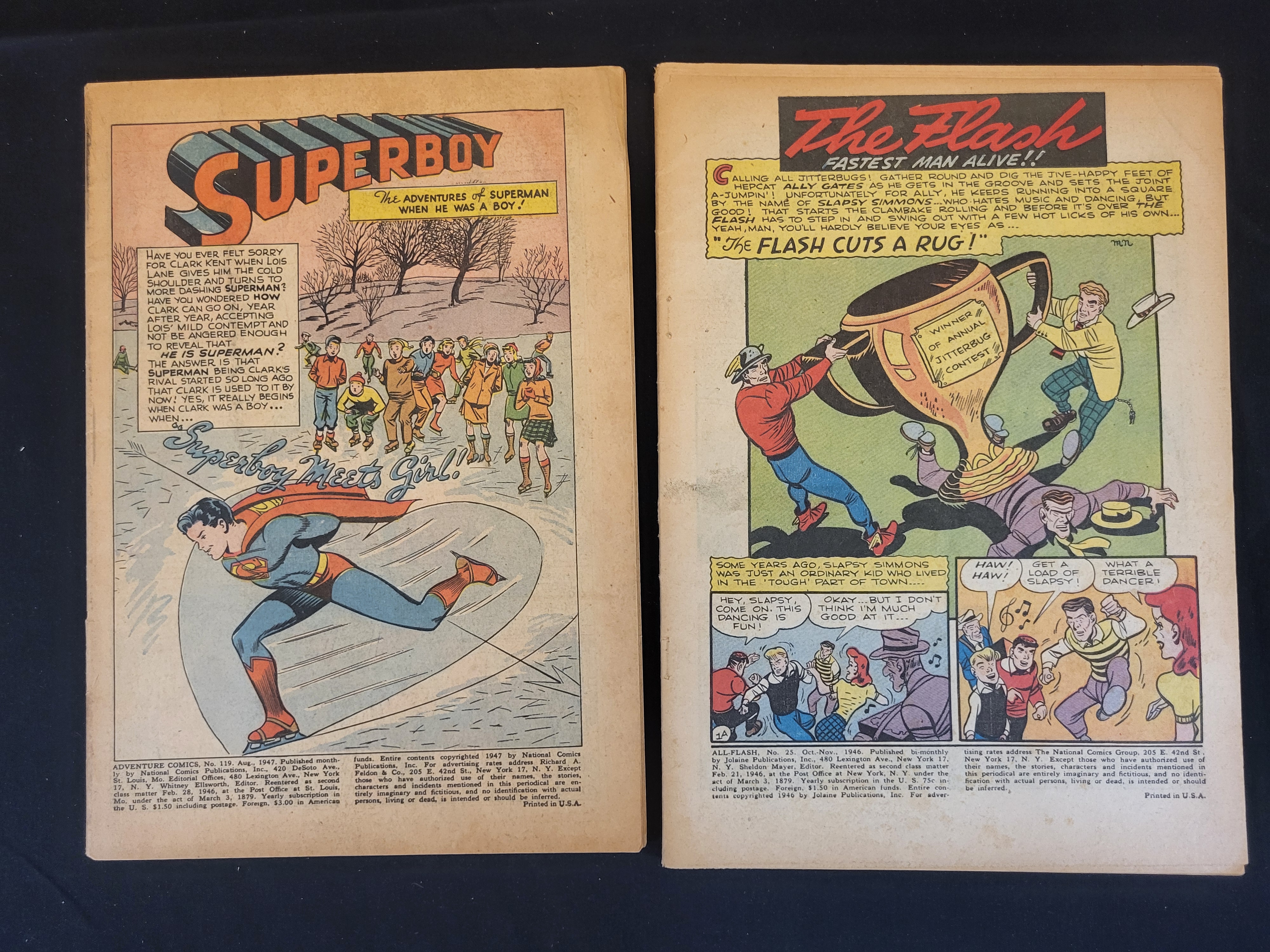 BID PER WHAT YOU SEE IN THE PHOTO, NOT THE AI GENERATED TITLES AND DESCRIPTIONS! This lot consists of two comic books from the Golden Age of publishing. The first is Adventure Comics No. 119, published in August 1947 by National Comics Publications, Inc. This issue features Superboy in the story Superboy Meets Girl! and contains a reverse-side advertisement for Wildroot Cream-Oil presented as a Sam Spade comic strip. The second issue is All-Flash No. 25, published in October-November 1946 by Jolaine Publications, Inc. It features The Flash in the story The Flash Cuts a Rug! and includes a Schwinn-Built Bicycle advertisement on the back cover. Both publications are staple-bound and printed on newsprint paper.