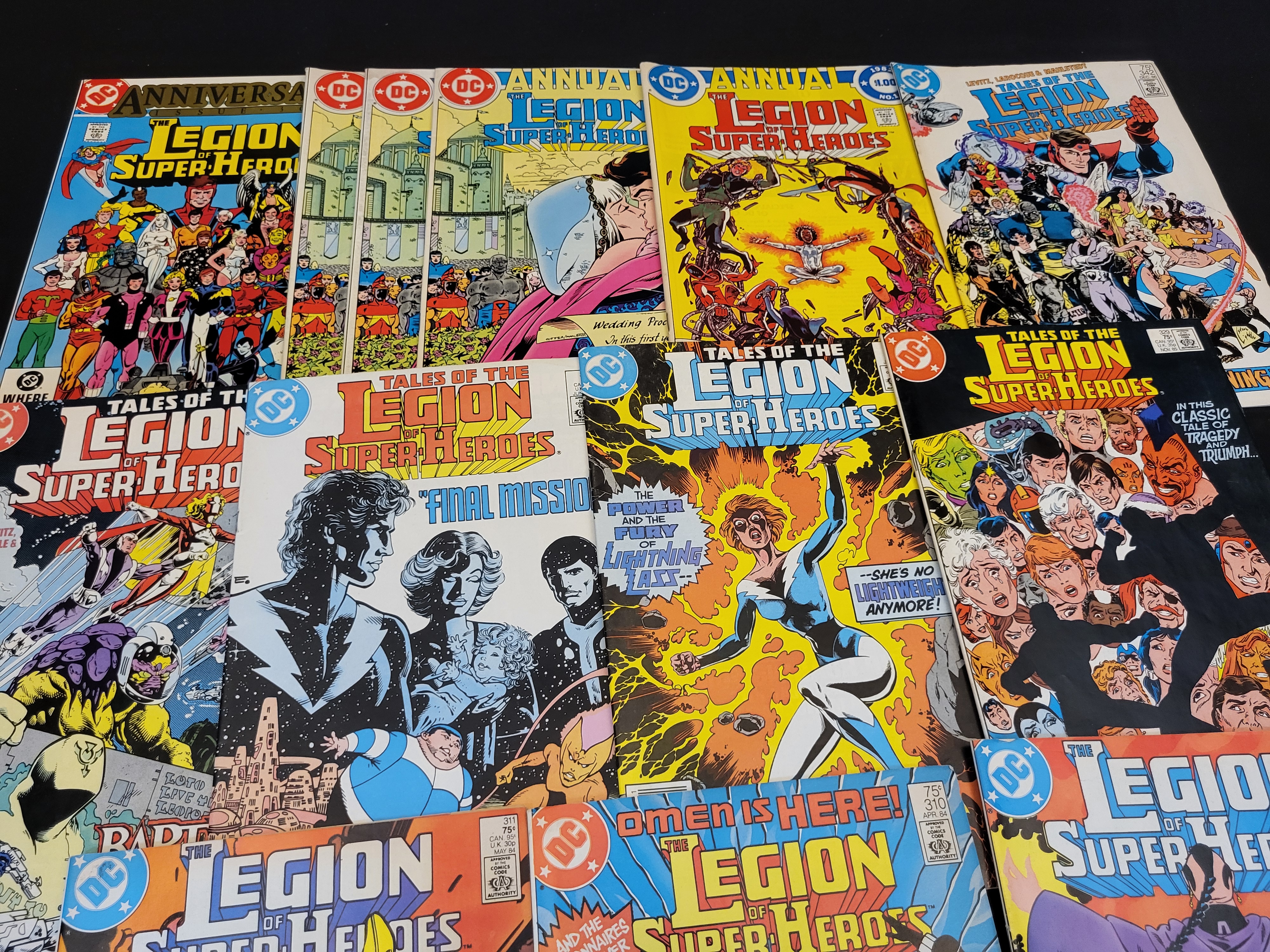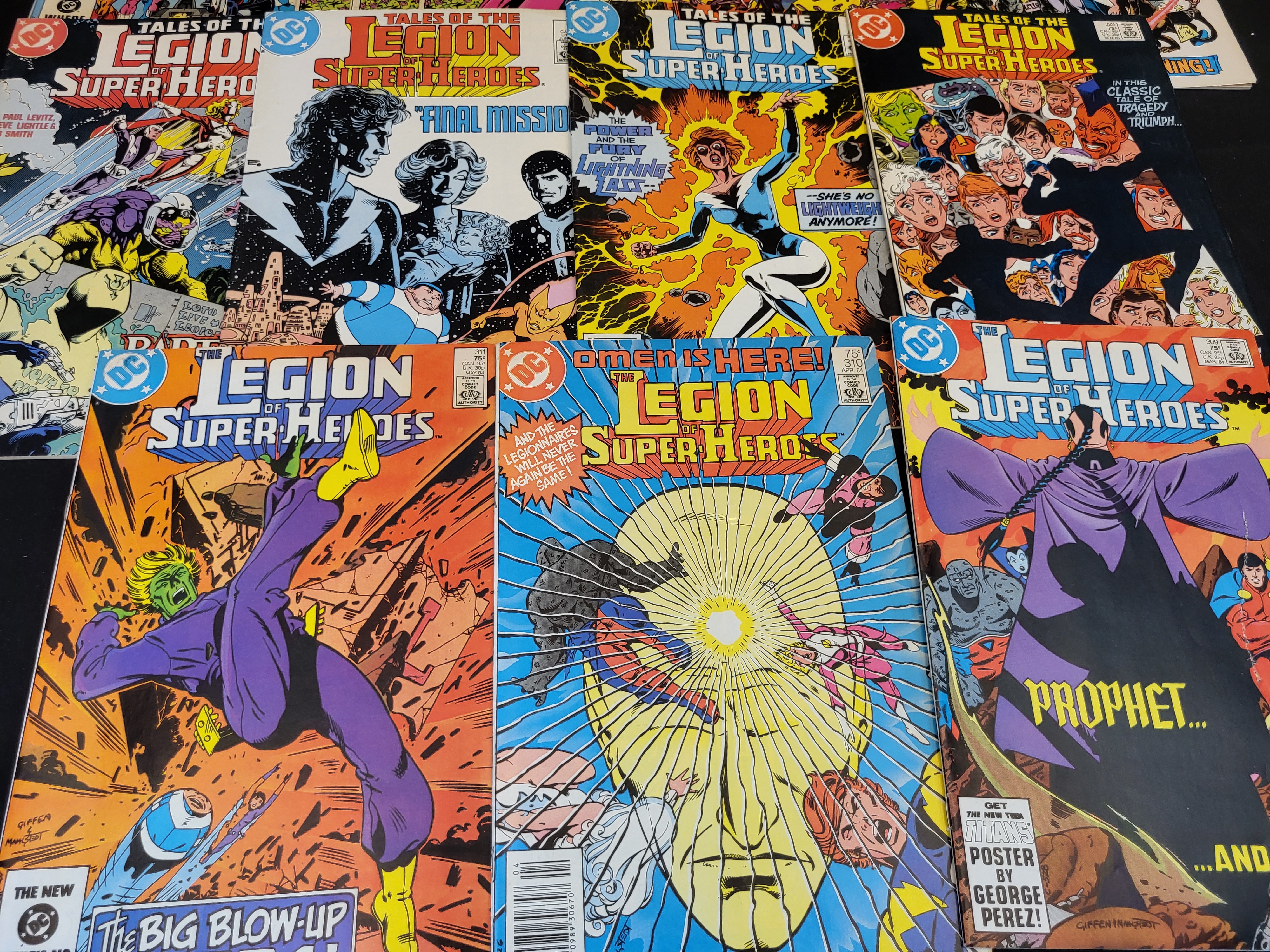 BID PER WHAT YOU SEE IN THE PHOTO, NOT THE AI GENERATED TITLES AND DESCRIPTIONS! A collection of vintage DC comic books from the Legion of Super-Heroes and Tales of the Legion of Super-Heroes series, dating from the early to mid-1980s. This group includes the 300th Anniversary Issue, issues 309, 310, and 311, as well as Annual 1 and Annual 2. The publications feature cover art and stories by creators George Perez, Keith Giffen, and Paul Levitz. Storylines represented in the collection include Final Mission and The Power and the Fury of Lightning Lass. Each issue is printed on standard comic stock and displays original price markings in both US cents and Canadian currency alongside the DC Comics brand logo.