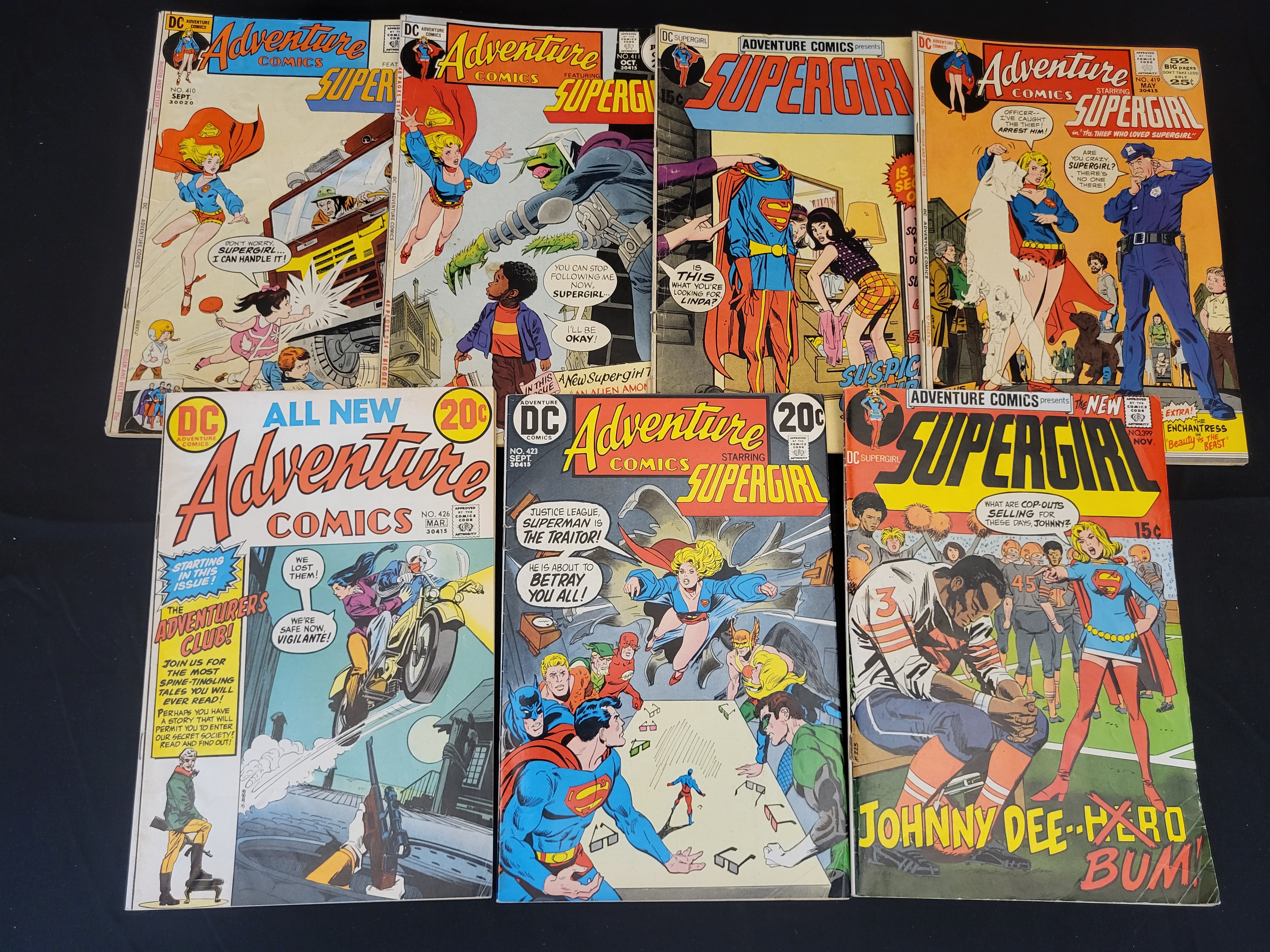 BID PER WHAT YOU SEE IN THE PHOTO, NOT THE AI GENERATED TITLES AND DESCRIPTIONS! This collection of DC Adventure Comics primarily dates from the early 1970s Bronze Age. The group consists of staple-bound paper comic books including issue numbers such as No. 399, 410, 411, 419, 423, and 426. The cover art features Supergirl in various scenarios, appearing alongside characters such as Superman, the Justice League, and Vigilante. Cover prices on these issues range from 15 to 25 cents. Visible publication months include March, May, August, September, October, and November.