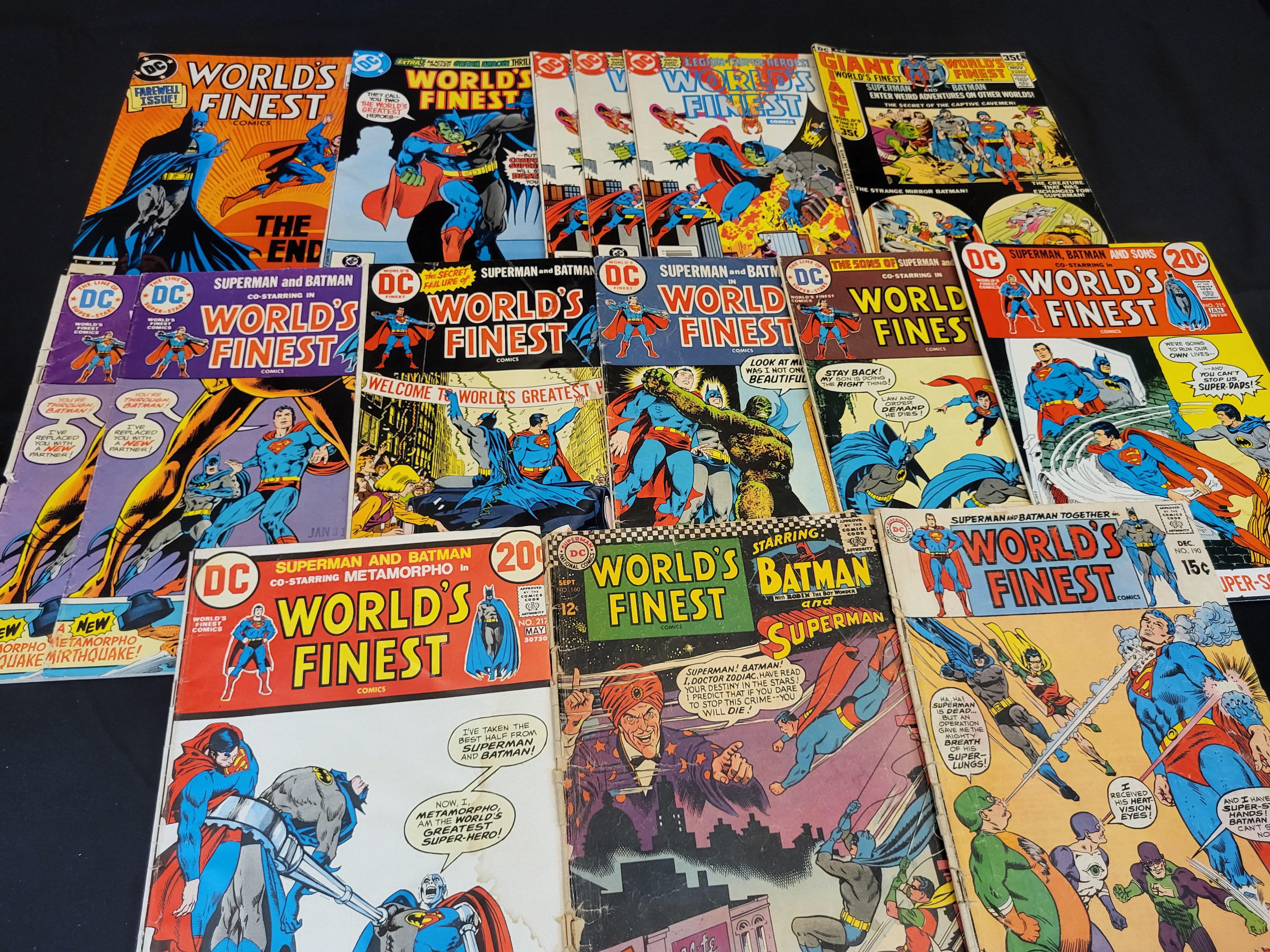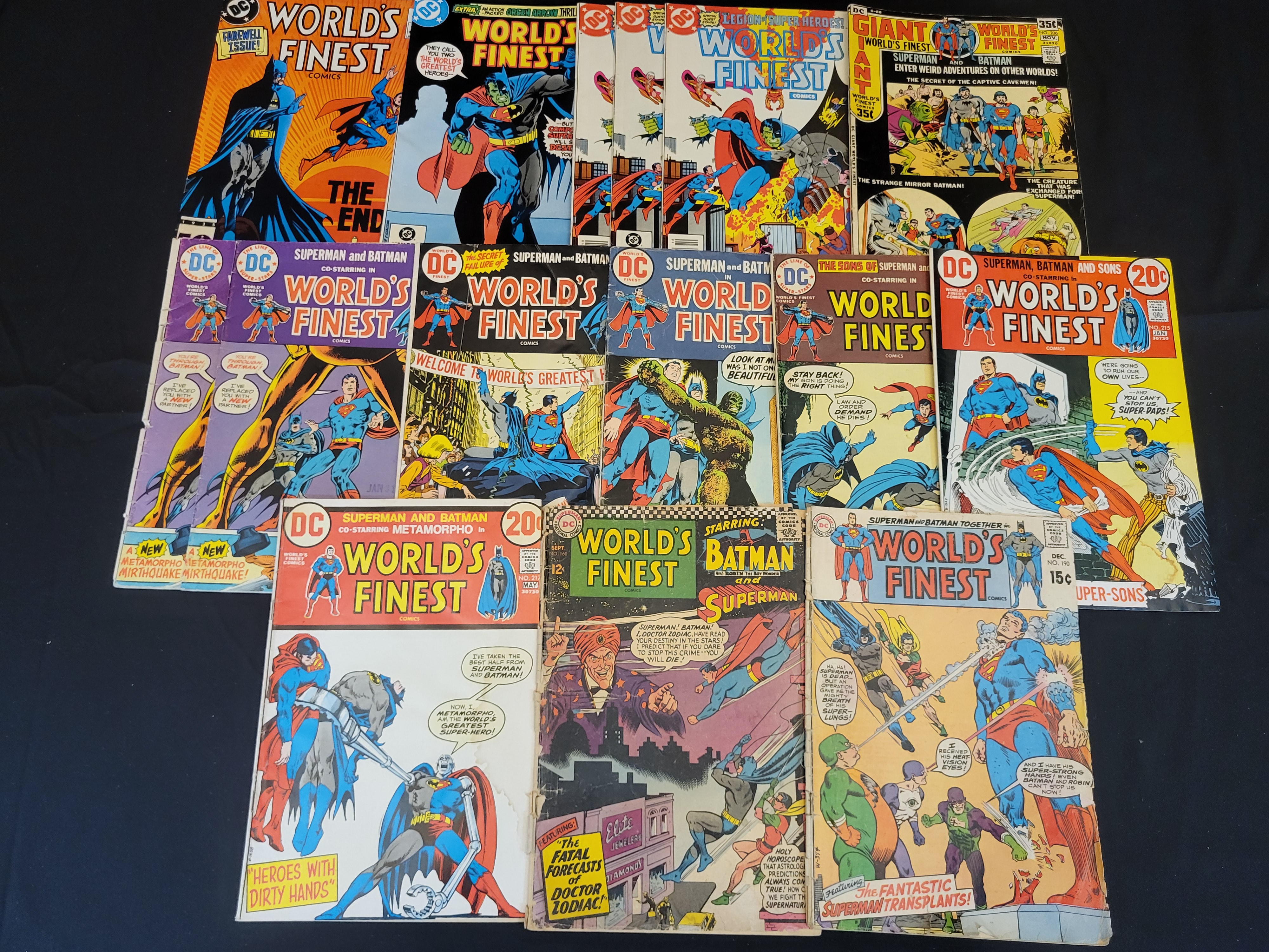 BID PER WHAT YOU SEE IN THE PHOTO, NOT THE AI GENERATED TITLES AND DESCRIPTIONS! A group of vintage DC Comics World’s Finest Comics featuring Superman and Batman. This assortment primarily includes issues from the late 1960s through the early 1980s. Notable issue numbers present include 160, 190, 215, and 217, with some duplicate copies included in the lot. The comics display various original cover prices such as $0.12, $0.15, $0.20, and $0.35. Each issue is constructed with standard newsprint pages and a staple-bound cover.