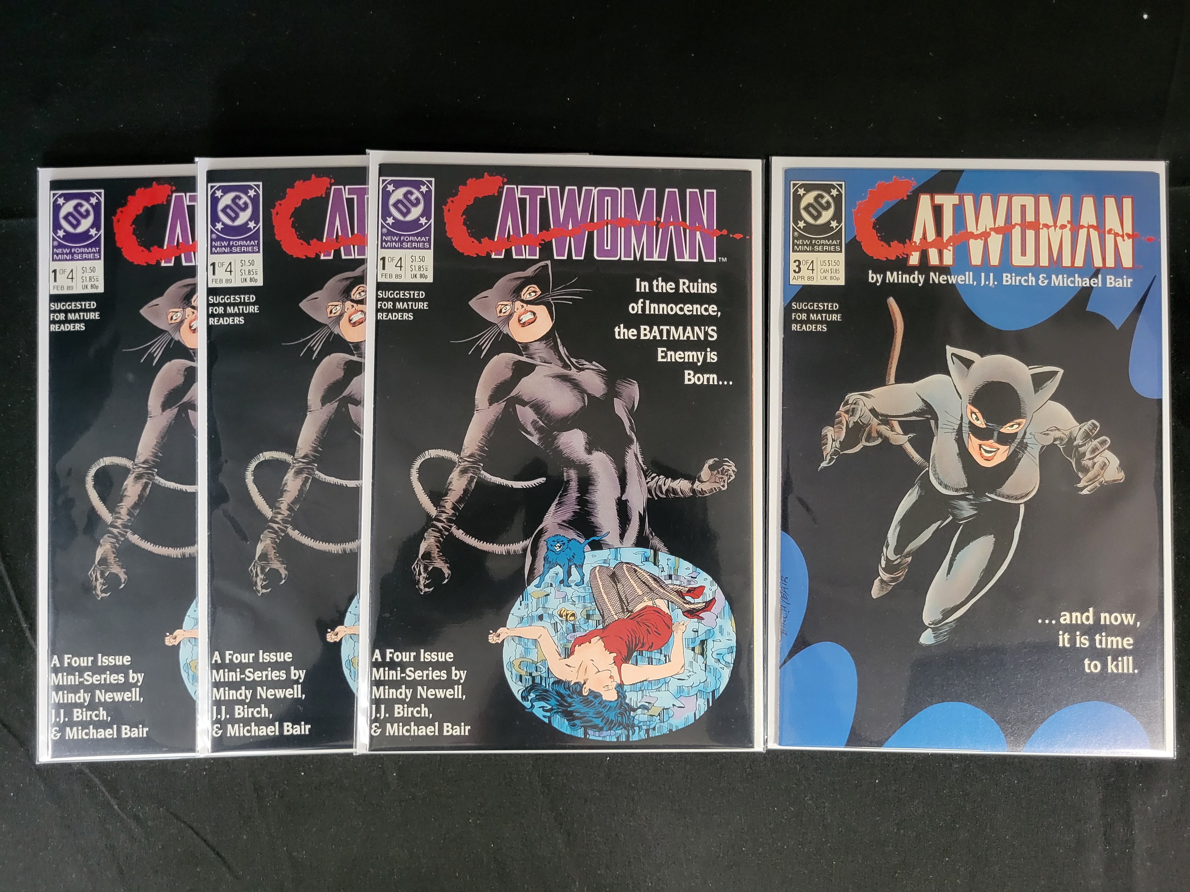 BID PER WHAT YOU SEE IN THE PHOTO, NOT THE AI GENERATED TITLES AND DESCRIPTIONS! A group of DC Comics Catwoman four-issue mini-series comic books published in 1989. The collection includes multiple copies of issue number 1 dated February 1989 and issue number 3 dated April 1989. These issues feature the New Format Mini-Series designation and a Suggested for Mature Readers advisory. The series is written by Mindy Newell with artwork by J.J. Birch and Michael Bair. The cover of issue number 1 carries the tagline In the Ruins of Innocence, the BATMAN’S Enemy is Born… and issue number 3 features the tagline …and now, it is time to kill. The character is depicted in a black costume on the covers. Each comic book is stored in a protective plastic sleeve.