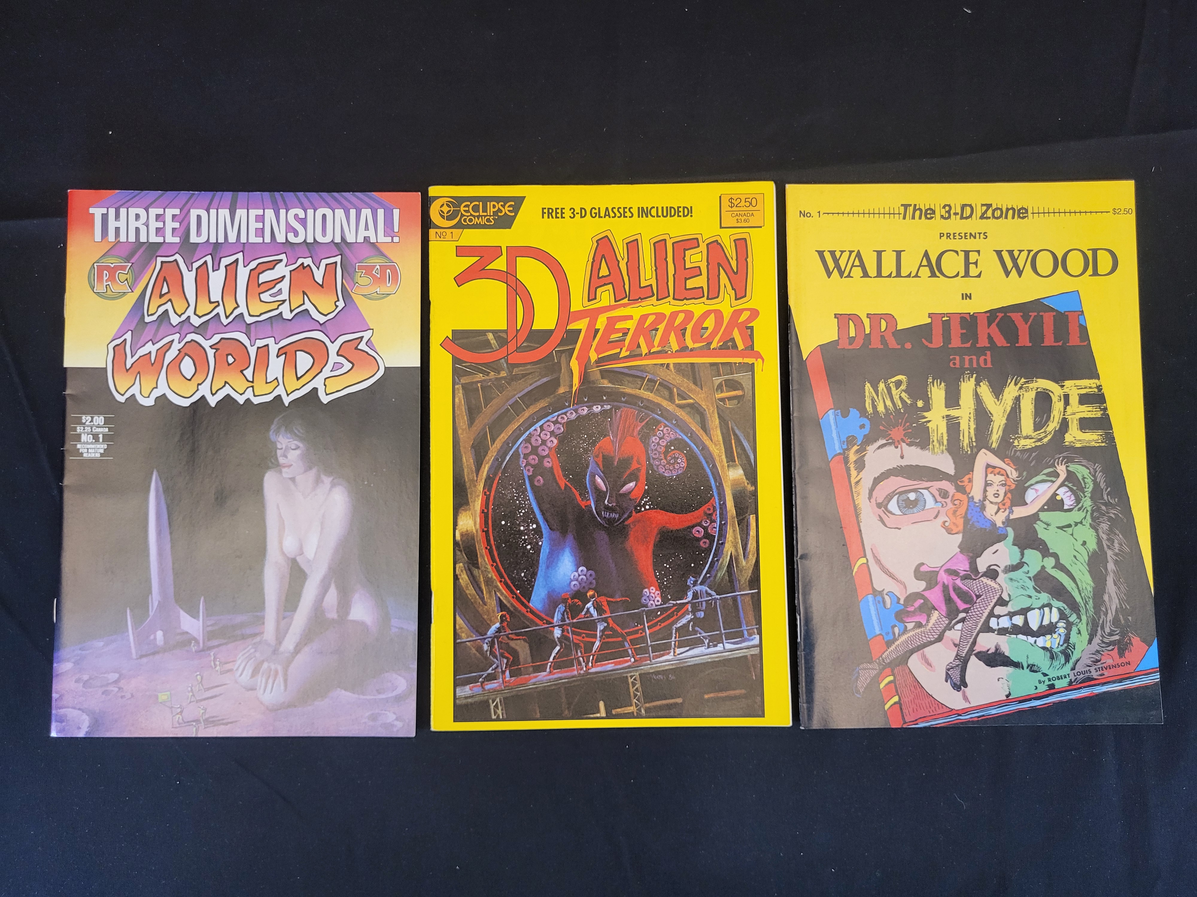 BID PER WHAT YOU SEE IN THE PHOTO, NOT THE AI GENERATED TITLES AND DESCRIPTIONS! A trio of independent 3D comic books published in the 1980s. The group includes 3-D Alien Terror No. 1 published by Eclipse Comics, featuring work by Bruce Jones and originally issued with 3D glasses. Also included are Alien Worlds 3-D No. 1 published by Pacific Comics and The 3-D Zone presents Wallace Wood in Dr. Jekyll and Mr. Hyde No. 1. These publications are staple-bound with color illustrated covers. The back covers feature advertisements for Twisted Tales, Eclipse promotional buttons, and Zonevision.