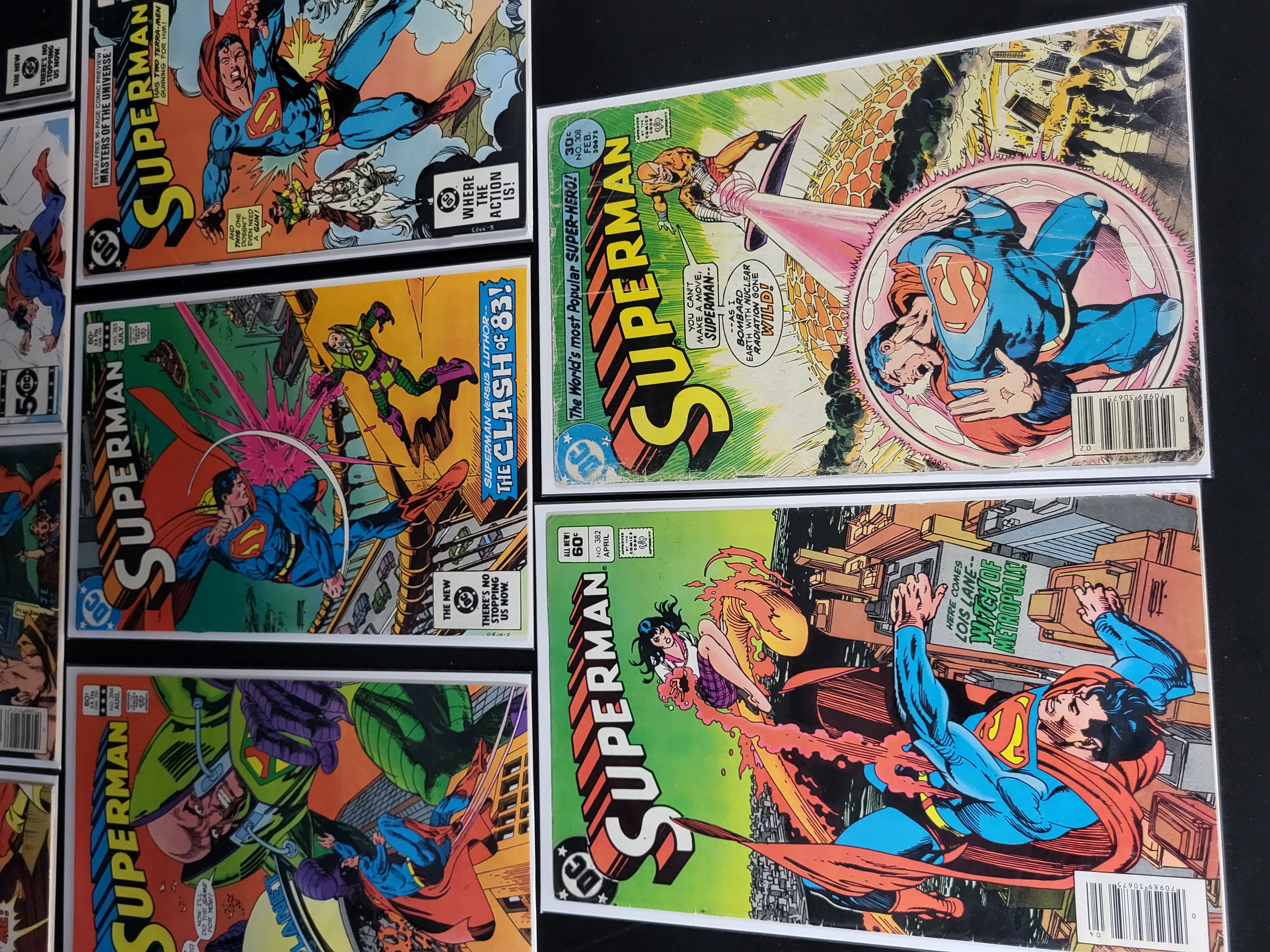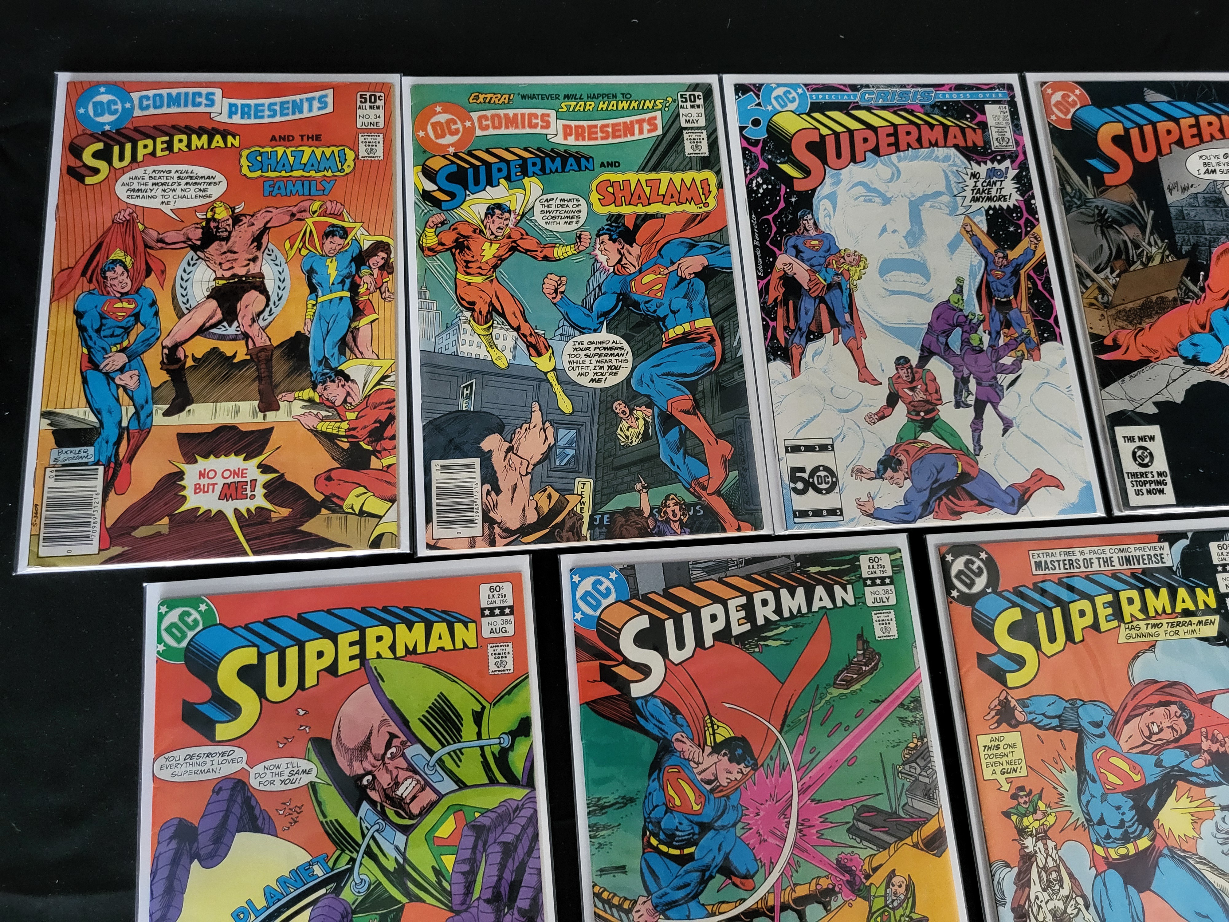 BID PER WHAT YOU SEE IN THE PHOTO, NOT THE AI GENERATED TITLES AND DESCRIPTIONS! This collection consists of several vintage DC comic books primarily featuring Superman, dating from the late 1970s through the mid-1980s. The group includes multiple issues from the Superman Vol. 1 series, specifically numbers 308, 377, 382, 385, 386, 402, and 414. Notable content within these issues includes a Masters of the Universe preview in issue 377 and a Crisis on Infinite Earths crossover in issue 414. The collection also features DC Comics Presents issues 33 and 34, which depict team-ups with Shazam! and the Shazam Family. Each book is individually stored in a clear protective sleeve with a white backing board. The publications feature standard newsprint interiors with multi-color illustrated covers characteristic of the Bronze and early Modern Age of comics.