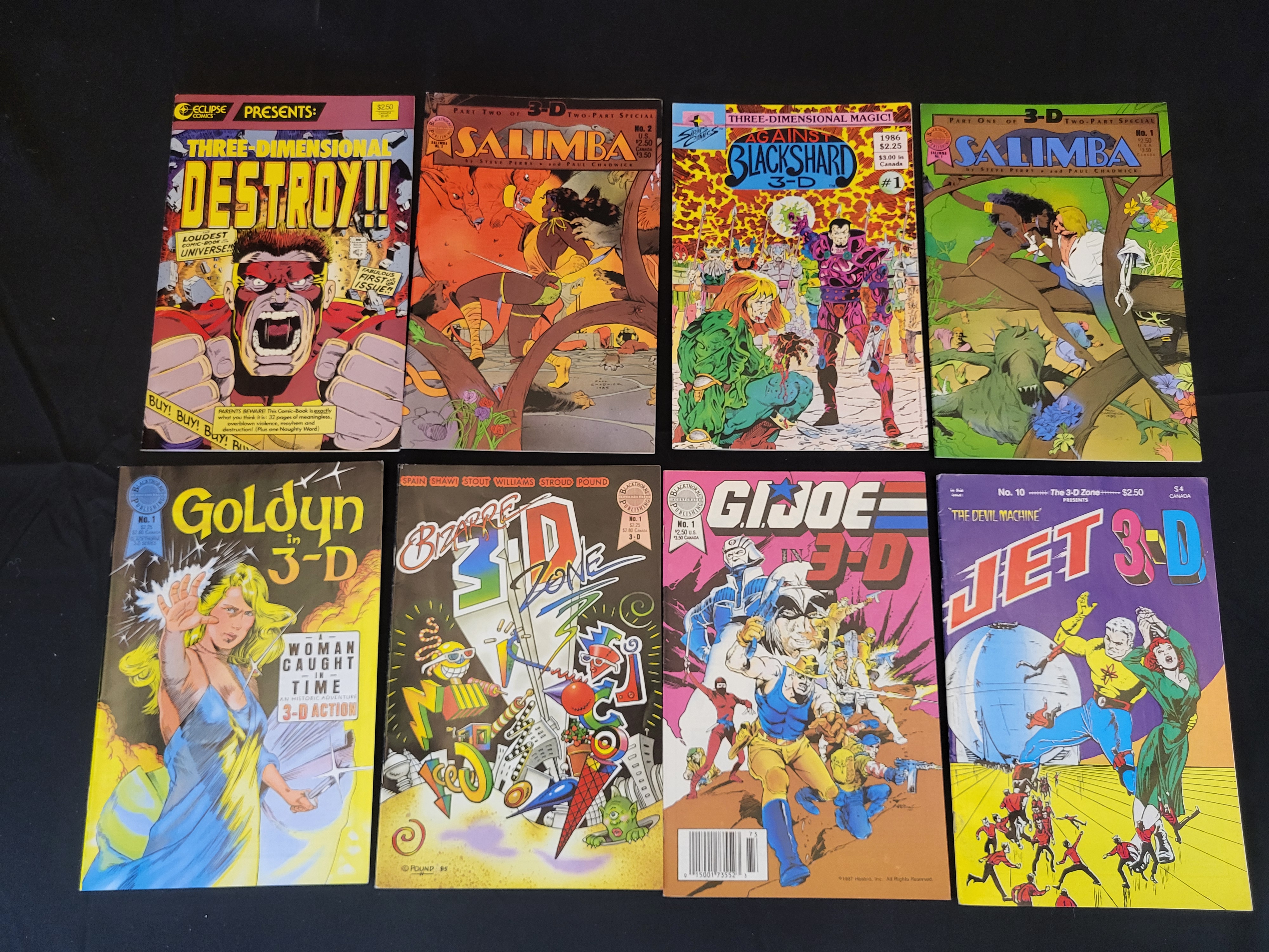 BID PER WHAT YOU SEE IN THE PHOTO, NOT THE AI GENERATED TITLES AND DESCRIPTIONS! This group of independent 3-D comic books from the late 1980s includes publications from Blackthorne Publishing, Eclipse Comics, and Renegade Press. The assortment features various titles including Three-Dimensional Destroy!!, Salimba, Against Blackshard 3-D, Goldyn in 3-D, Bizarre 3-D Zone, G.I. Joe in 3-D, and Jet 3-D. These volumes are produced using anaglyph 3-D printing techniques. Internal inspection confirms that the original red and blue 3-D glasses remain attached and intact within several of the issues. The books feature vibrant cover illustrations and interior pages designed for stereoscopic viewing.