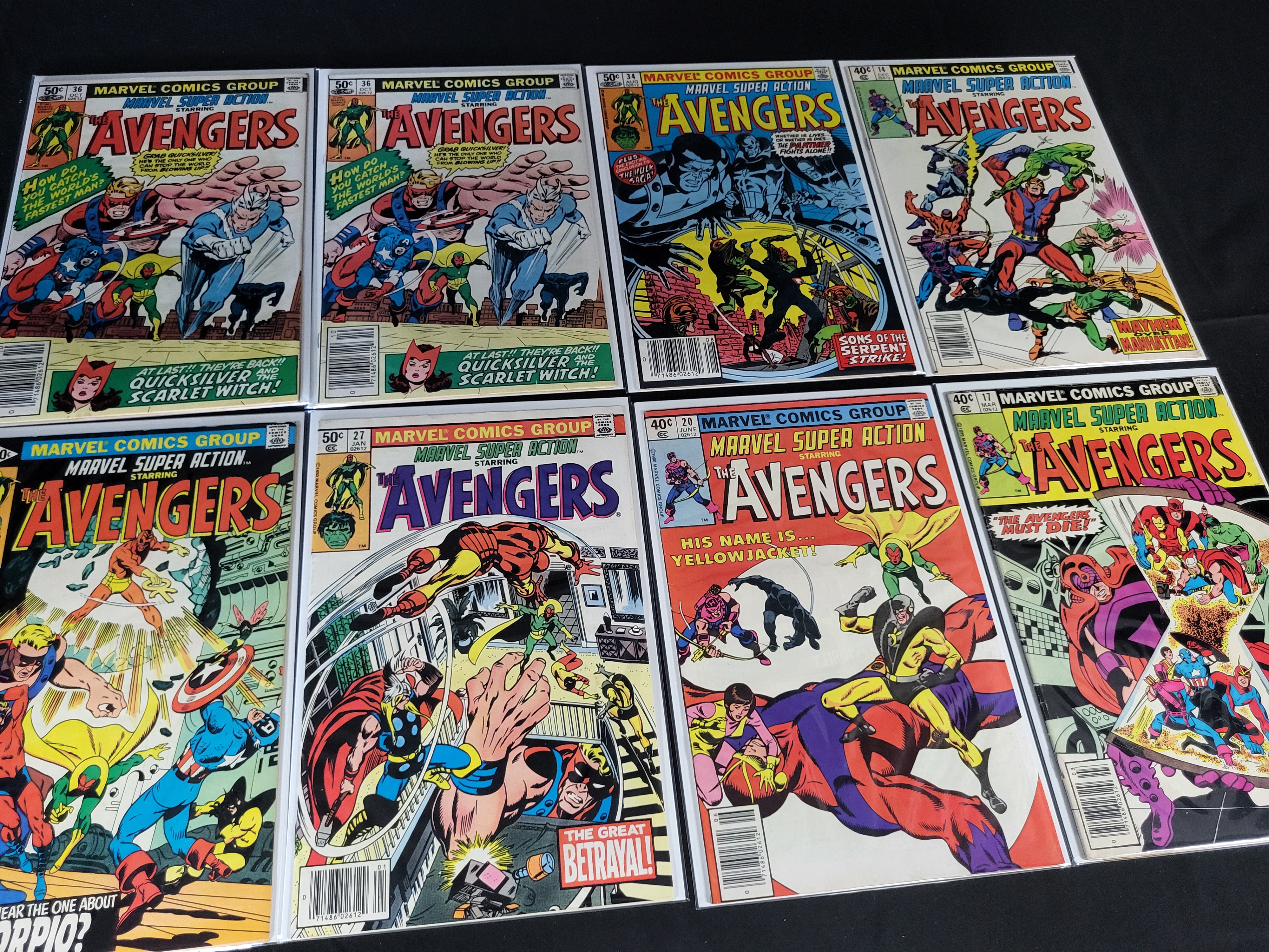 BID PER WHAT YOU SEE IN THE PHOTO, NOT THE AI GENERATED TITLES AND DESCRIPTIONS! A group of Marvel Super Action comic books published by the Marvel Comics Group during the late 1970s and early 1980s. This series features stories starring The Avengers. The group includes various issues such as numbers 14, 17, 20, 27, 33, 34, and 36. Each publication features color cover illustrations depicting characters such as Captain America, Iron Man, Thor, and the Scarlet Witch. Original cover prices are 40 cents and 50 cents. The books are printed on standard paper stock with staple bindings and are individually stored in protective plastic sleeves with backing boards.