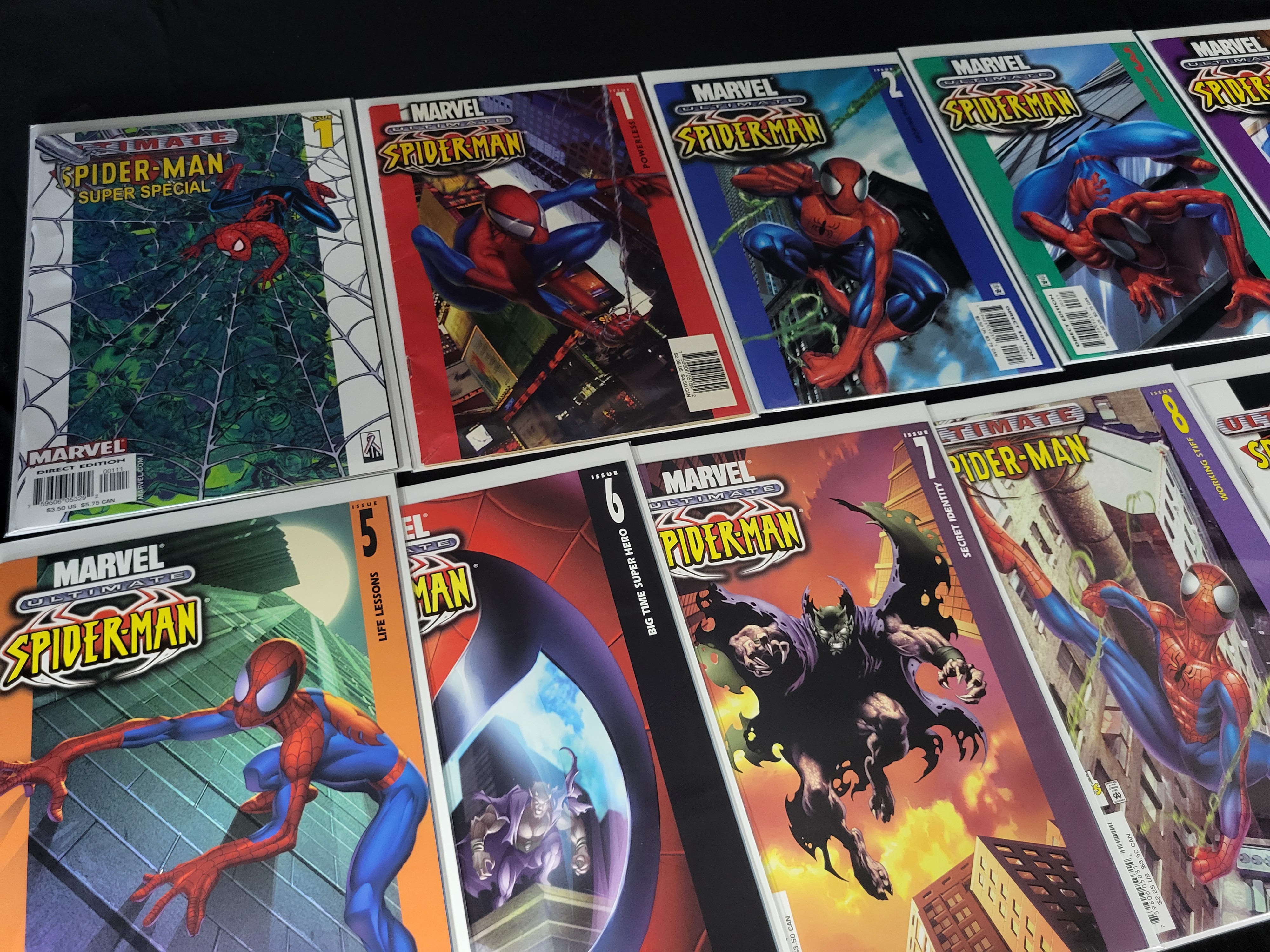 BID PER WHAT YOU SEE IN THE PHOTO, NOT THE AI GENERATED TITLES AND DESCRIPTIONS! This collection of Marvel Comics Ultimate Spider-Man comic books consists of issues from the series published in the early 2000s. The group includes consecutive issues 1 through 10 and the Ultimate Spider-Man Super Special 1. The series features writing by Brian Michael Bendis and illustrations by Mark Bagley and Art Thibert. Cover subtitles include Powerless, Growing Pains, With Great Power, Life Lessons, Big Time Super Hero, Secret Identity, Working Stiff, Meet the Enforcers, and The Worst Thing. All issues are direct editions and are presented in individual protective plastic sleeves with backing boards.