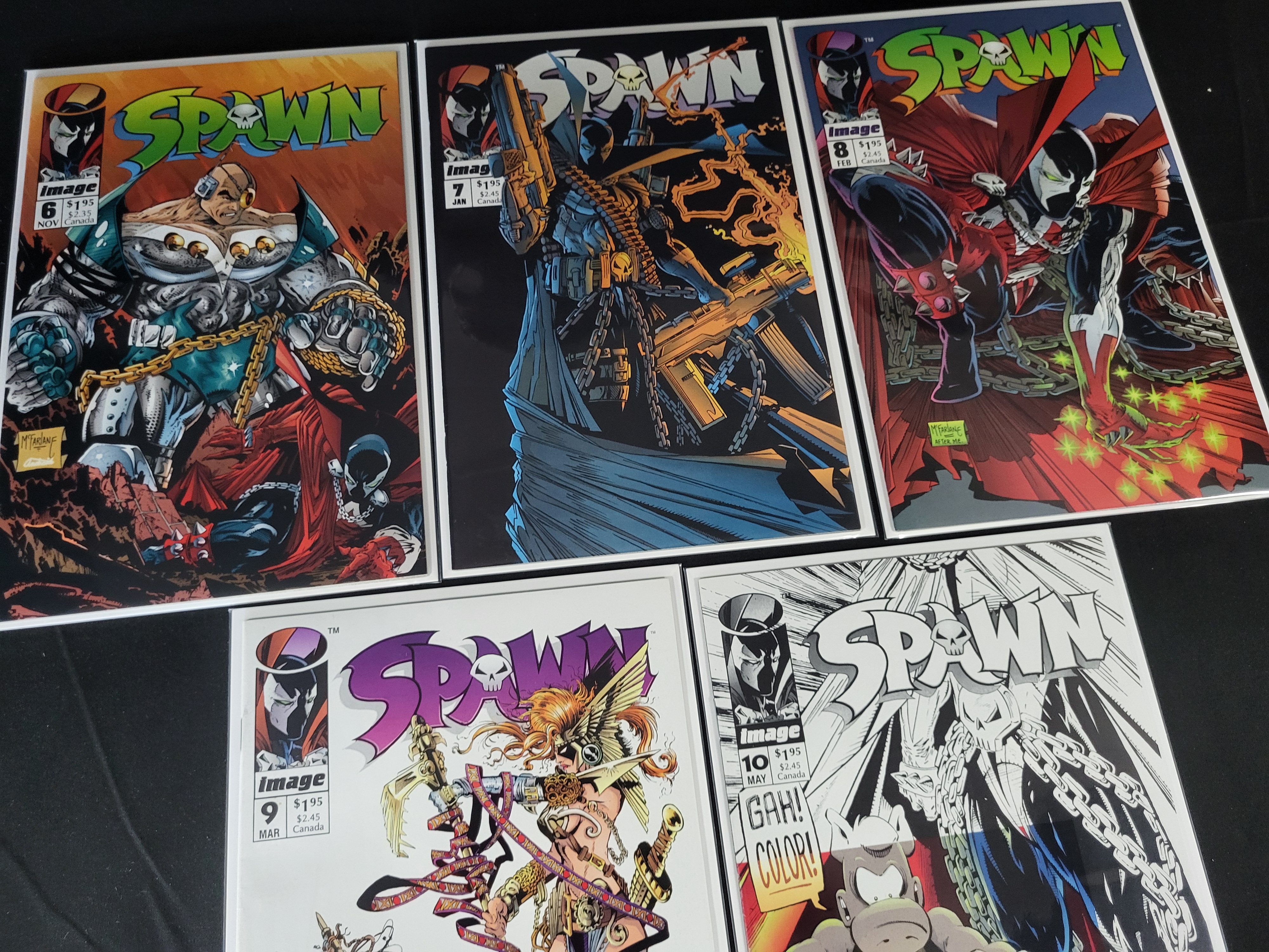 BID PER WHAT YOU SEE IN THE PHOTO, NOT THE AI GENERATED TITLES AND DESCRIPTIONS! This collection of Image Comics Spawn comic books features issues from the early 1990s. The group includes consecutive issues from number 6 through 10. Each issue features cover artwork by creator Todd McFarlane. Notable inclusions are issue number 9, which marks the first appearance of the character Angela, and issue number 10, featuring a guest appearance by Cerebus the Aardvark. The comics are printed on paper with full-color covers and are housed in individual clear plastic protective sleeves with white backing boards. Visible publication months include November, January, February, March, and May. Original retail prices of $1.95 US and $2.45 Canada are printed on the covers.