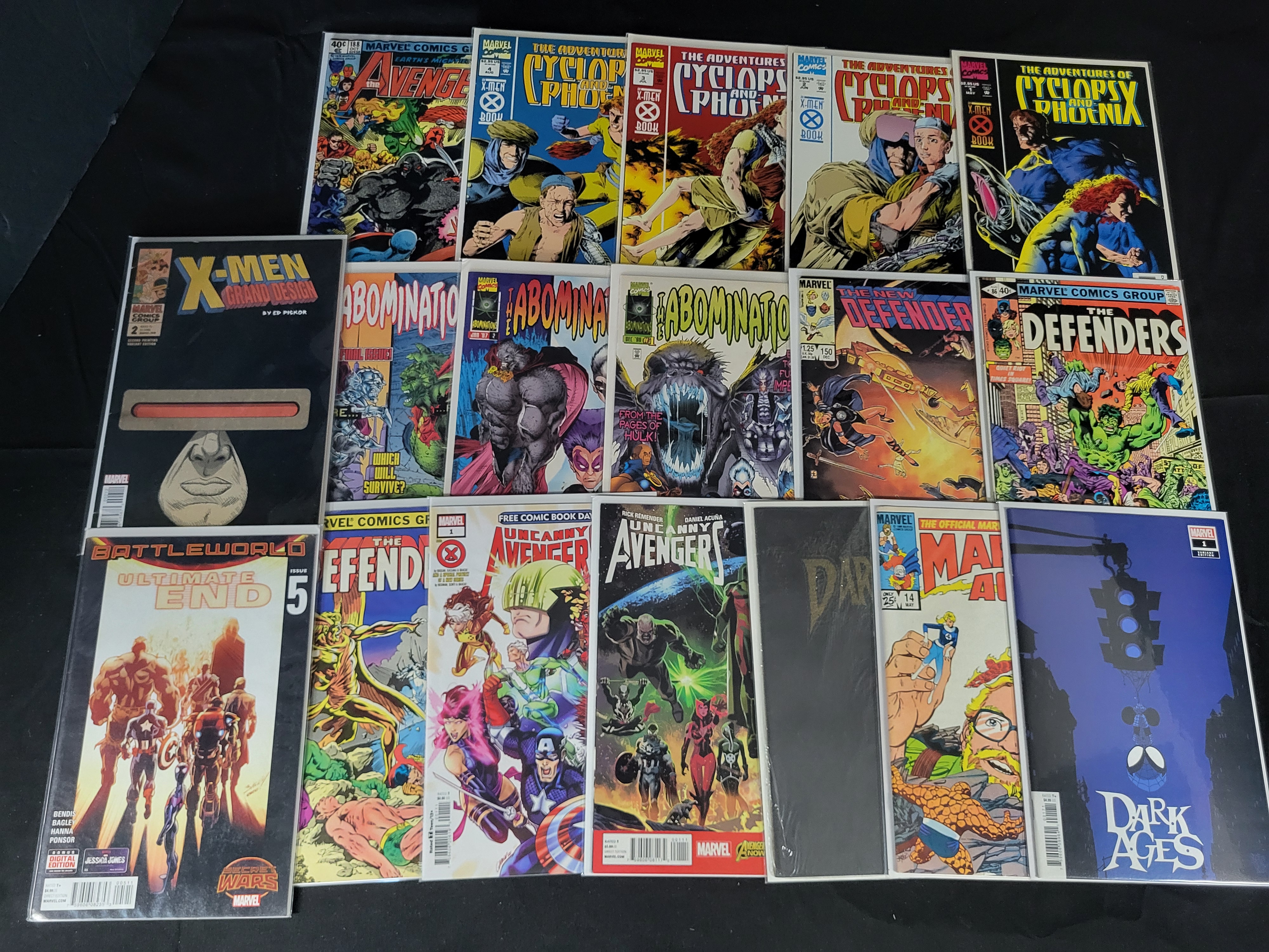 BID PER WHAT YOU SEE IN THE PHOTO, NOT THE AI GENERATED TITLES AND DESCRIPTIONS! A collection of vintage and modern Marvel comic books featuring various titles and series from the late 20th and early 21st centuries. The group includes issues 1 through 4 of The Adventures of Cyclops and Phoenix, X-Men Grand Design by Ed Piskor, and several issues of The Defenders and The New Defenders. Also present is the Abominations limited series, The Avengers, The Uncanny Avengers, Battleworld: Ultimate End issue 5, Dark Ages issue 1, and The Official Marvel Index to the Marvel Universe. The comics are printed on standard paper stock with various cover art styles ranging from traditional hand-drawn illustrations to contemporary digital designs. Most items are housed in individual protective plastic sleeves with cardstock backing boards.