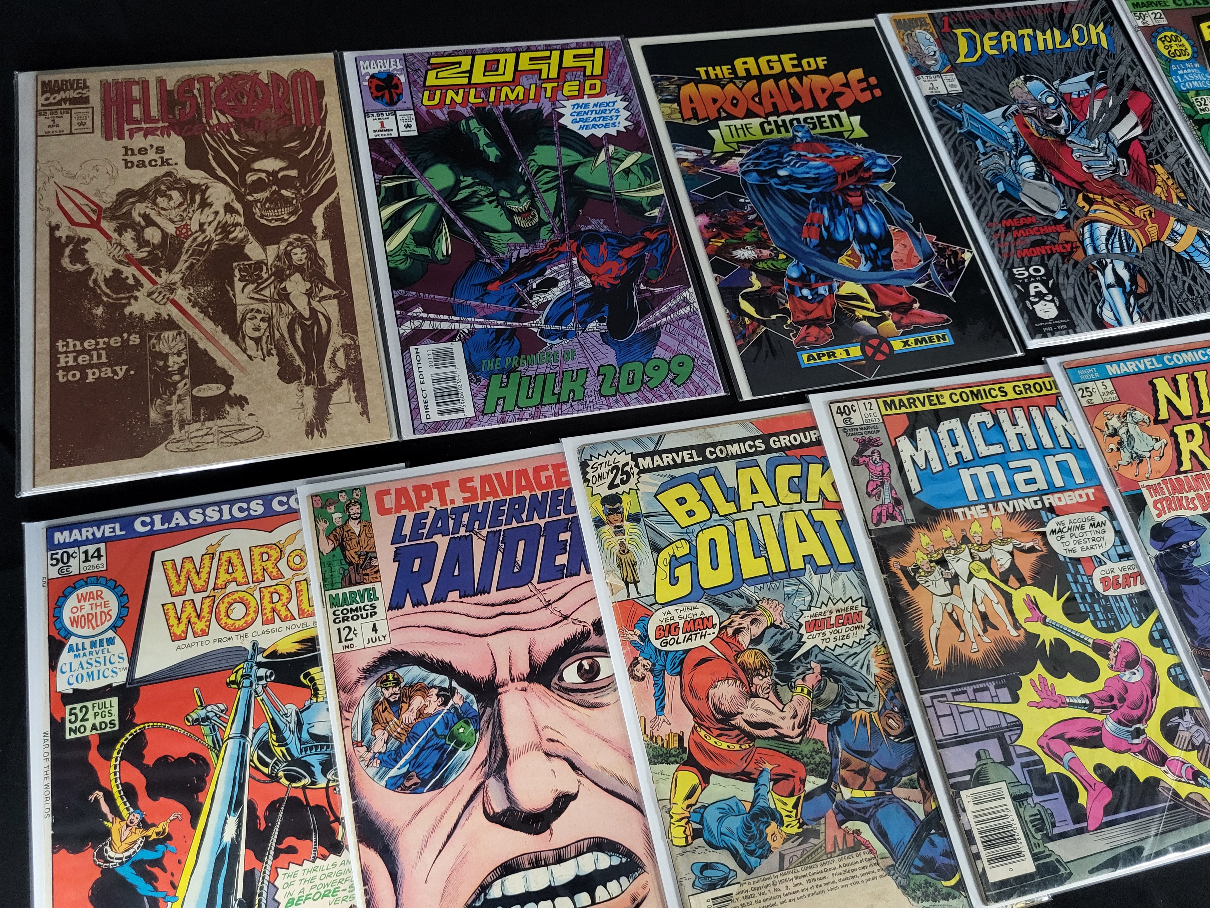 BID PER WHAT YOU SEE IN THE PHOTO, NOT THE AI GENERATED TITLES AND DESCRIPTIONS! A collection of Marvel comic books spanning various genres and eras, including Silver, Bronze, and Modern Age publications. Notable titles within the group include The Infinity Gauntlet #1 and #6, Black Goliath #1, Deathlok #1, 2099 Unlimited #1, and several issues from the Longshot and Warlock and the Infinity Watch limited series. The collection also features titles such as Marvel Classics Comics (Food of the Gods, War of the Worlds), Capt. Savage and His Leatherneck Raiders, Machine Man, Night Rider, Hellstorm, and the Marvel Holiday Special #1. The items are primarily presented in protective plastic sleeves with backing boards. The comics feature standard publisher markings, including logos, issue numbers, and price points.
