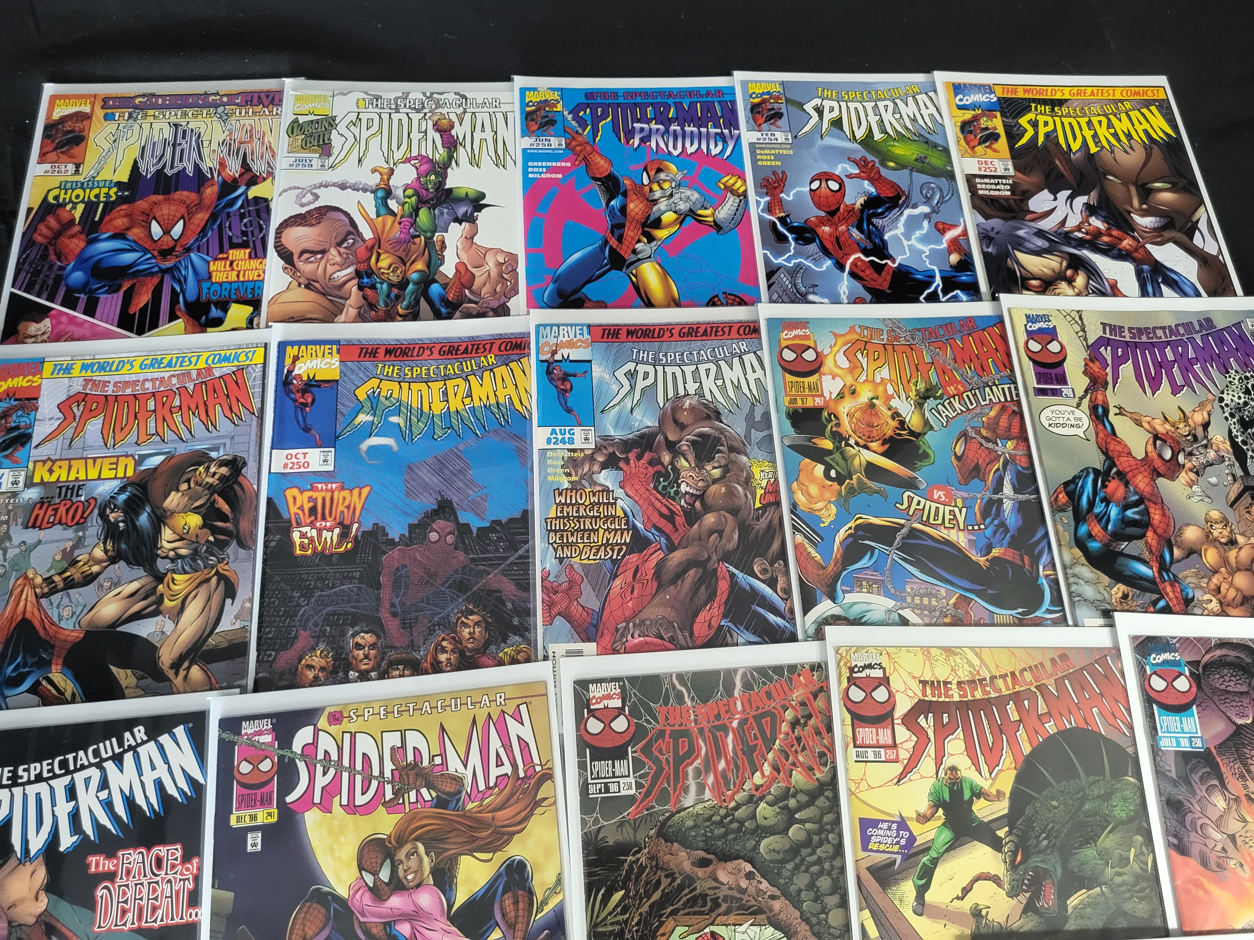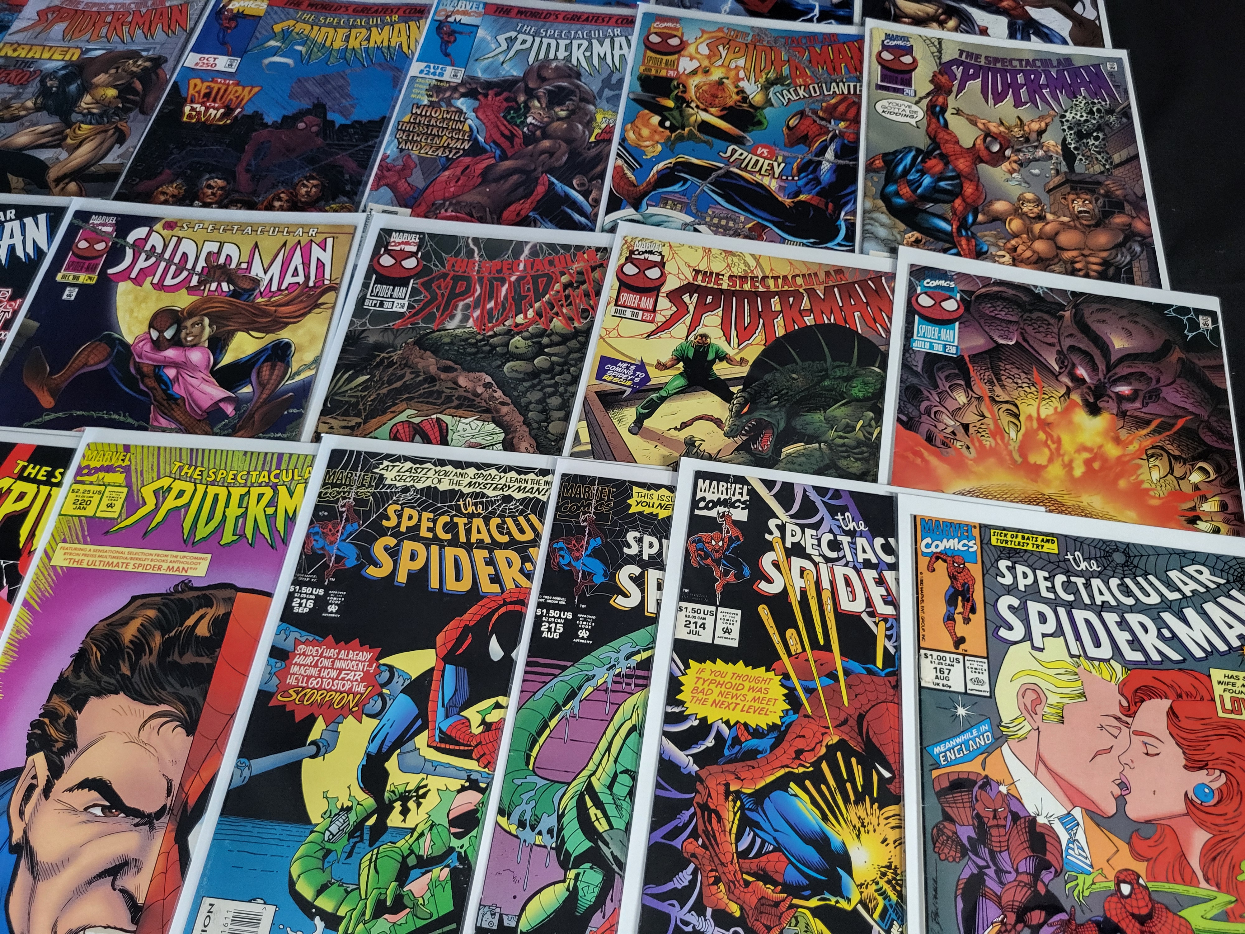BID PER WHAT YOU SEE IN THE PHOTO, NOT THE AI GENERATED TITLES AND DESCRIPTIONS! A collection of Marvel Comics featuring The Spectacular Spider-Man series. The group includes various issues published between the late 1980s and late 1990s. Visible issue numbers include 167, 214, 215, 216, 220, 223, 228, 234, 236, 237, 238, 241, 242, 246, 247, 248, 250, 251, 252, 254, 256, 259, and 262. The lot contains a mix of direct edition and newsstand copies. Each comic is individually housed in a clear protective plastic sleeve with a white backing board. Cover art features various characters and antagonists including Kraven the Hunter, Green Goblin, Jack O’Lantern, Scorpion, and the Lizard. Credits on covers include artists and writers such as DeMatteis, Buscema, Ross, and Milgrom.