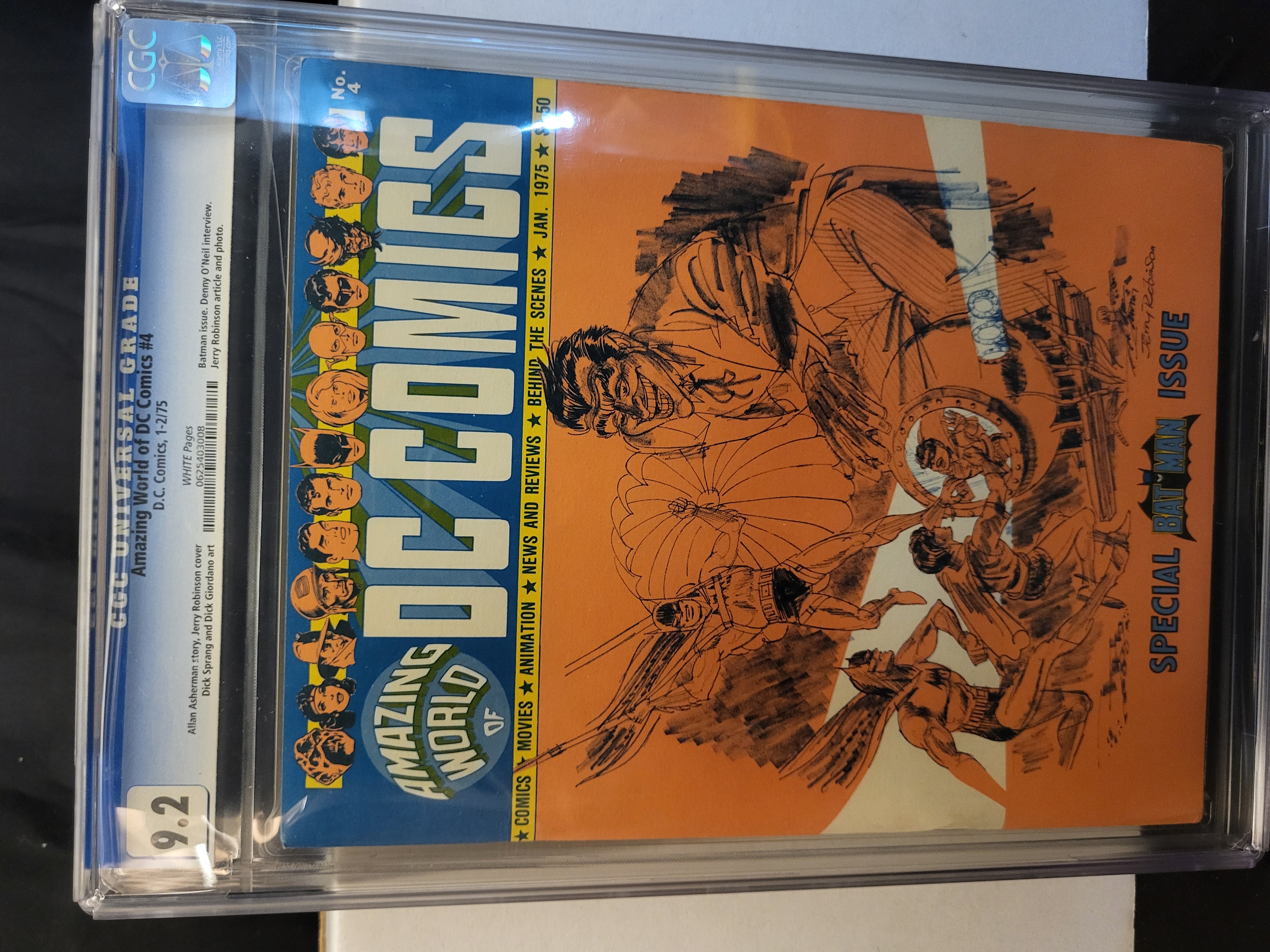 BID PER WHAT YOU SEE IN THE PHOTO, NOT THE AI GENERATED TITLES AND DESCRIPTIONS! This CGC-graded copy of Amazing World of DC Comics No. 4 was published by D.C. Comics in January 1975. Designated as a Special Batman Issue, the publication contains news, reviews, and behind-the-scenes content. Notable artistic contributions include work by Jerry Robinson, Dick Sprang, and Dick Giordano, alongside an interview with Denny O’Neil. The front cover features a stylized sketch of Batman and Robin set against an orange ground. The reverse cover displays a full-page color illustration of Catwoman by Frank Robbins. This specimen has been assigned a CGC Universal Grade of 9.2 with white pages noted on the certification label.