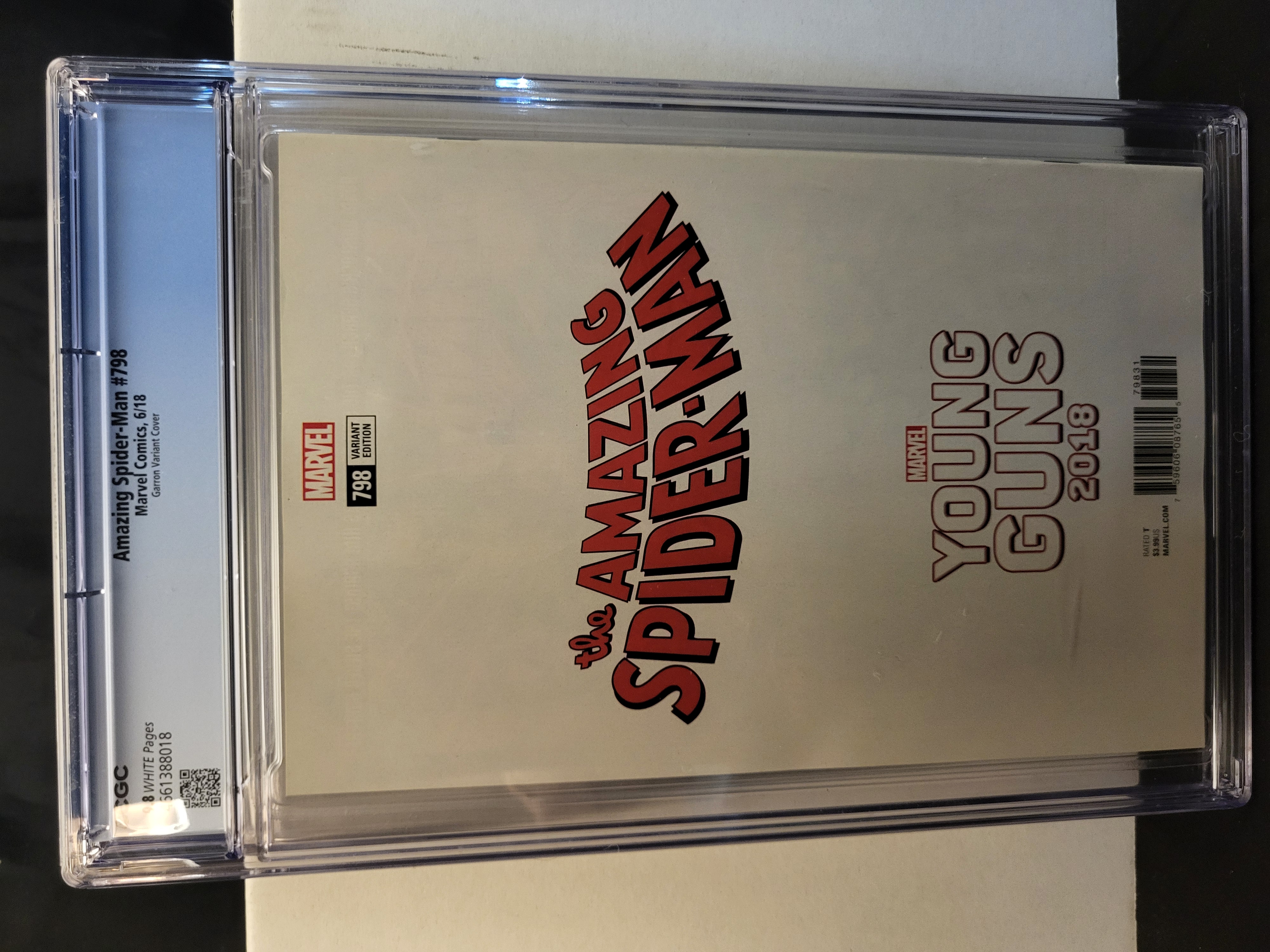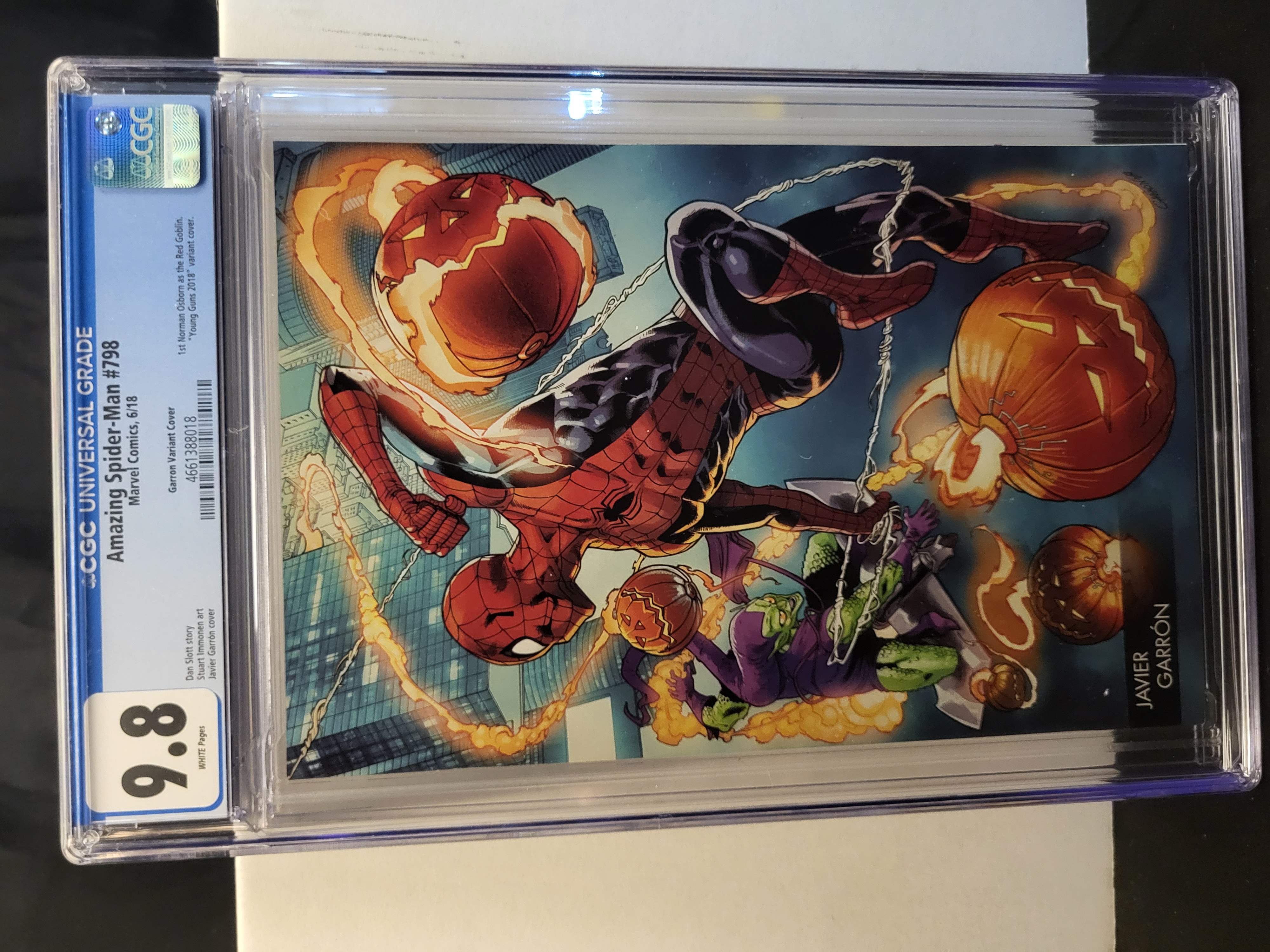 BID PER WHAT YOU SEE IN THE PHOTO, NOT THE AI GENERATED TITLES AND DESCRIPTIONS! Marvel Comics Amazing Spider-Man #798, published June 2018. This issue features the first appearance of Norman Osborn as the Red Goblin. The story is written by Dan Slott with interior art by Stuart Immonen. This copy is the Young Guns 2018 variant, featuring a wraparound cover illustration by Javier Garron. The comic book is professionally graded and encapsulated by the Certified Guaranty Company (CGC) with a Universal Grade of 9.8 and White Pages. Certification number 4661388018 is present on the blue header label. The item is housed in a clear plastic protective slab.