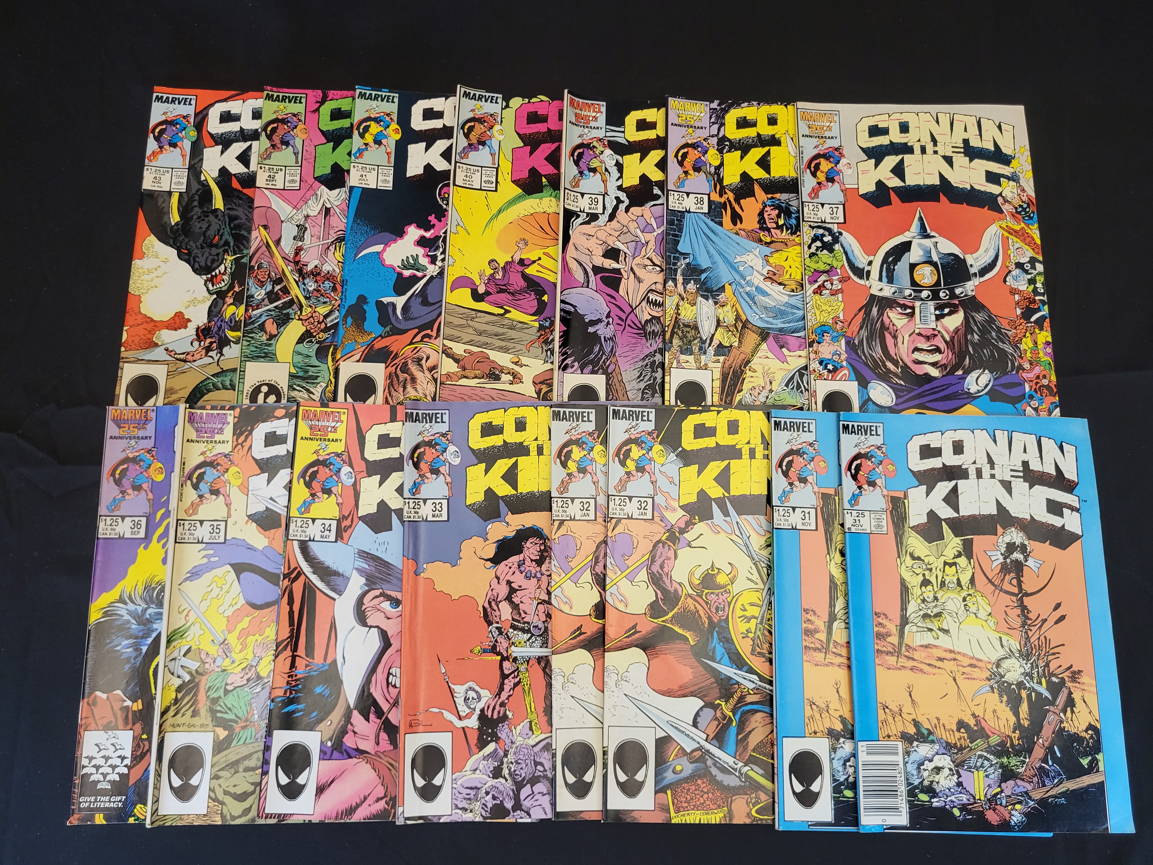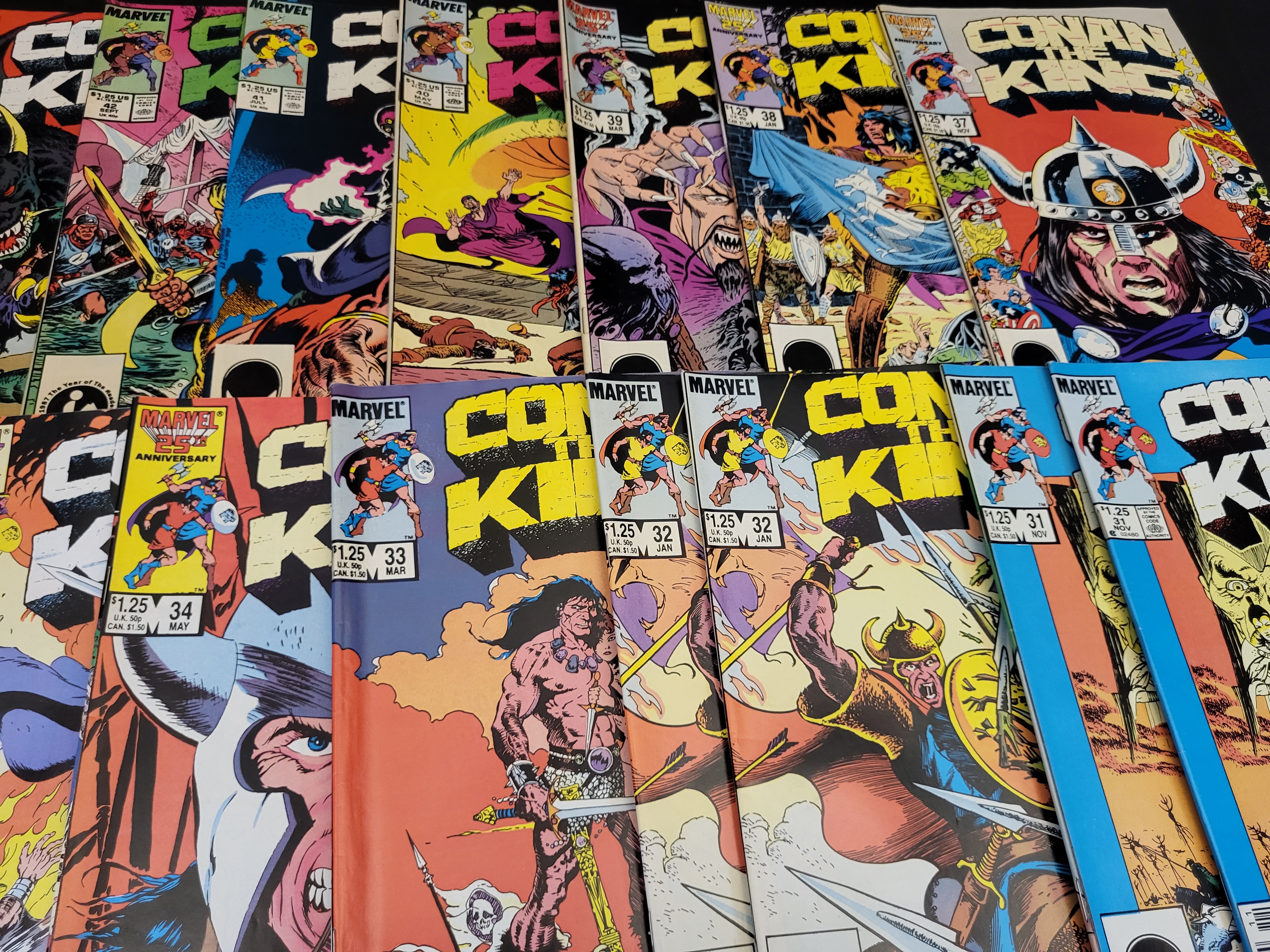 BID PER WHAT YOU SEE IN THE PHOTO, NOT THE AI GENERATED TITLES AND DESCRIPTIONS! This collection features an assortment of Conan the King comic books published by Marvel Comics during the mid-1980s. The group includes various issues ranging from number 31 through 43, with multiple duplicate copies present. Several issues feature the Marvel 25th Anniversary cover logo. The covers display action-oriented fantasy illustrations characteristic of the series. The books are standard comic book format with staple binding and color-printed covers.
