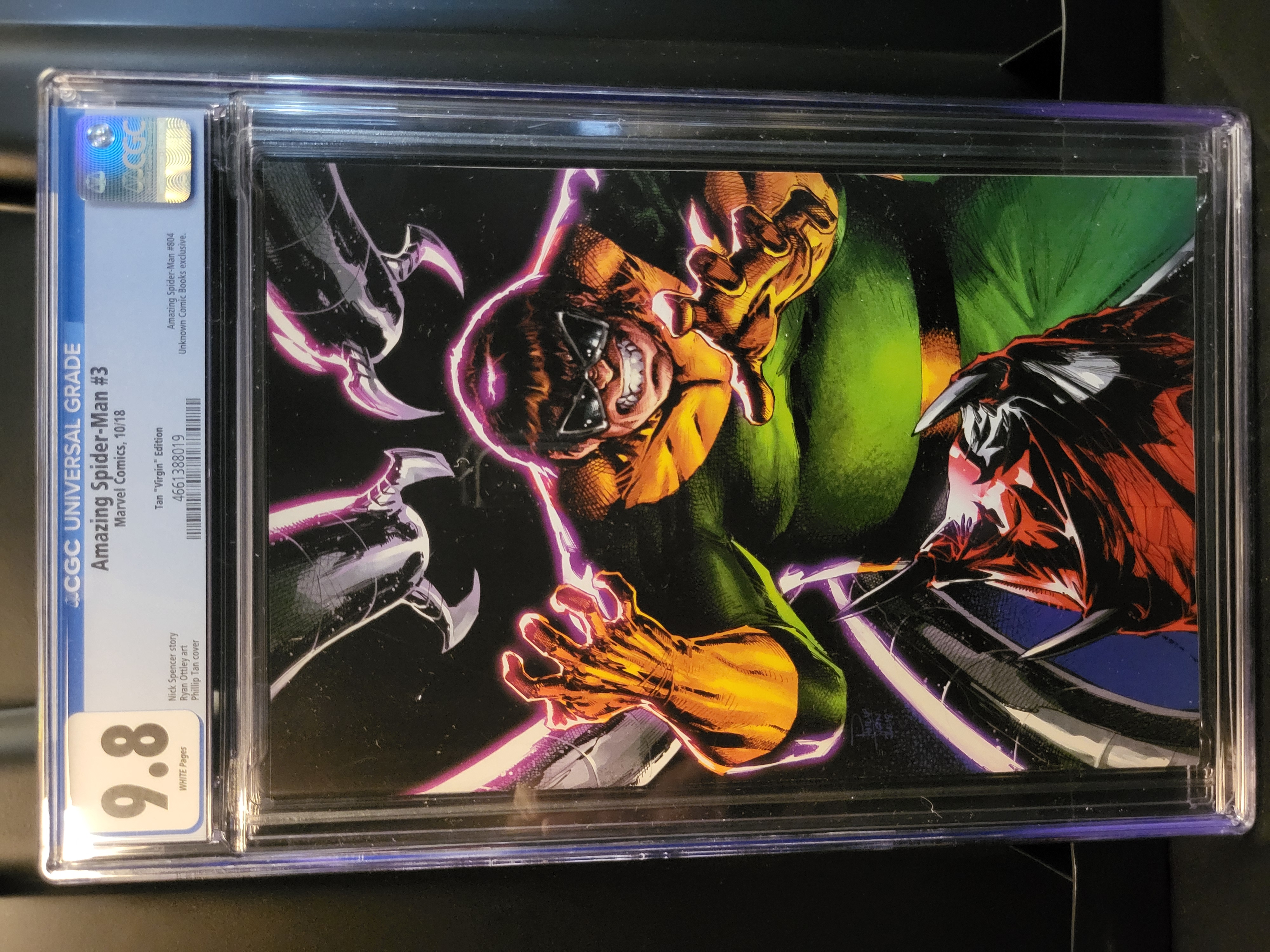 BID PER WHAT YOU SEE IN THE PHOTO, NOT THE AI GENERATED TITLES AND DESCRIPTIONS! The Amazing Spider-Man #3 (Legacy #804), published by Marvel Comics in October 2018. This issue is the Phillip Tan Virgin variant edition, featuring a cover illustration of Doctor Octopus. The publication includes a story by Nick Spencer and interior art by Ryan Ottley. This variant was produced as an exclusive for UnknownComicBooks.com. The comic has been professionally graded by the Certified Guaranty Company (CGC) and is housed in a sealed plastic holder. The grading label specifies a Universal Grade of 9.8 and notes the presence of white pages. The CGC certification number is 4661388019.