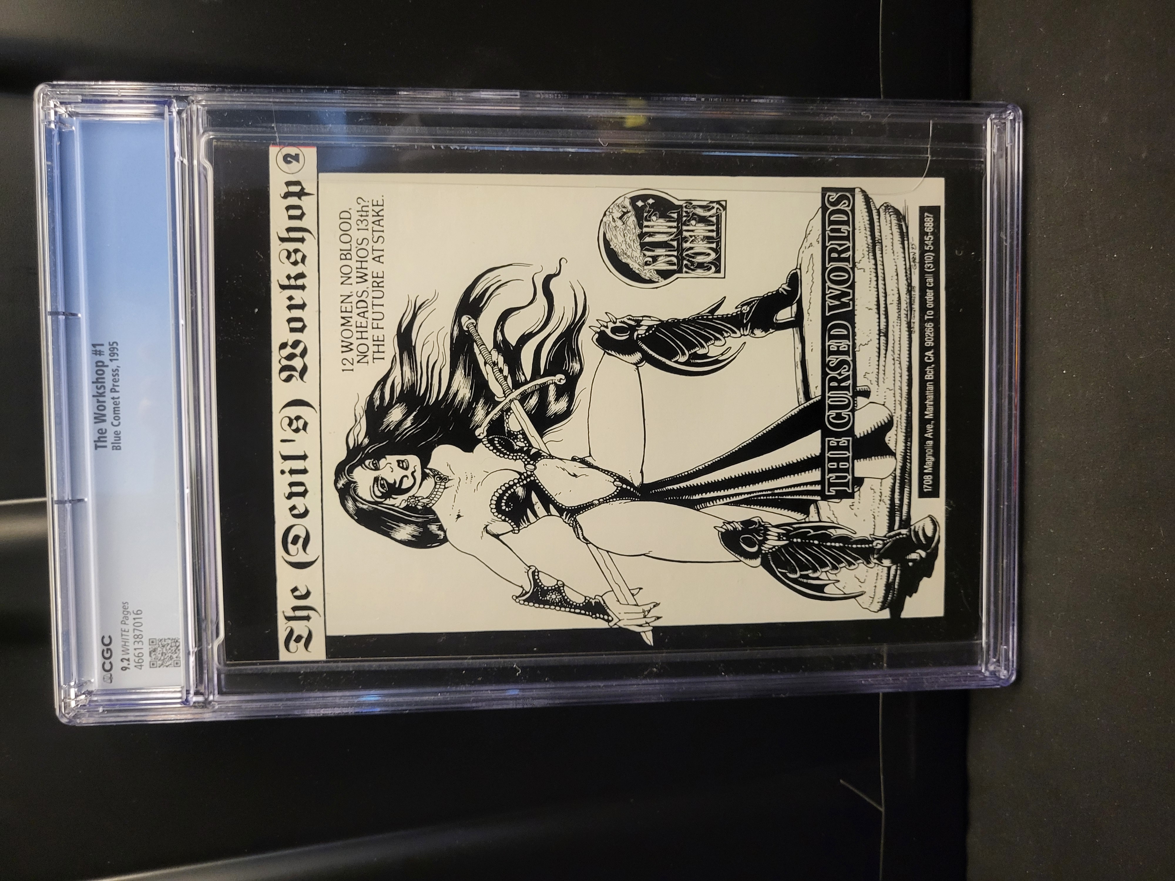 BID PER WHAT YOU SEE IN THE PHOTO, NOT THE AI GENERATED TITLES AND DESCRIPTIONS! This lot consists of a single copy of Craig Stormon’s The (Devil’s) Workshop #1, published by Blue Comet Press in 1995. The comic features a story by Paul H. Birch and artwork by Richard Bonk. The front cover displays color fantasy-style illustrations of three female figures in stylized attire set against a night sky with bats and skulls. The back cover contains a black and white illustration titled The Cursed Worlds along with the publisher’s address and contact information. The comic is professionally encapsulated in a tamper-evident plastic slab from the Certified Guaranty Company (CGC).