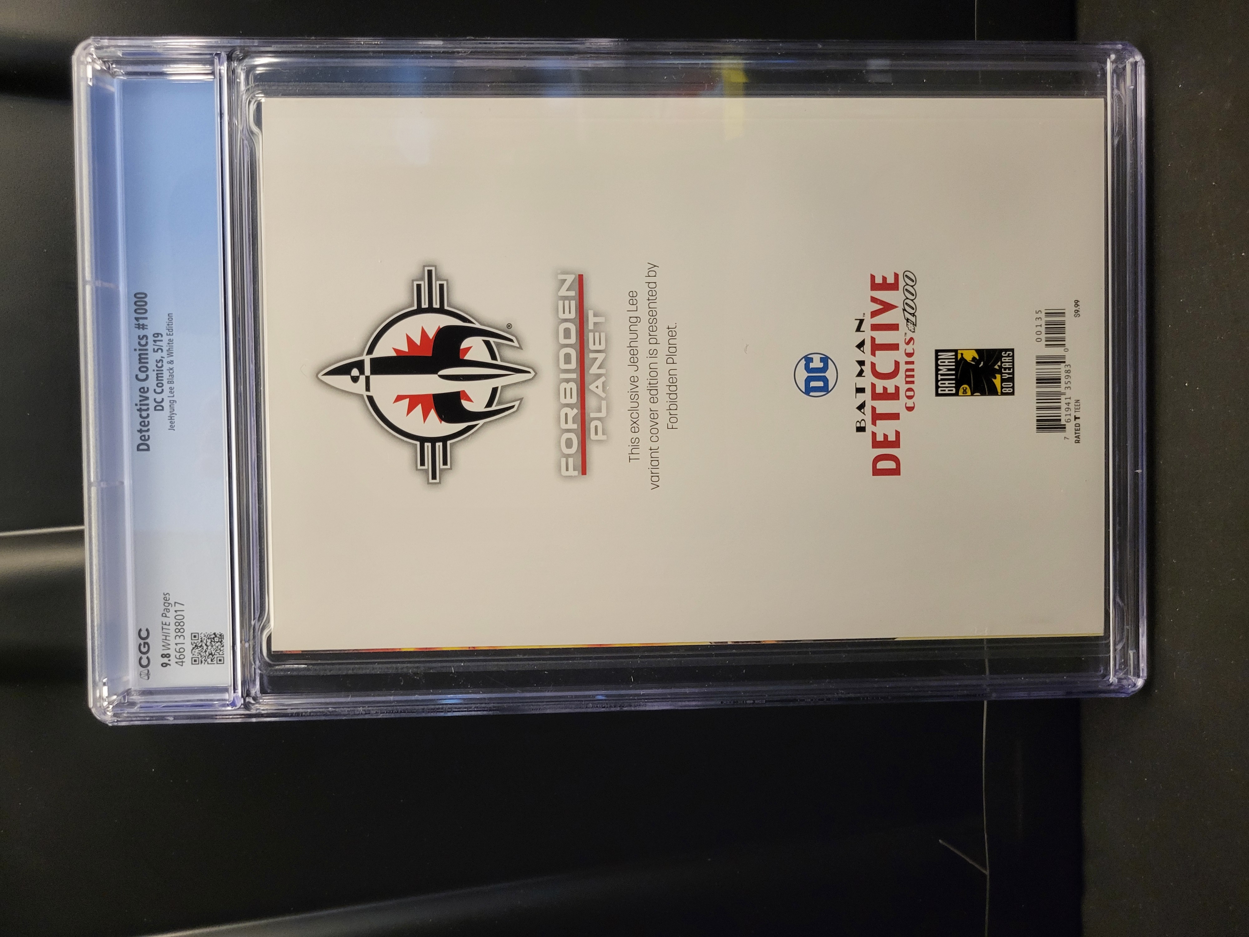 BID PER WHAT YOU SEE IN THE PHOTO, NOT THE AI GENERATED TITLES AND DESCRIPTIONS! This is a copy of Detective Comics #1000, published by DC Comics in May 2019. This specific issue is the Forbidden Planet exclusive variant featuring black and white virgin cover art by JeeHyung Lee. The illustration depicts the character Harley Quinn holding a baseball bat in a rain-slicked setting. The comic is professionally graded by the Certified Guaranty Company (CGC) and is identified as containing the first appearance of the Arkham Knight in DC Universe continuity. The reverse of the white back cover displays the Forbidden Planet, DC, and Batman 80 Years logos. The book is noted to have white pages and is housed in a standard CGC protective plastic slab.