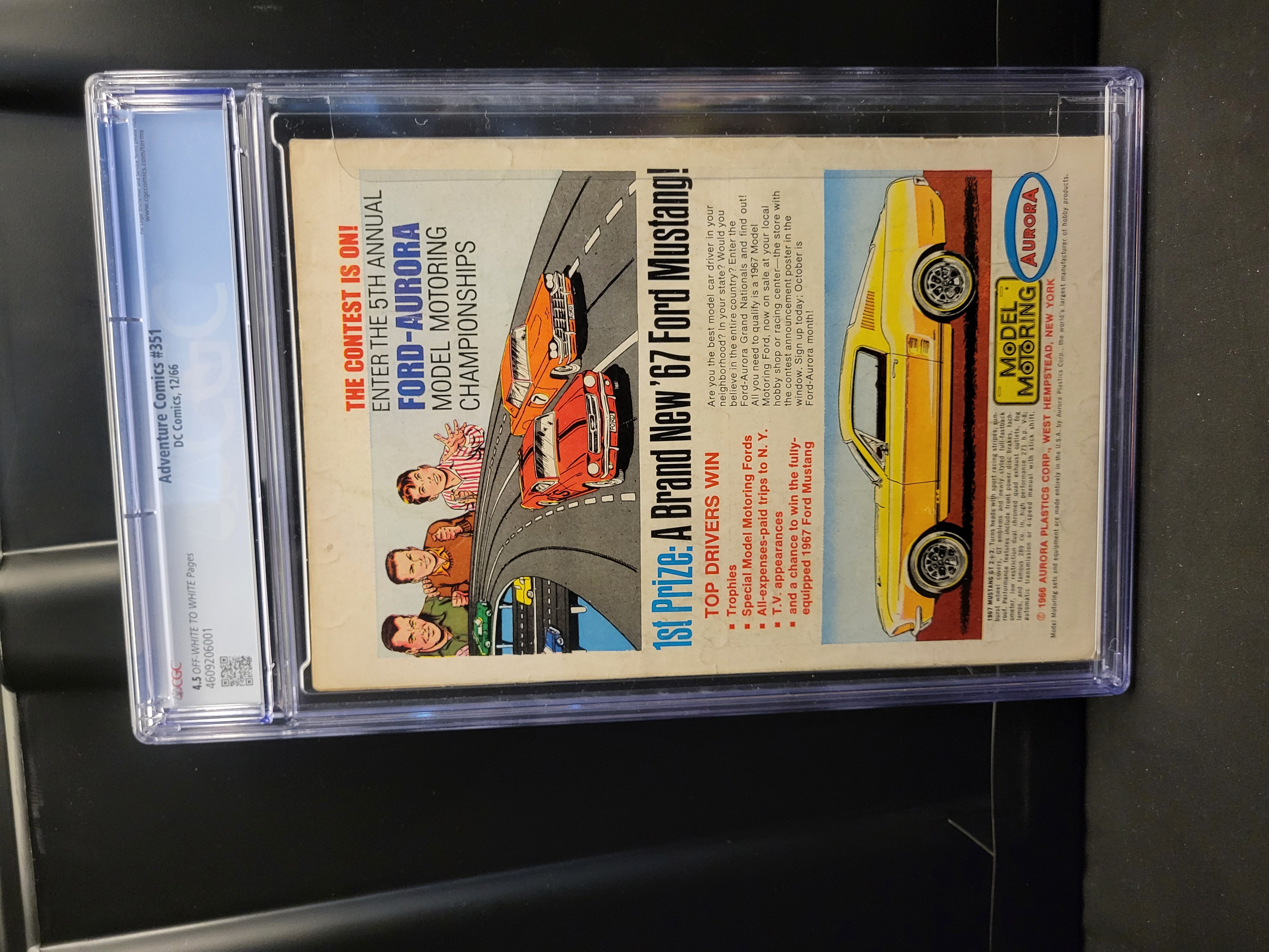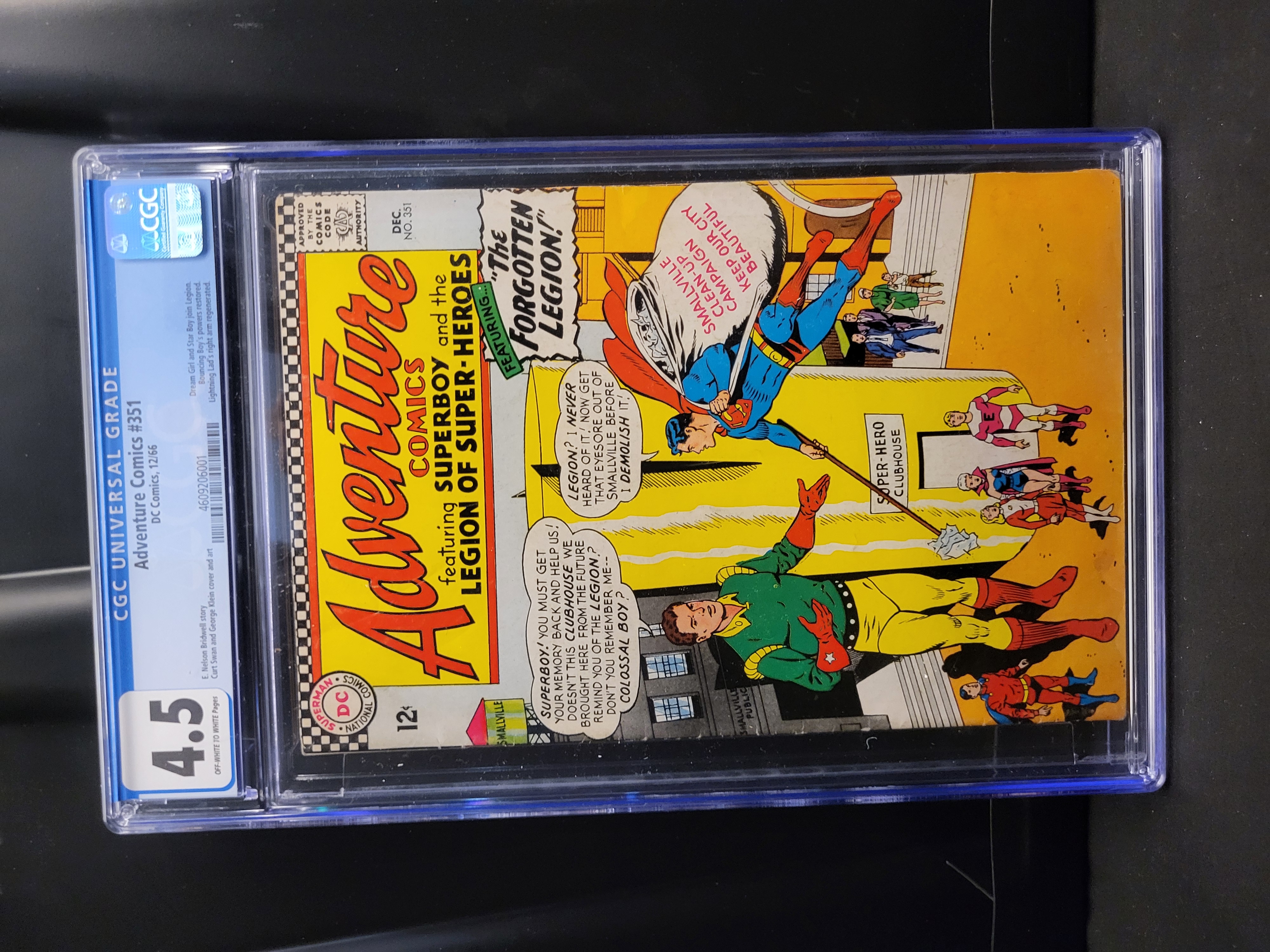 BID PER WHAT YOU SEE IN THE PHOTO, NOT THE AI GENERATED TITLES AND DESCRIPTIONS! Adventure Comics #351, published by DC Comics in December 1966. This Silver Age comic book features Superboy and the Legion of Super-Heroes in the story titled The Forgotten Legion! written by E. Nelson Bridwell. The issue features plot developments including Dream Girl and Star Boy joining the Legion, the restoration of Bouncing Boy’s powers, and the regeneration of Lightning Lad’s right arm. This issue also contains the first appearance of the character Hag, who later becomes the White Witch. The cover and interior art are credited to Curt Swan and George Klein. The reverse of the comic displays a full-page color advertisement for the 5th Annual Ford-Aurora Model Motoring Championships. The item is professionally encapsulated in a CGC protective plastic slab. Certification number 4609206001 is present on the label.