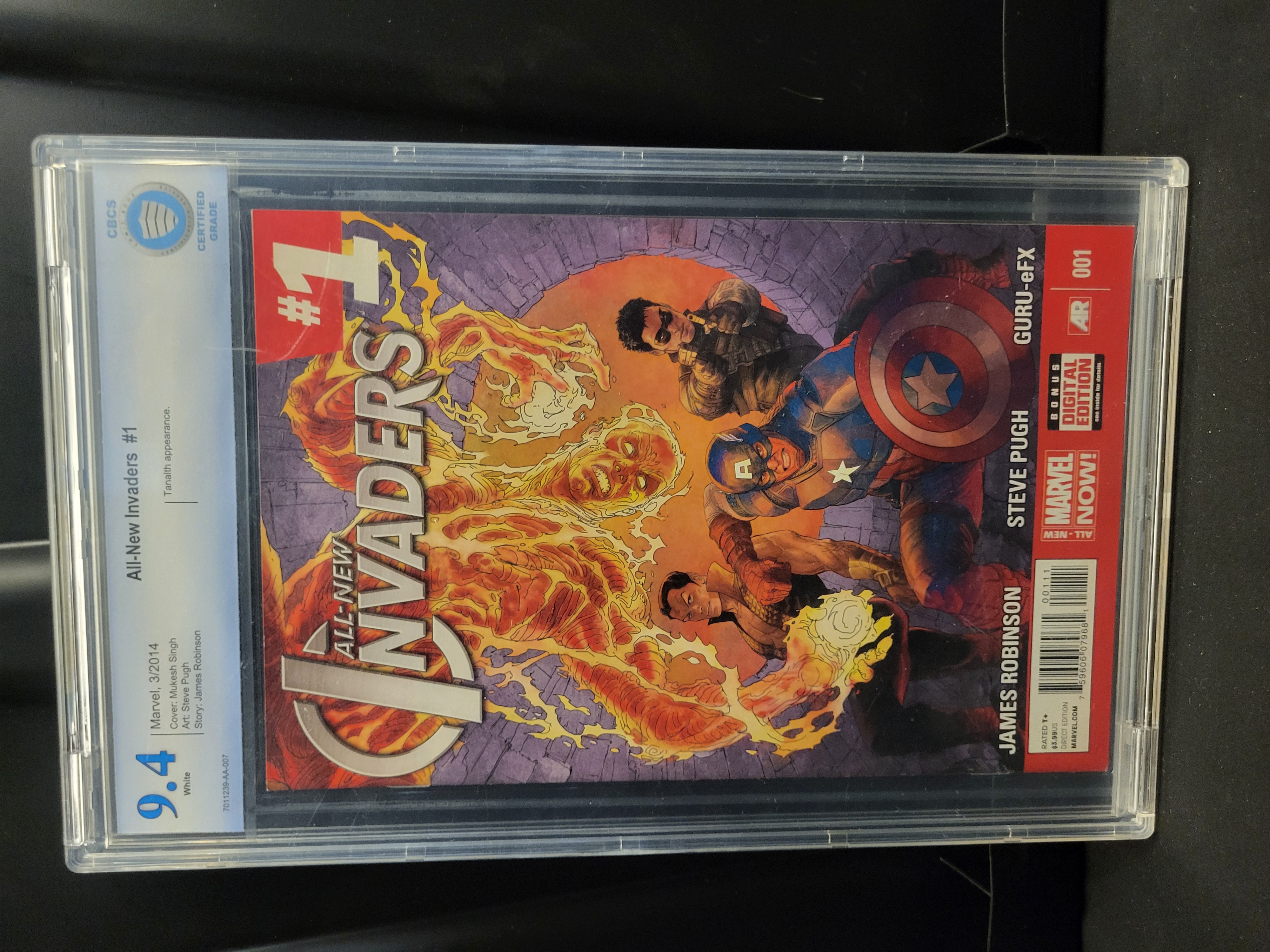 BID PER WHAT YOU SEE IN THE PHOTO, NOT THE AI GENERATED TITLES AND DESCRIPTIONS! Marvel Comics All-New Invaders issue number 1, published in March 2014. The issue features the story Gods and Soldiers. The creative team includes writer James Robinson and artist Steve Pugh, with cover art by Mukesh Singh. The cover illustration features Captain America, Winter Soldier, Namor, and the Human Torch. This issue contains the first appearance of Tanalth. The back cover includes a Dr. Pepper advertisement featuring Black Widow. The comic is professionally graded and encapsulated by the Comic Book Certification Service (CBCS).