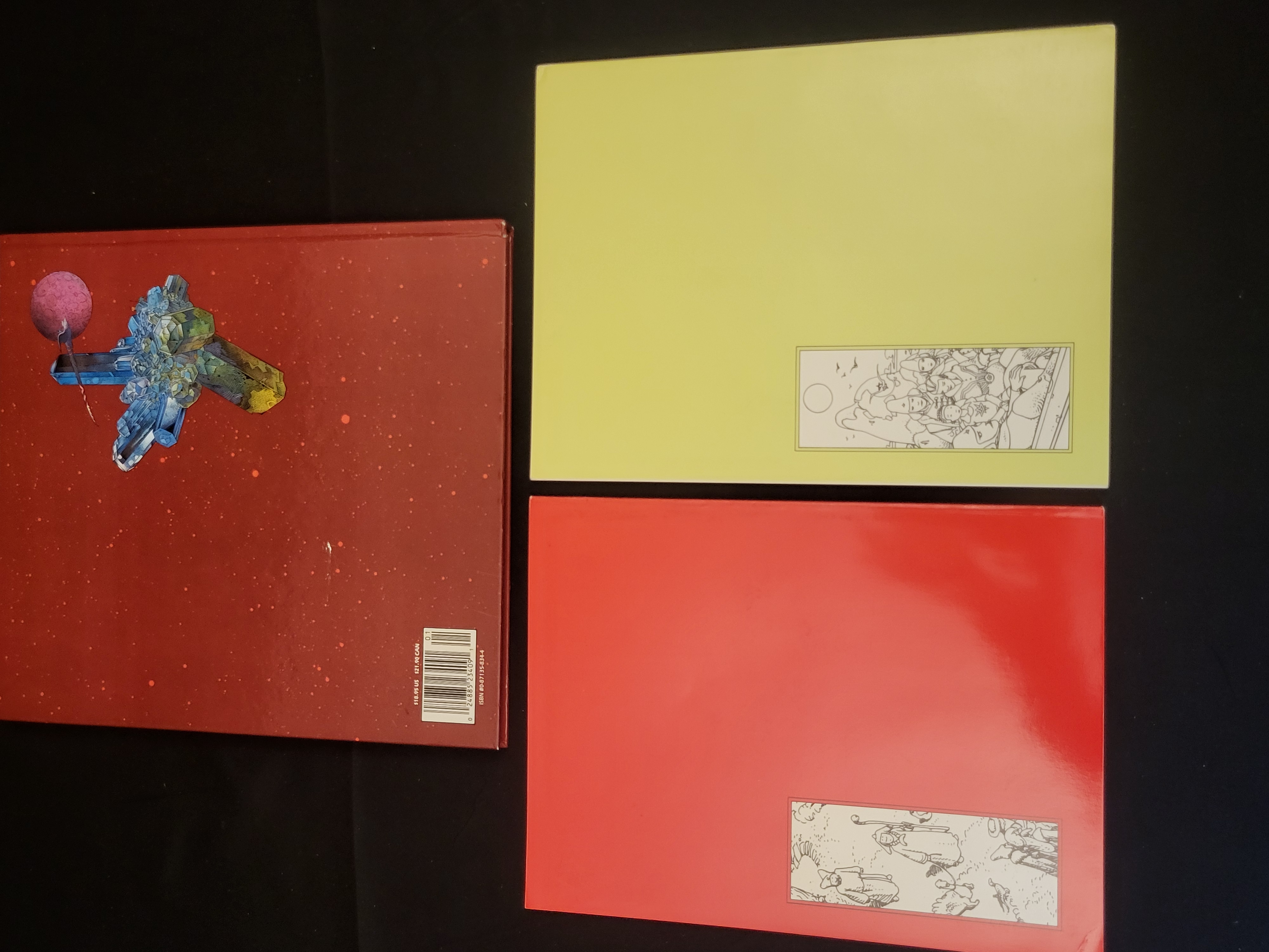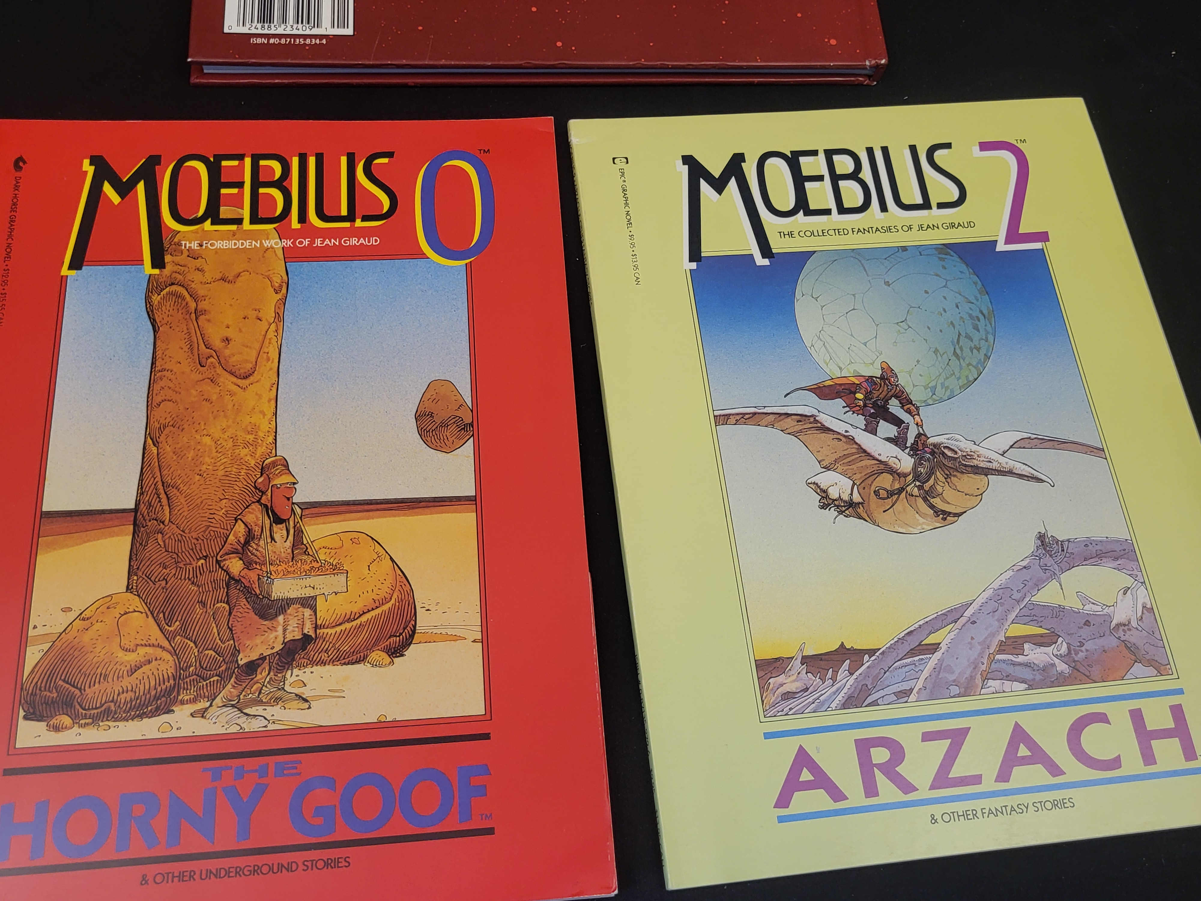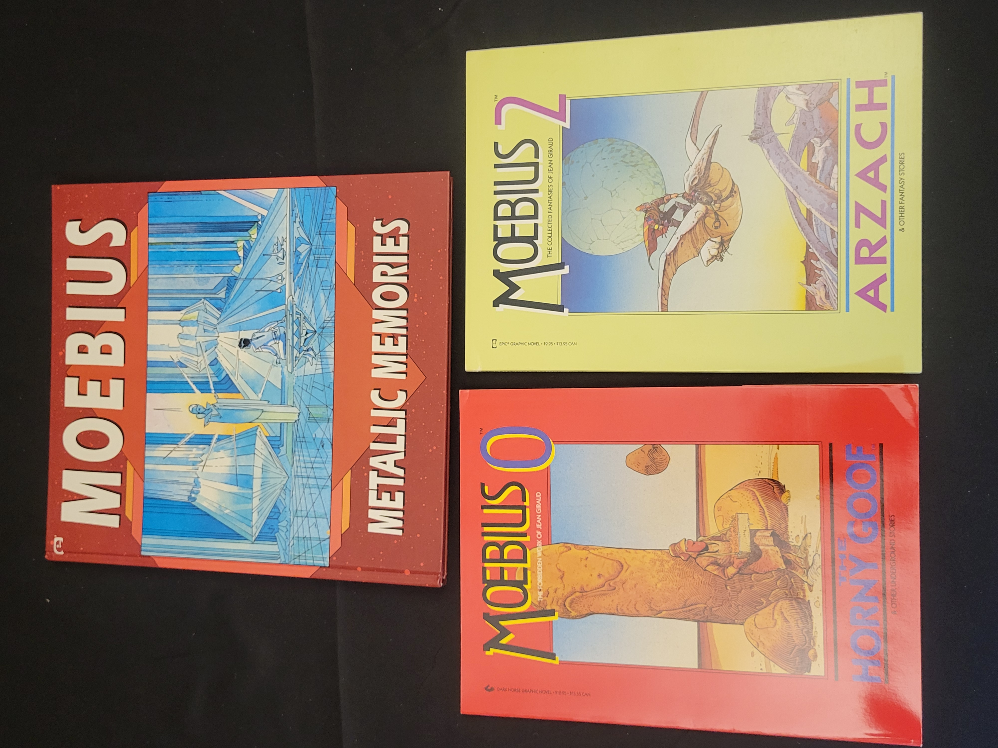 BID PER WHAT YOU SEE IN THE PHOTO, NOT THE AI GENERATED TITLES AND DESCRIPTIONS! A trio of publications featuring the work of French artist Jean Giraud, known by the pseudonym Moebius. The collection includes one hardcover volume and two softcover graphic novels. The hardcover edition is titled Metallic Memories, published by Epic Comics, featuring a dark red cover with a blue-toned architectural illustration and ISBN 0-87135-834-4. The first softcover volume is Moebius 2: Arzach and Other Fantasy Stories, part of the series The Collected Fantasies of Jean Giraud published by Epic Graphic Novel, featuring a pale yellow cover. The second softcover volume is Moebius 0: The Horny Goof and Other Underground Stories, subtitled The Forbidden Work of Jean Giraud, published by Dark Horse Graphic Novel, with a vibrant red cover. Each volume contains surrealist and science-fiction illustrations characteristic of the artist’s style.