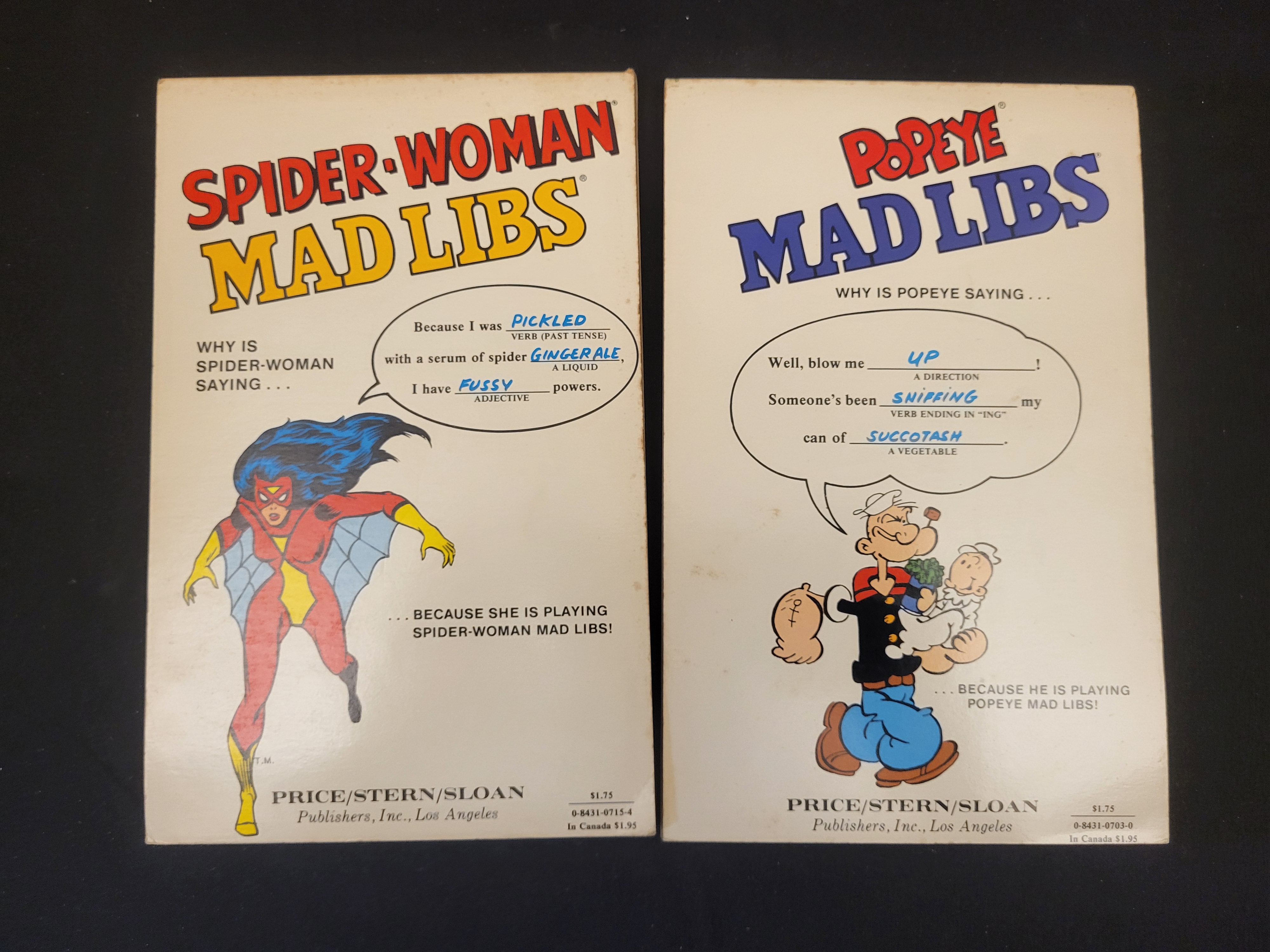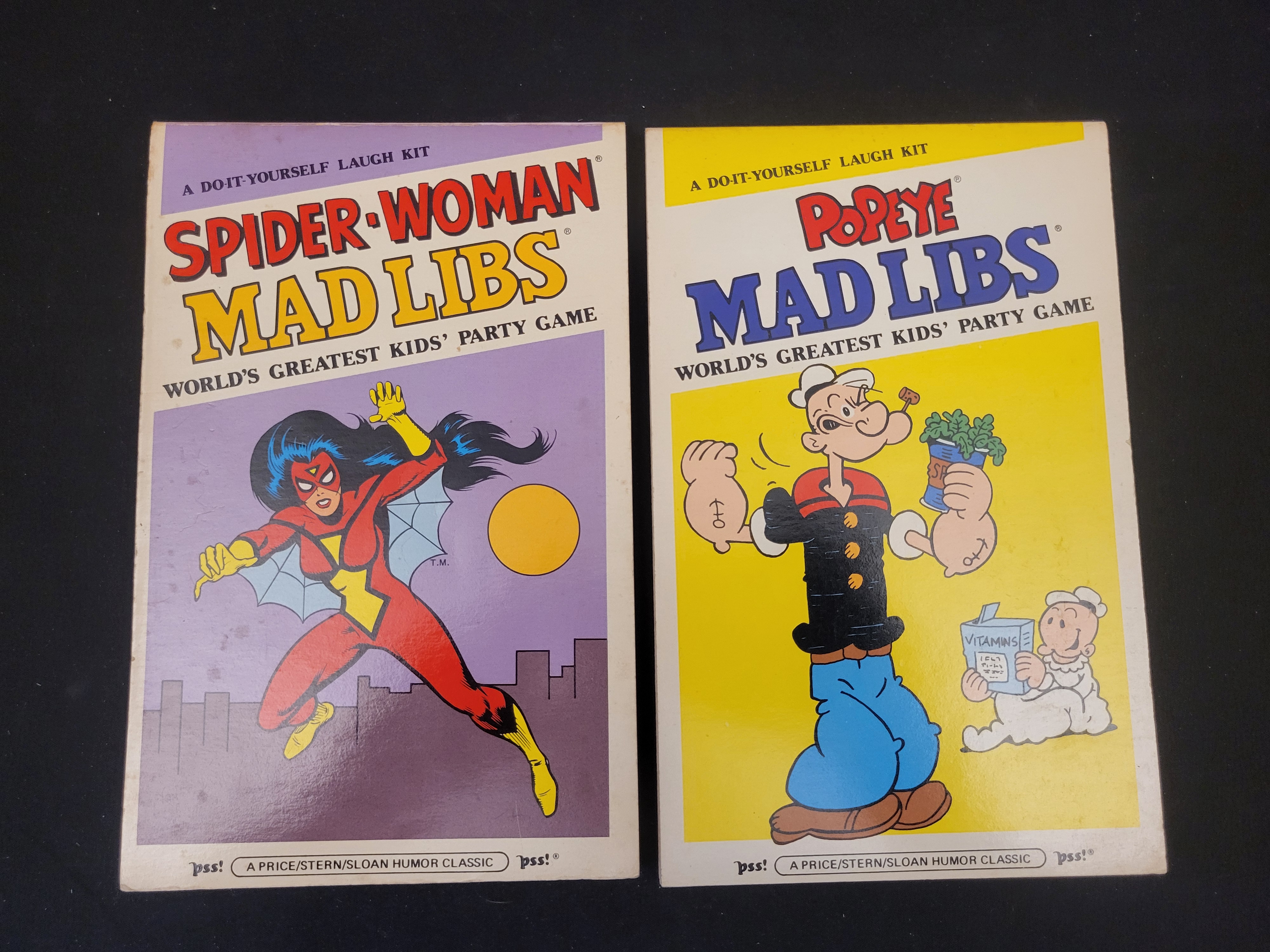 BID PER WHAT YOU SEE IN THE PHOTO, NOT THE AI GENERATED TITLES AND DESCRIPTIONS! A pair of vintage Mad Libs activity books published by Price/Stern/Sloan Publishers, Inc., Los Angeles. The lot includes Spider-Woman Mad Libs, dated 1981, and Popeye Mad Libs. Each volume is subtitled A Do-It-Yourself Laugh Kit and World’s Greatest Kids’ Party Game. The books feature illustrated cardstock covers with character graphics. The Spider-Woman volume depicts the Marvel Comics character, while the Popeye volume features the classic cartoon sailor. The reverse of each book displays sample Mad Libs text, character illustrations, and the original retail price of $1.75.