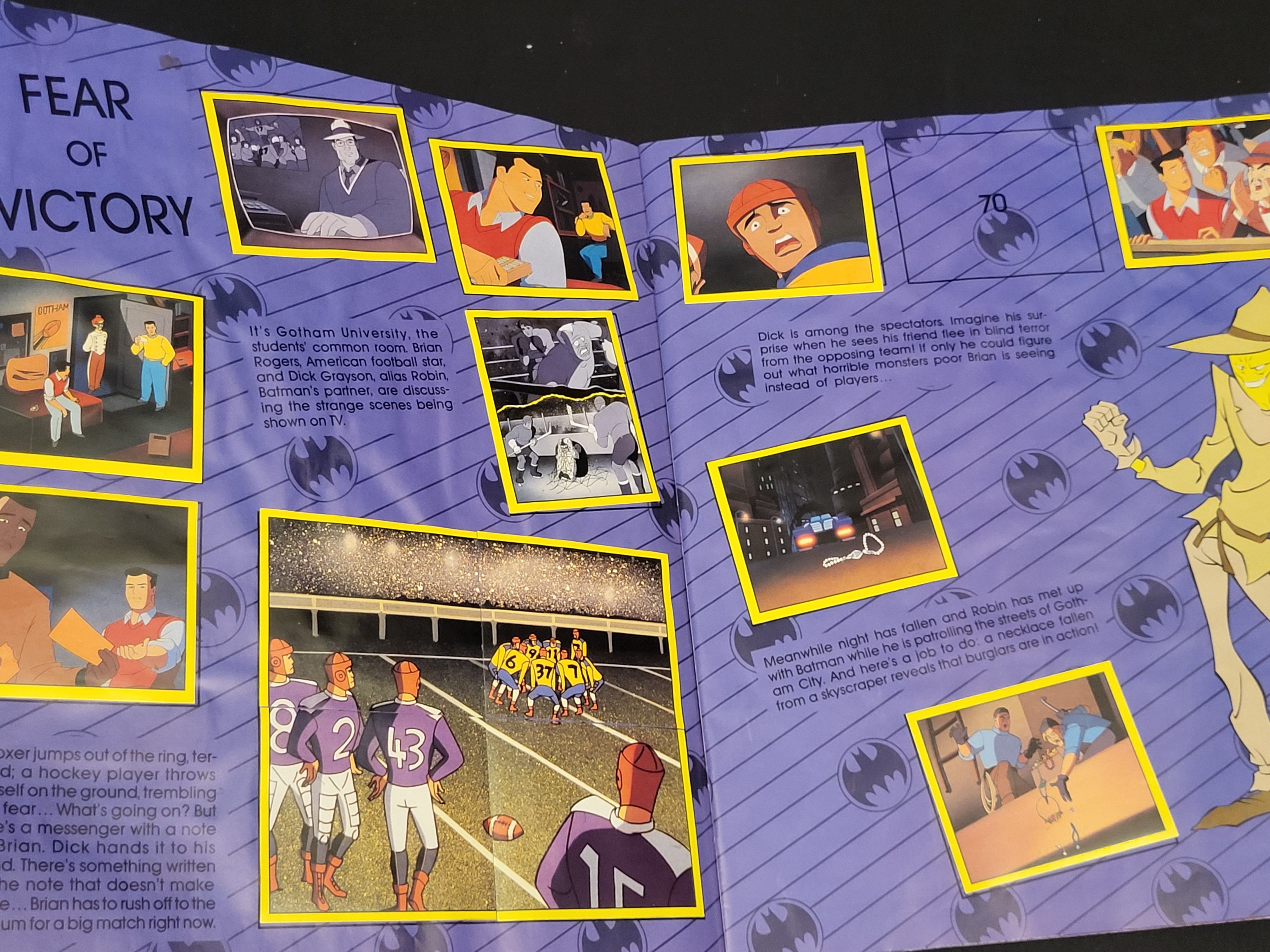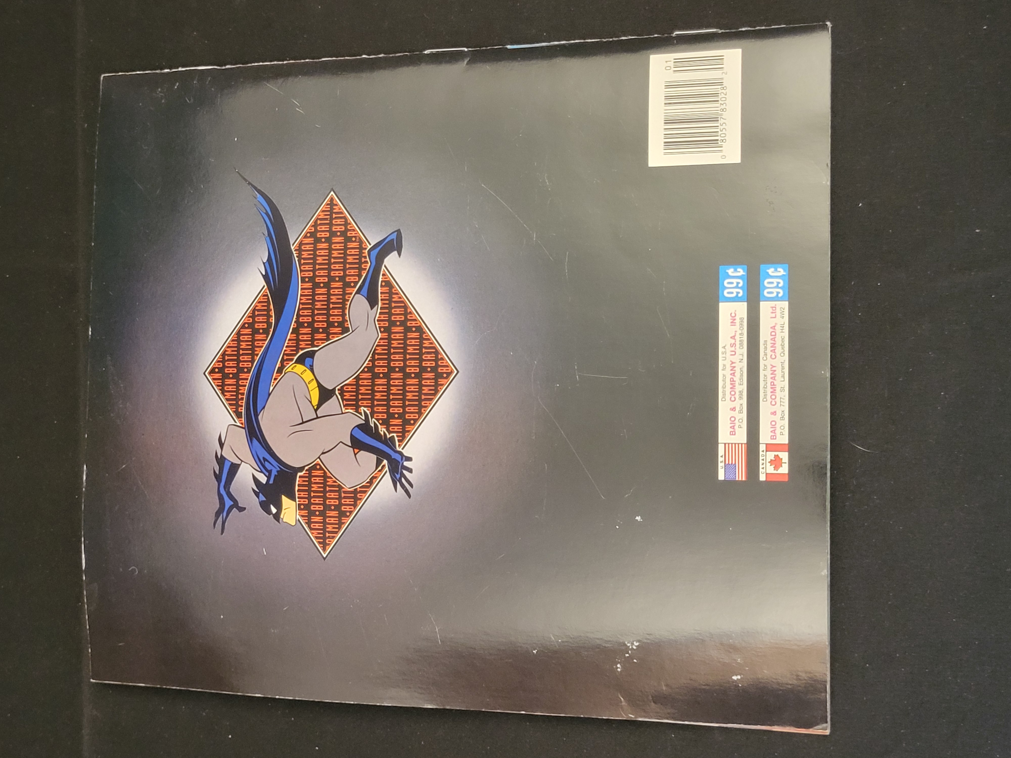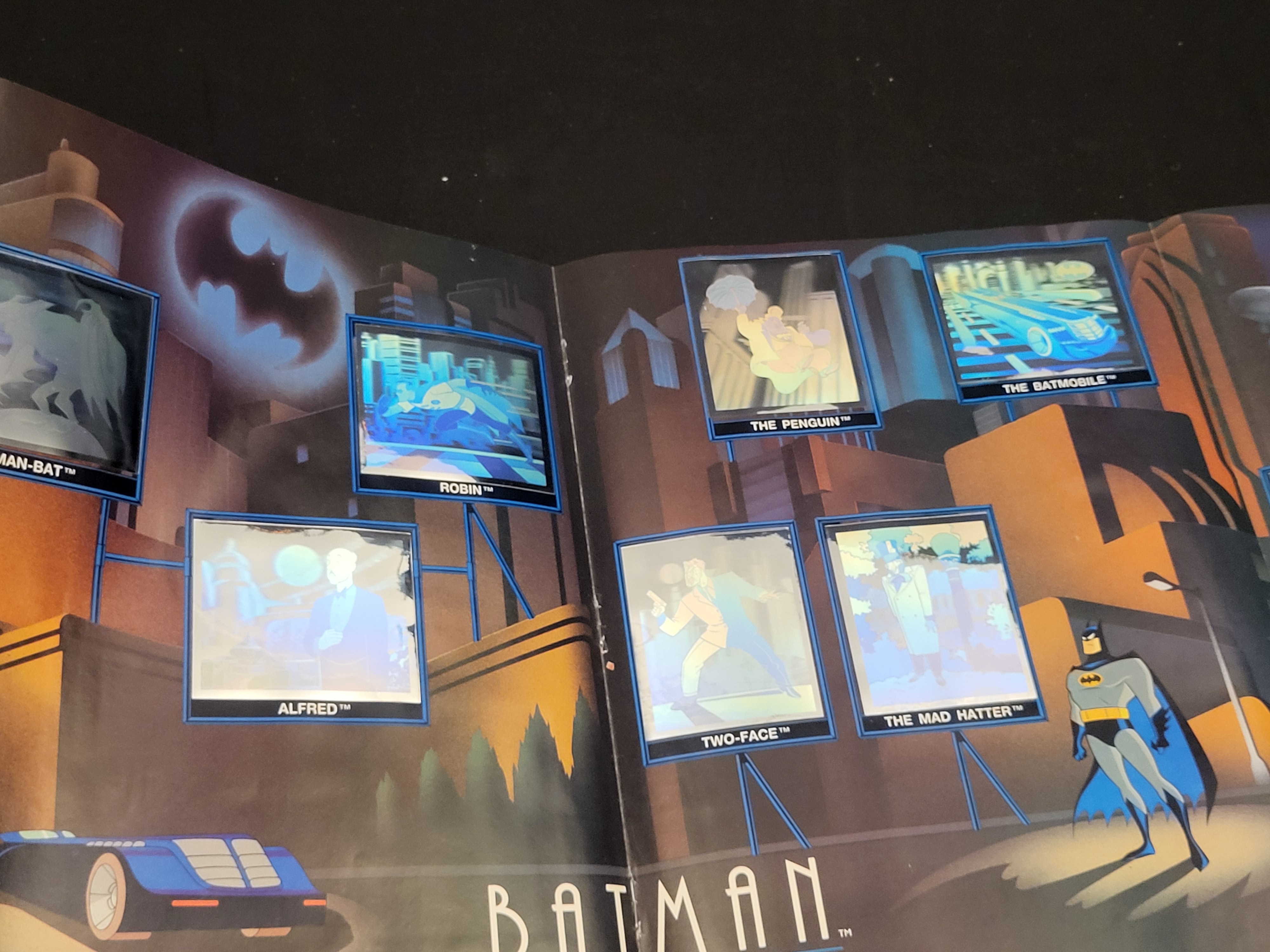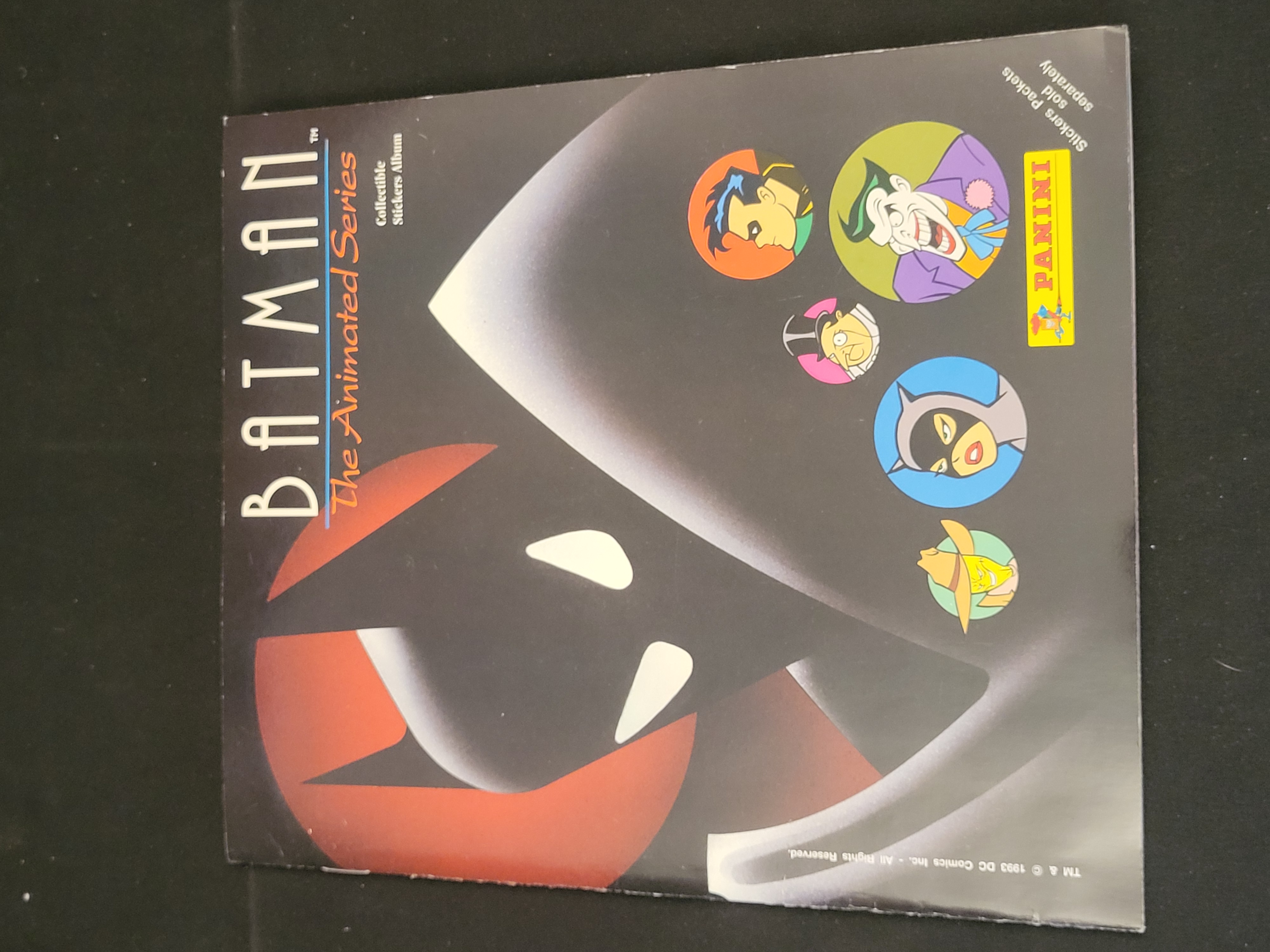 BID PER WHAT YOU SEE IN THE PHOTO, NOT THE AI GENERATED TITLES AND DESCRIPTIONS! A 1993 Batman: The Animated Series collectible sticker album produced by Panini under license from DC Comics. The front cover features a prominent silhouette of Batman alongside circular portraits of characters including Robin, The Joker, The Penguin, Catwoman, and The Scarecrow. The back cover displays a dynamic illustration of Batman within a diamond-shaped border and includes original retail price markings for the United States and Canada. The interior pages are constructed of paper and feature narrative text and captions accompanying designated numbered spaces for adhesive stickers. This specimen is partially filled with stickers depicting characters and scenes from the television series, including the episode Fear of Victory. Visible stickers include portraits of Alfred, Two-Face, The Mad Hatter, and the Batmobile.