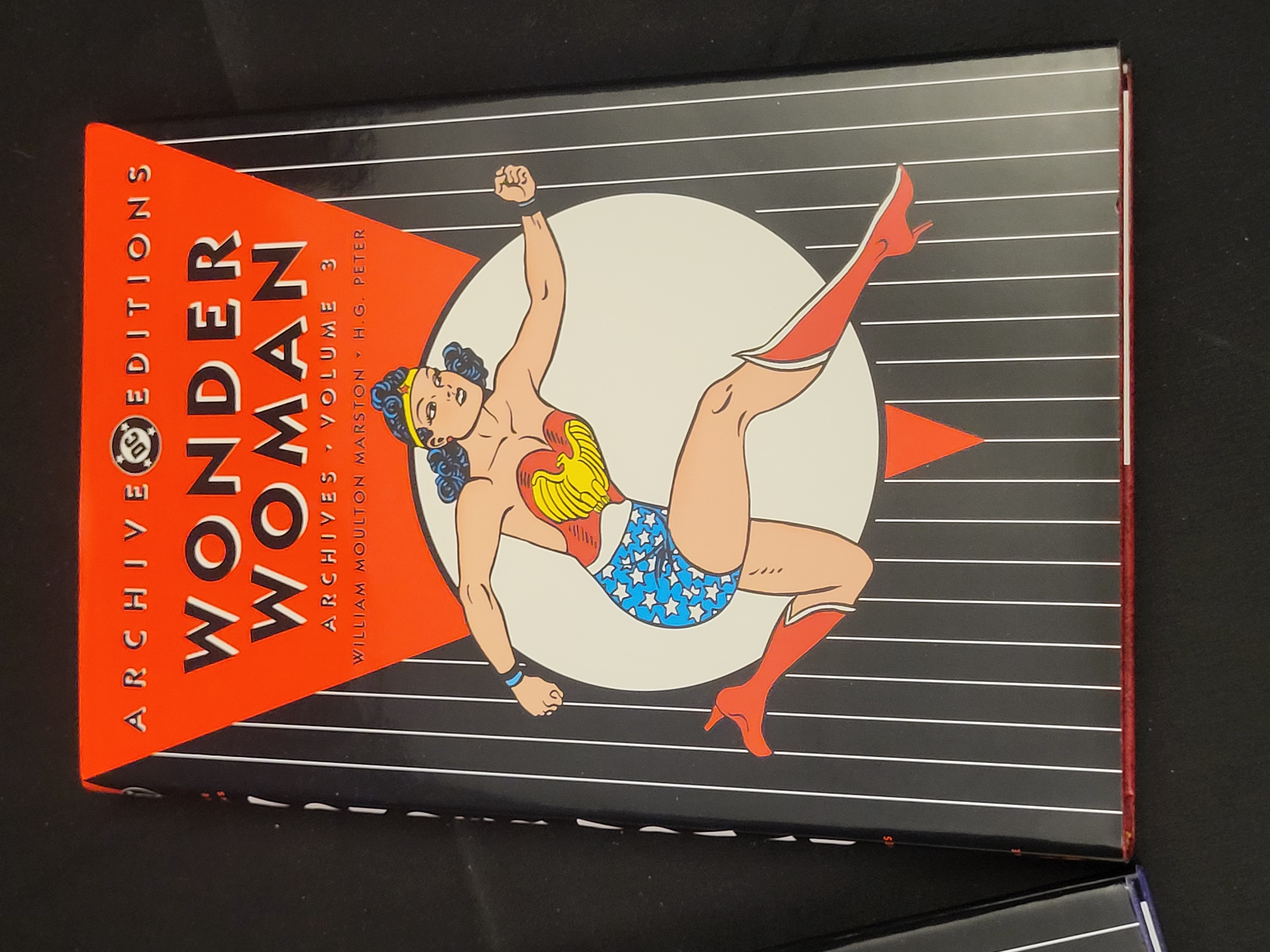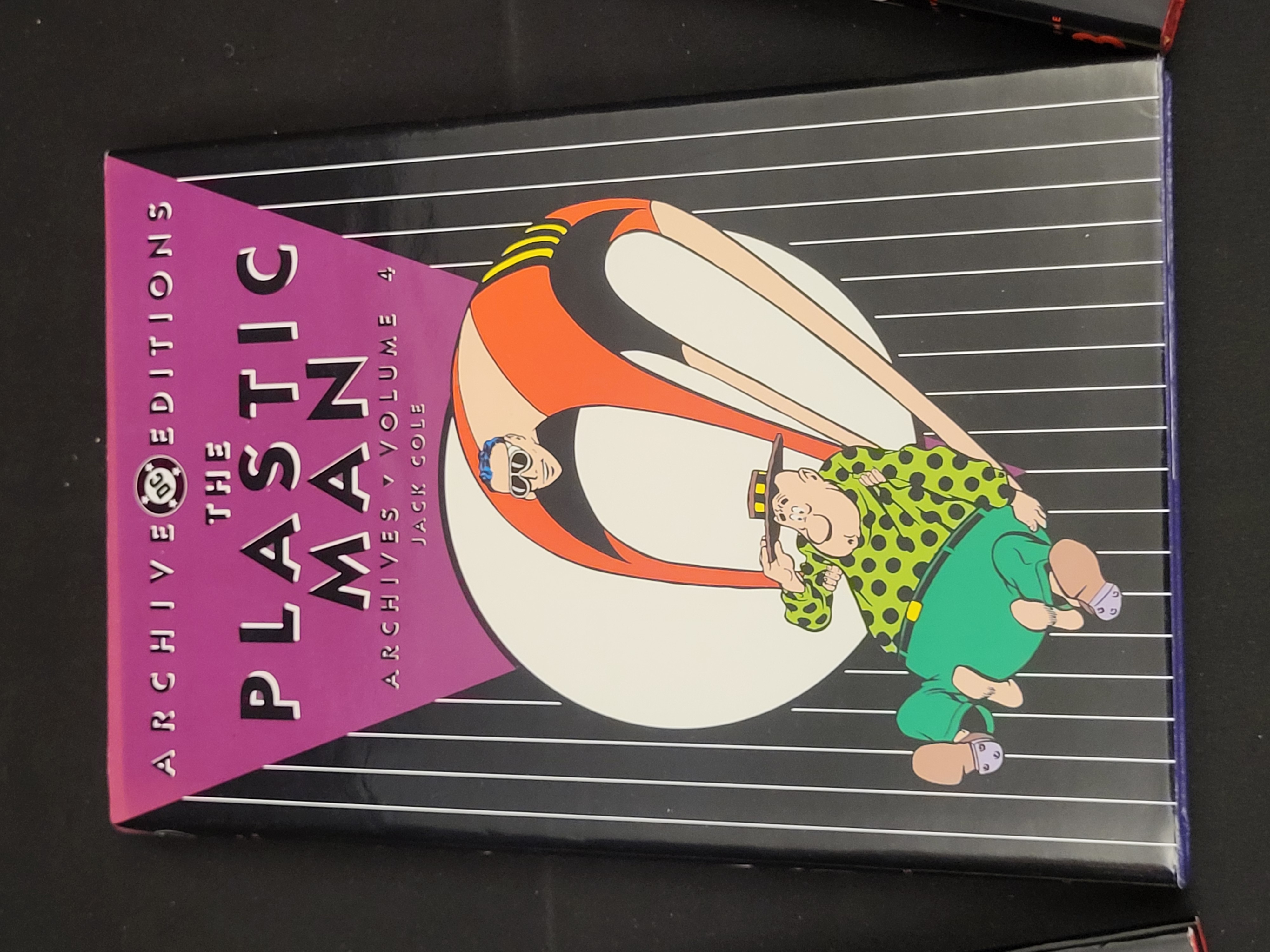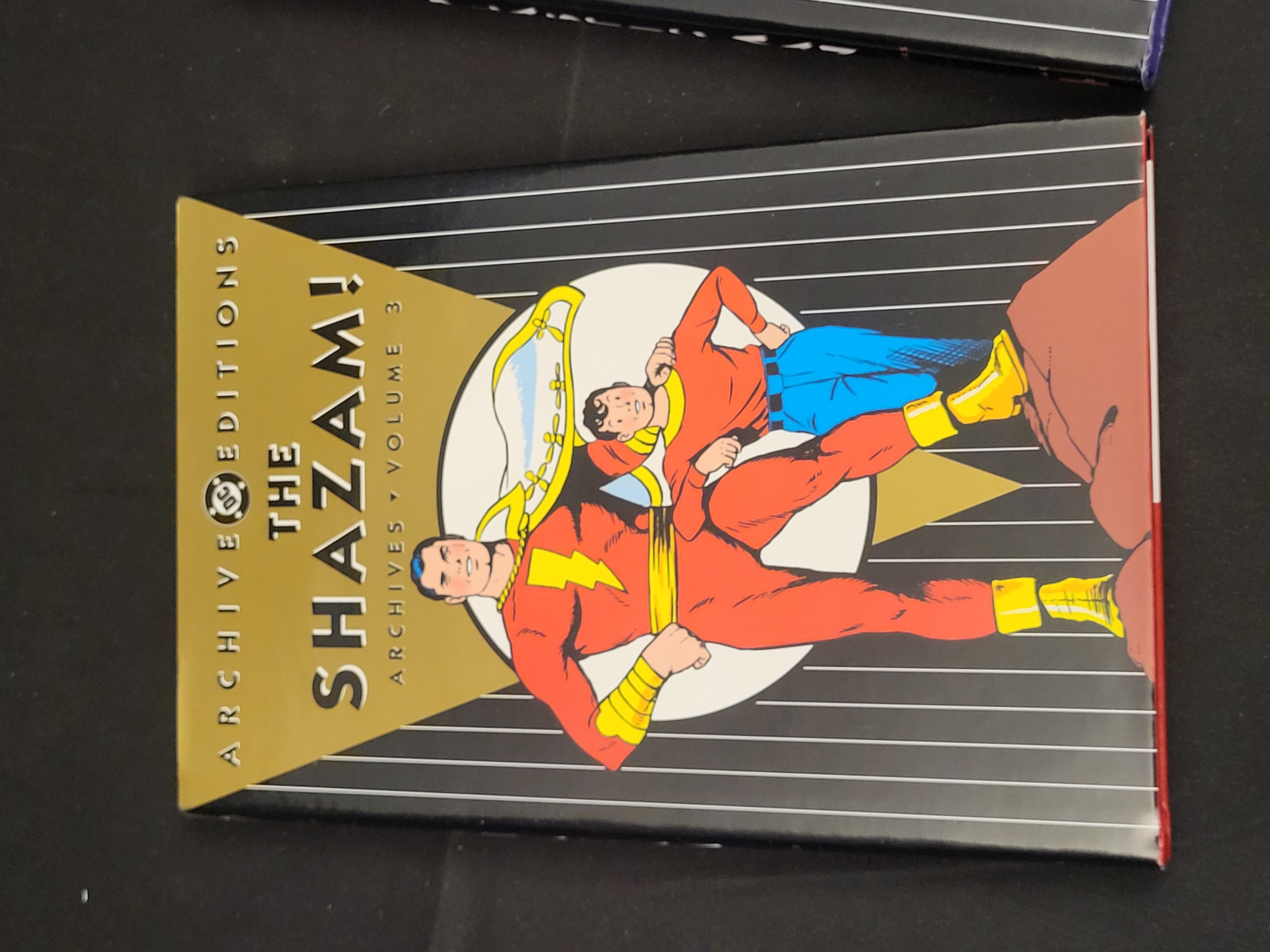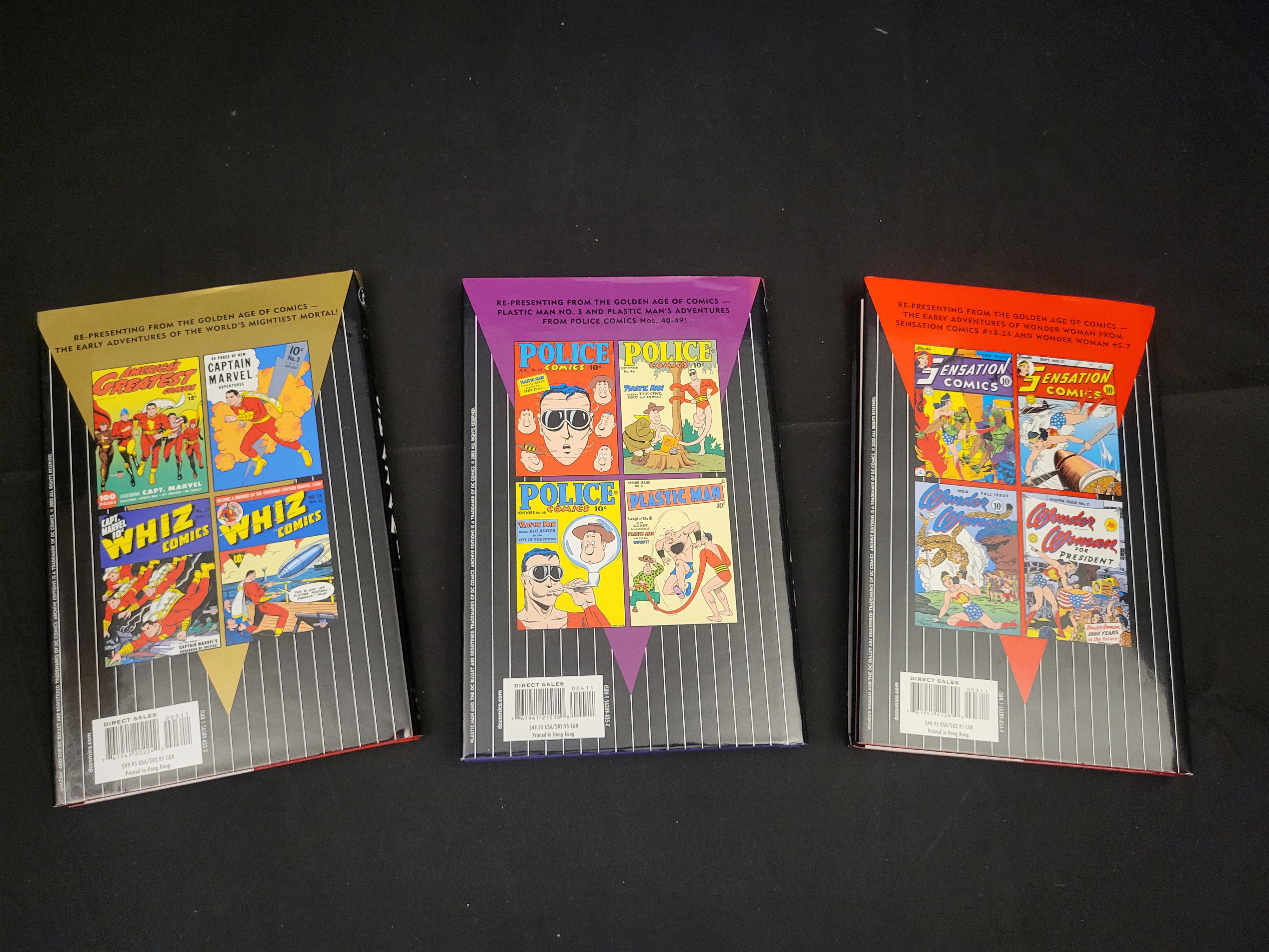 BID PER WHAT YOU SEE IN THE PHOTO, NOT THE AI GENERATED TITLES AND DESCRIPTIONS! A trio of DC Archive Editions hardcover books re-presenting stories from the Golden Age of Comics. The collection includes The Shazam! Archives Volume 3, The Plastic Man Archives Volume 4 featuring the work of Jack Cole, and The Wonder Woman Archives Volume 3 by William Moulton Marston and H.G. Peter. Each volume is bound in hardcover and protected by a glossy dust jacket featuring a consistent pinstripe background and character-specific illustrations. The reverse of the dust jackets displays reproductions of vintage comic book covers from titles such as Whiz Comics, Police Comics, and Sensation Comics. These editions were published by DC Comics and printed in Hong Kong.