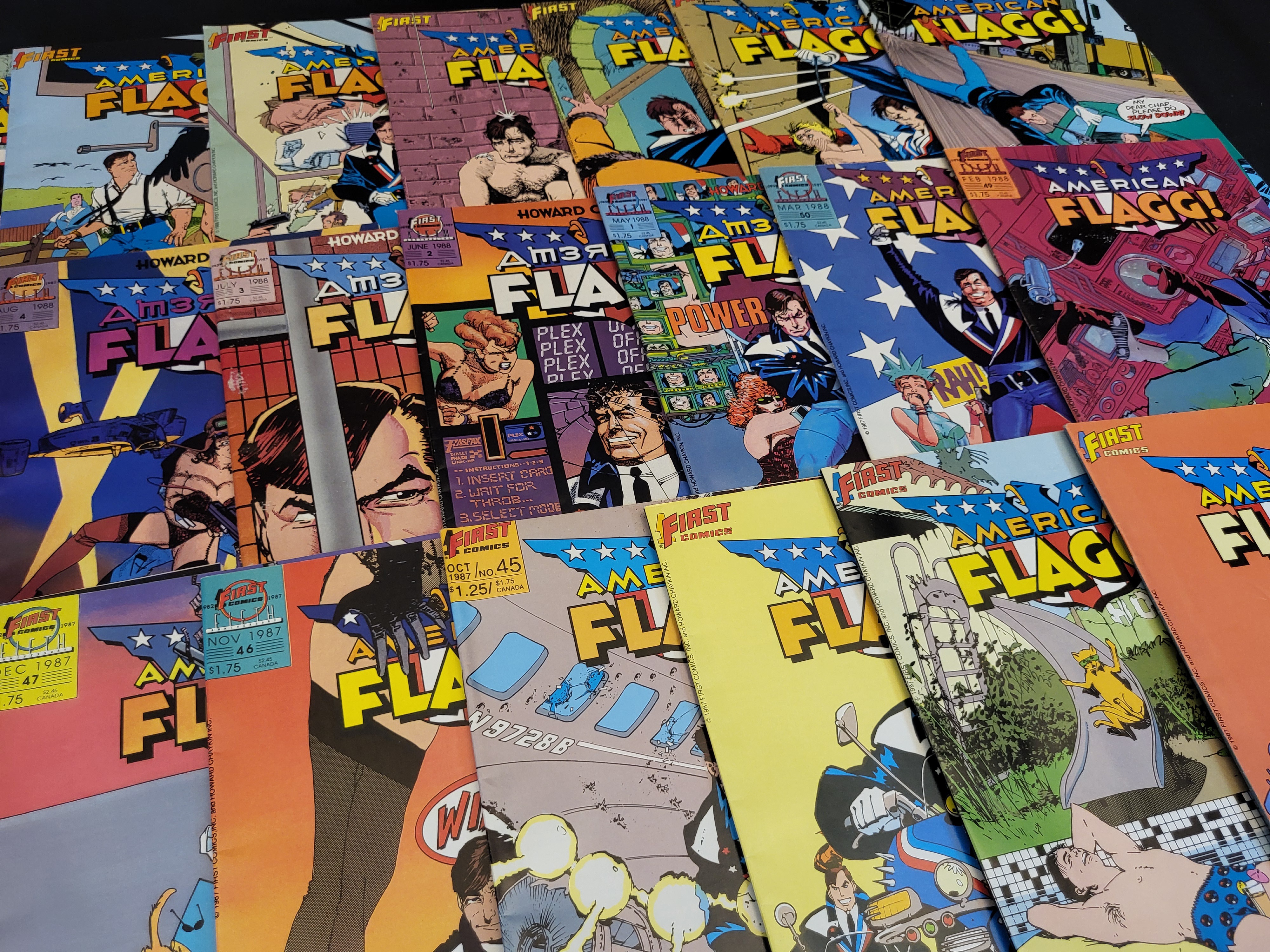 BID PER WHAT YOU SEE IN THE PHOTO, NOT THE AI GENERATED TITLES AND DESCRIPTIONS! A collection of American Flagg! comic books published by First Comics, featuring the work of writer and artist Howard Chaykin. The group includes various issues from the original series run, specifically identifying numbers 42, 45, 46, 47, 48, 49, and 50, alongside several issues from the subsequent 1988 volume. These publications, dating from the late 1980s, are characterized by their satirical cover art and futuristic themes. Each issue features standard staple binding and color illustrations. The covers display the First Comics logo, issue numbers, and original cover prices.