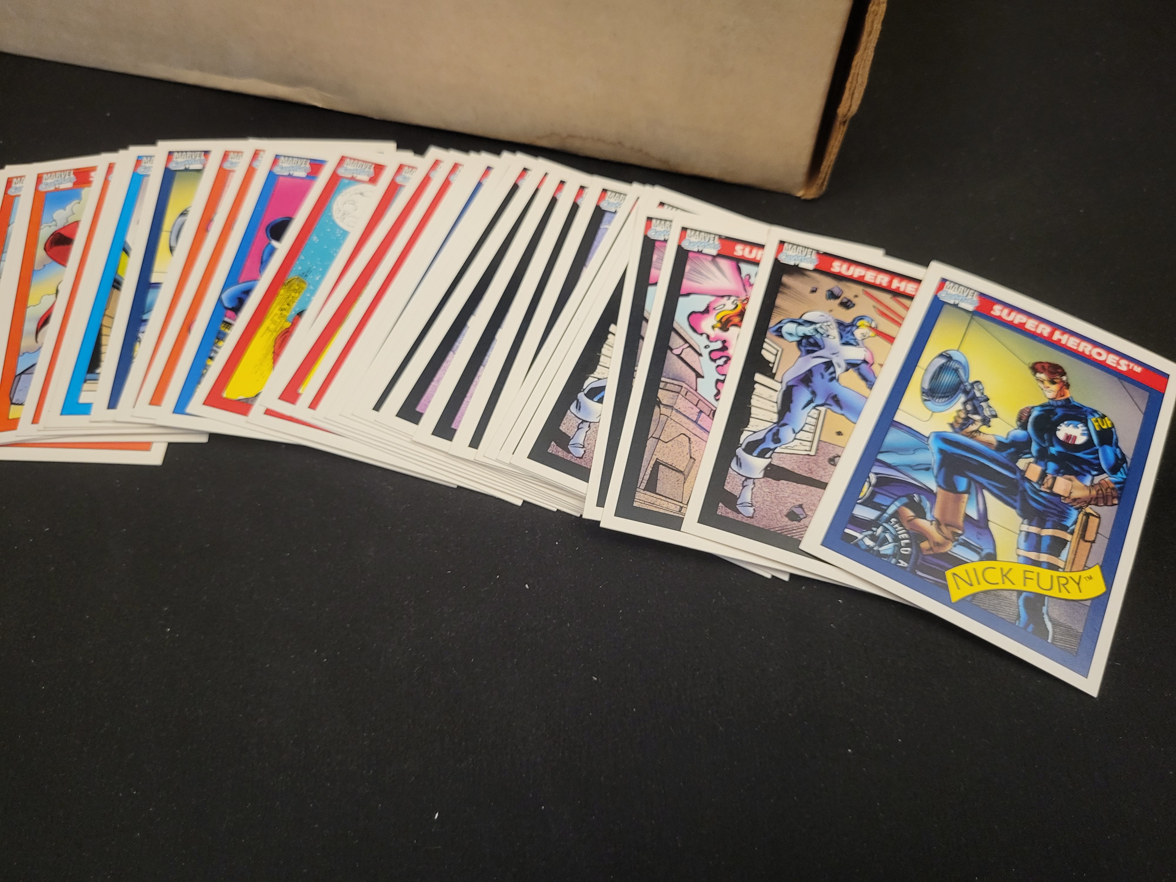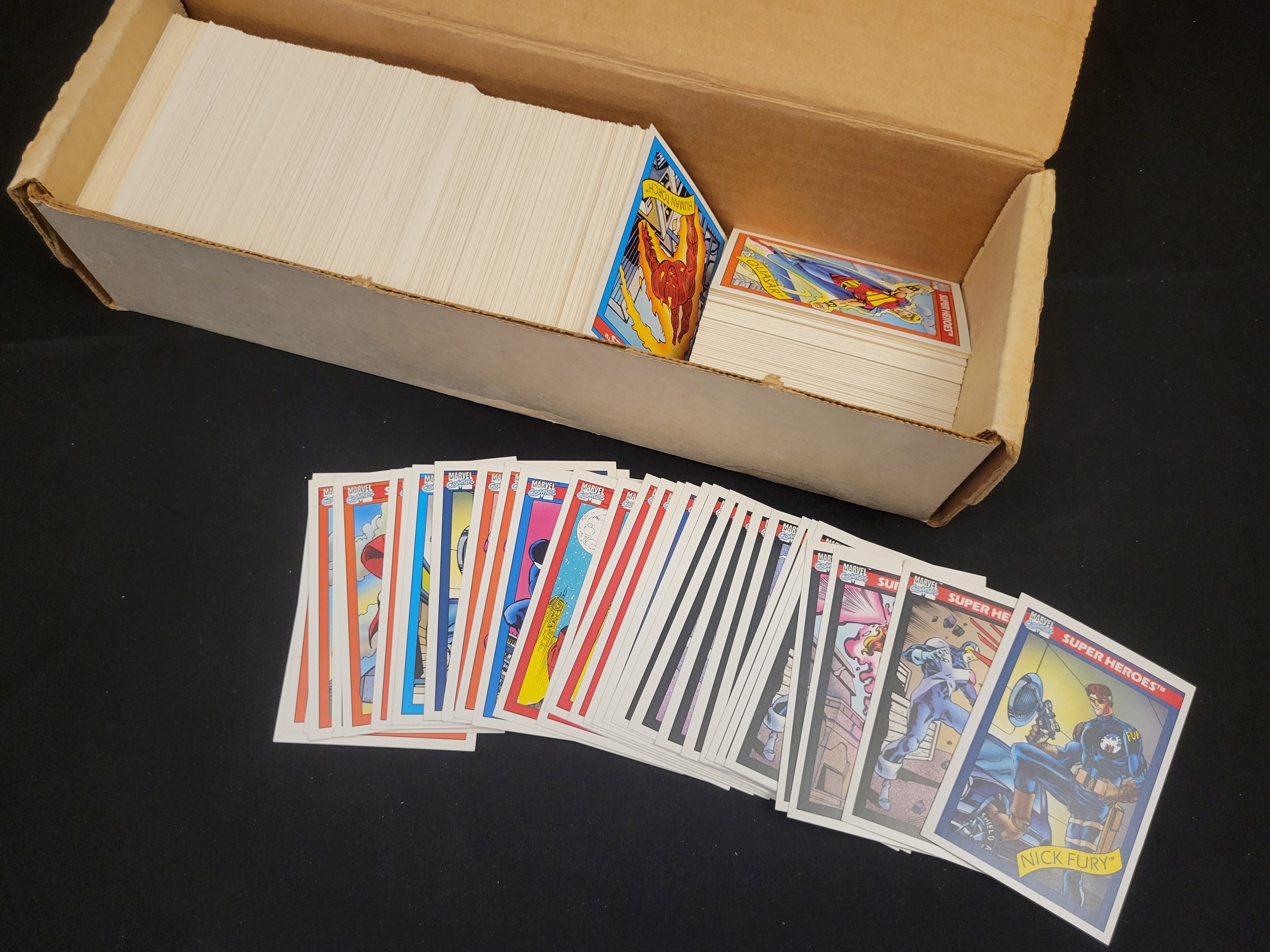 BID PER WHAT YOU SEE IN THE PHOTO, NOT THE AI GENERATED TITLES AND DESCRIPTIONS! A collection of 1990 Impel Marvel Universe Series 1 trading cards. The cards are constructed from printed cardstock and feature various characters from the Marvel Comics universe, including Nick Fury, the Human Torch, and Quasar. Each card displays the Marvel Comics logo and Super Heroes branding. The collection is housed in a tan cardboard storage box.