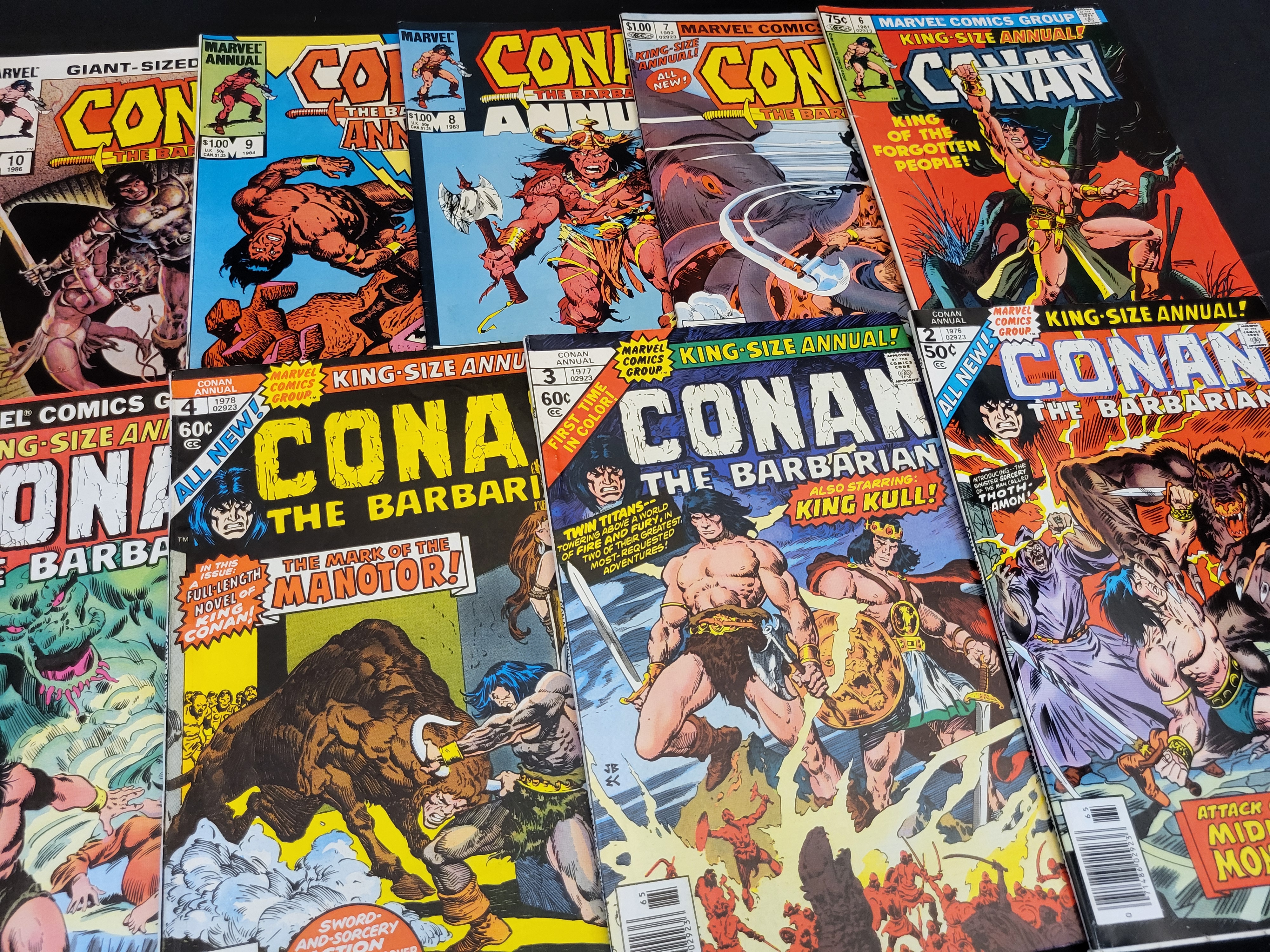 BID PER WHAT YOU SEE IN THE PHOTO, NOT THE AI GENERATED TITLES AND DESCRIPTIONS! A collection of Marvel Comics Conan the Barbarian annual publications, comprising sequential issues from Annual 2 through Annual 10. These Bronze and Modern Age comic books were published between 1976 and 1986. The issues are staple-bound and feature both King-Size and Giant-Sized formats with cover prices ranging from 0.50 to 1.25 dollars. The stories feature characters Conan and King Kull. The collection includes issues with cover dates spanning approximately a decade of Marvel production, featuring dynamic cover illustrations characteristic of the period.