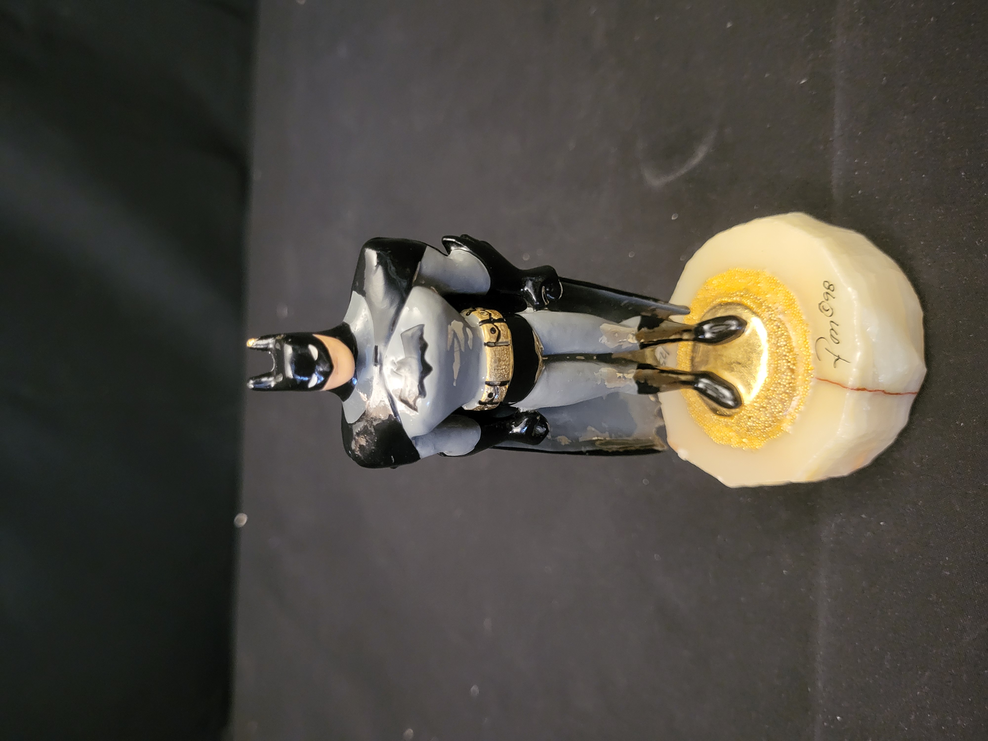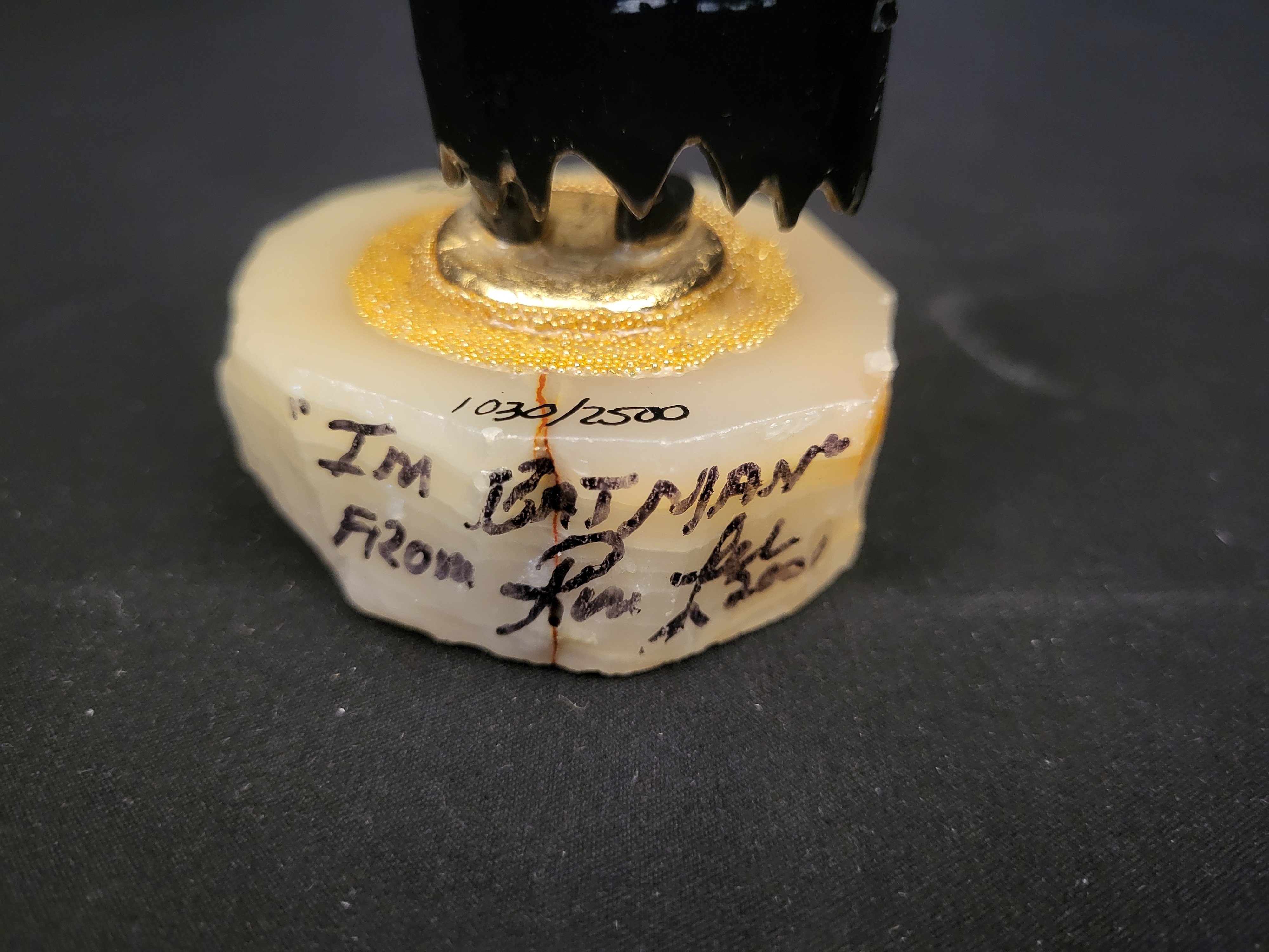 BID PER WHAT YOU SEE IN THE PHOTO, NOT THE AI GENERATED TITLES AND DESCRIPTIONS! A hand-painted pewter sculpture of the DC Comics character Batman, designed by artist Ron Lee. The figure is depicted in a standing pose atop a polished onyx base. The costume is rendered in grey and black with a gold-toned utility belt and a black bat insignia on the chest. The top of the base is signed Ron 98. The side of the base is marked with the limited edition number 1030/2500 and features a hand-written inscription in black ink reading I’m Batman From Ron Lee 2001. The stone base exhibits natural mineral veining.