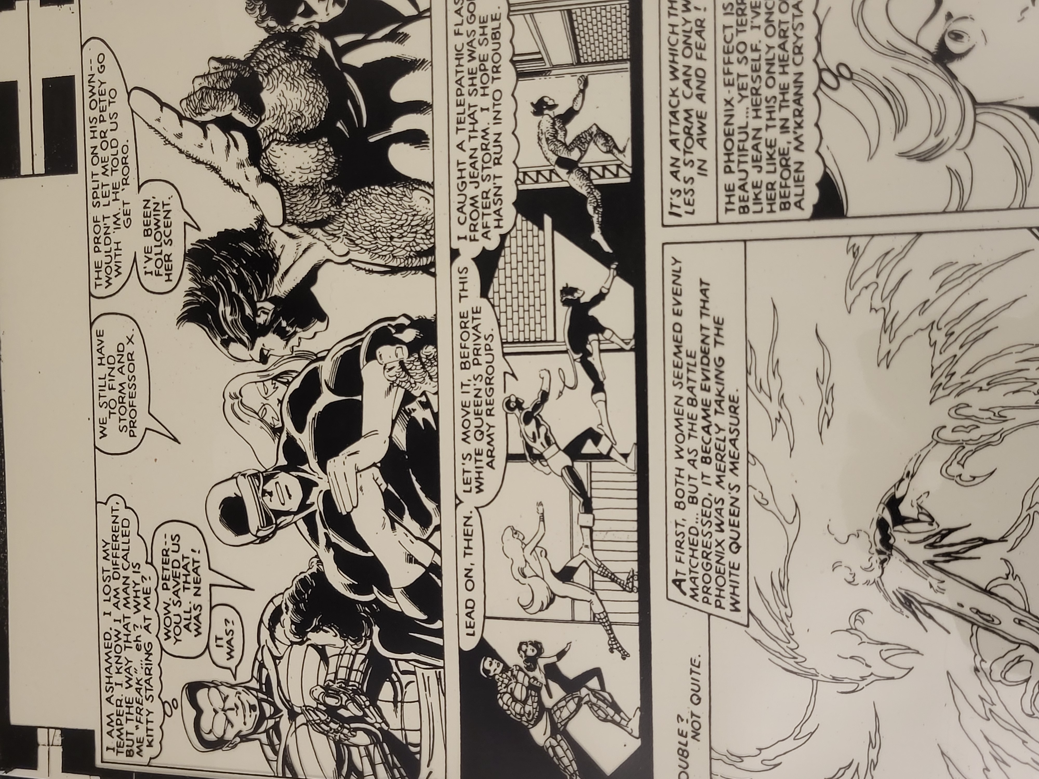 BID PER WHAT YOU SEE IN THE PHOTO, NOT THE AI GENERATED TITLES AND DESCRIPTIONS! This item is a production photostat of page 22 from Marvel Comics’ The Uncanny X-Men issue 131, part of the Dark Phoenix Saga storyline. The artwork is after the original pencils by John Byrne and inks by Terry Austin. The narrative sequence features several characters including Cyclops, Wolverine, Colossus, Kitty Pryde, Nightcrawler, and Jean Grey. The text includes dialogue referencing the White Queen, Professor X, and the Phoenix-effect. The item is rendered in black and white on glossy paper and is housed in a clear protective sleeve. It displays sharp, well-defined linework and clear text, consistent with production-grade materials used in the comic book publishing process.