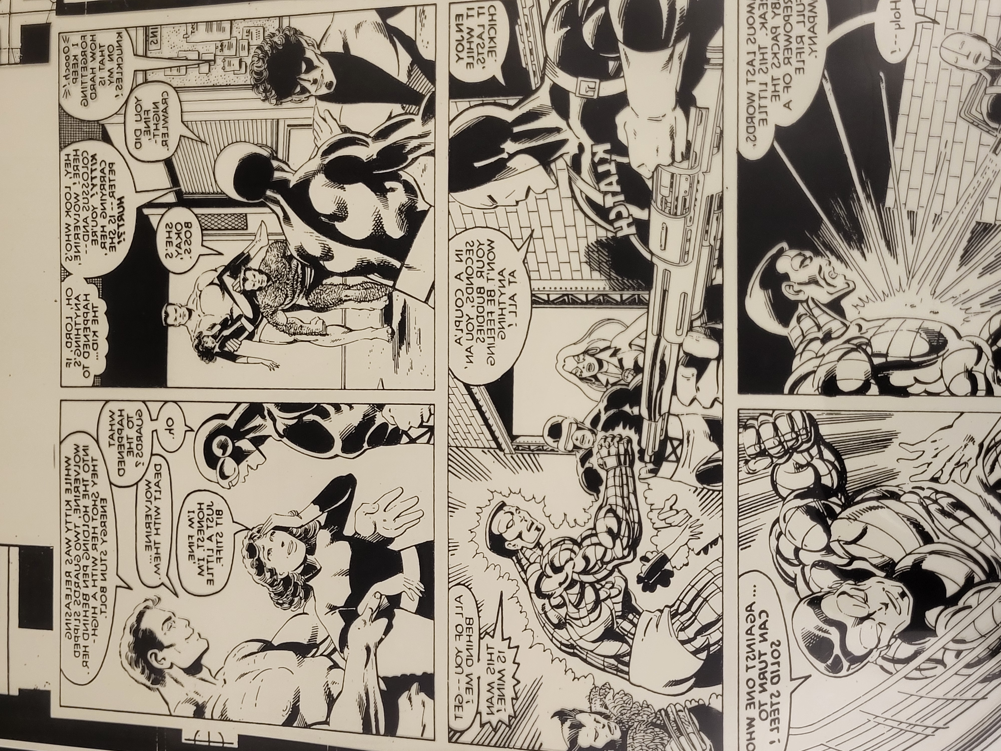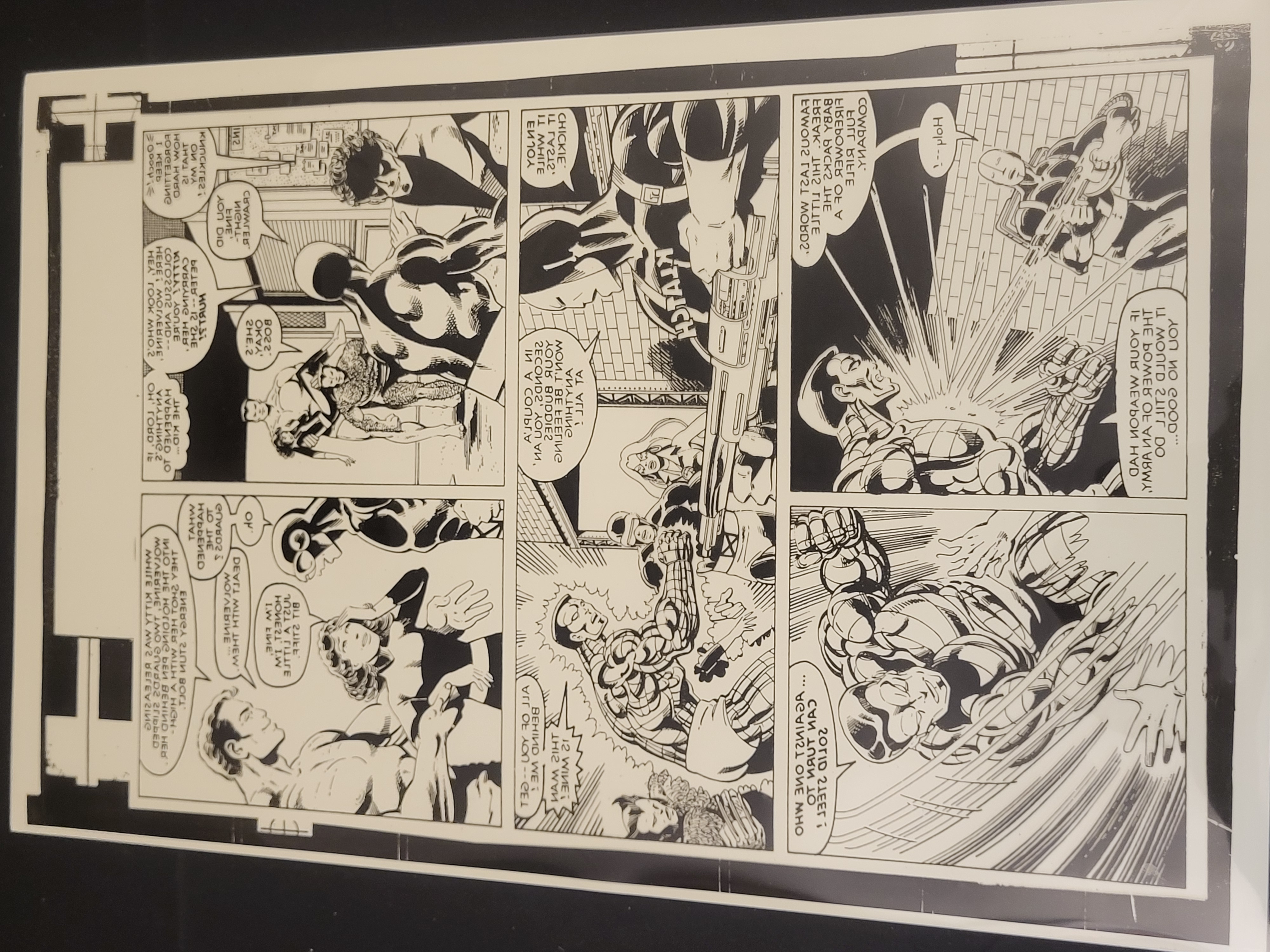 BID PER WHAT YOU SEE IN THE PHOTO, NOT THE AI GENERATED TITLES AND DESCRIPTIONS! This item is a single-page comic book production film featuring characters from Marvel Comics X-Men. The artwork is rendered in black and white line art on a transparent film substrate. The layout consists of multiple panels depicting an action sequence and character dialogue. Identifiable characters include Colossus in his armored state, Wolverine, Nightcrawler, and Kitty Pryde. The text within the speech bubbles and narrative boxes is presented in reverse mirrored format, a characteristic of production materials used in the printing process. Notable dialogue includes phrases such as SOLID STEEL, PETER IS SHE OKAY, and references to the characters by name. The artwork reflects the style of late 20th-century American superhero comics.
