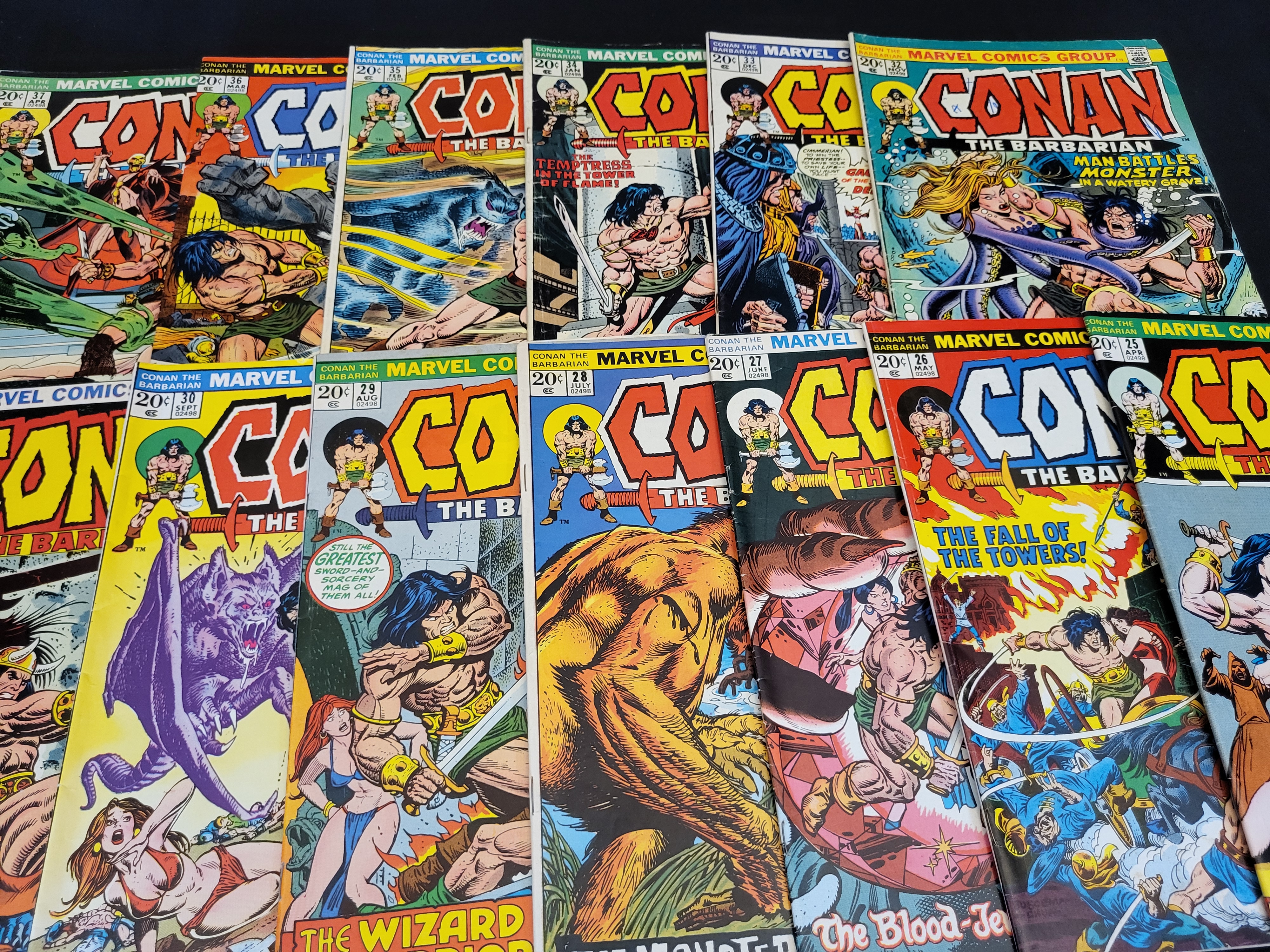 BID PER WHAT YOU SEE IN THE PHOTO, NOT THE AI GENERATED TITLES AND DESCRIPTIONS! A collection of Bronze Age comic books featuring Conan the Barbarian, published by Marvel Comics Group. The group includes a run of issues from number 25 through number 37, dating to the early 1970s. Each issue features the standard Marvel trade dress and a 20-cent original price point. Visible cover titles include The Murderous Mirrors of Kharam-Akkad, The Wizard and the Warrior, and The Monster. The items are printed on standard comic book stock with color covers.