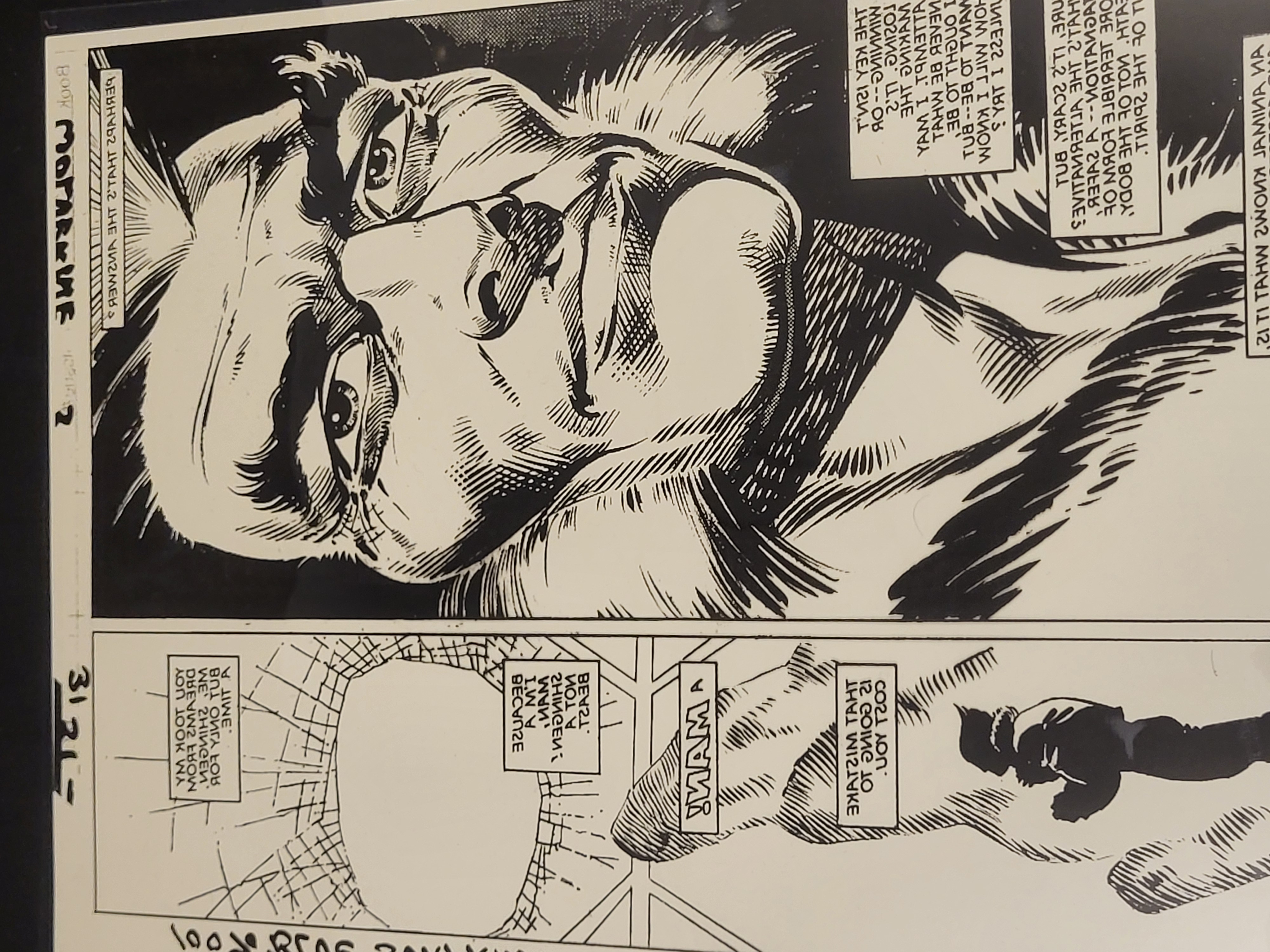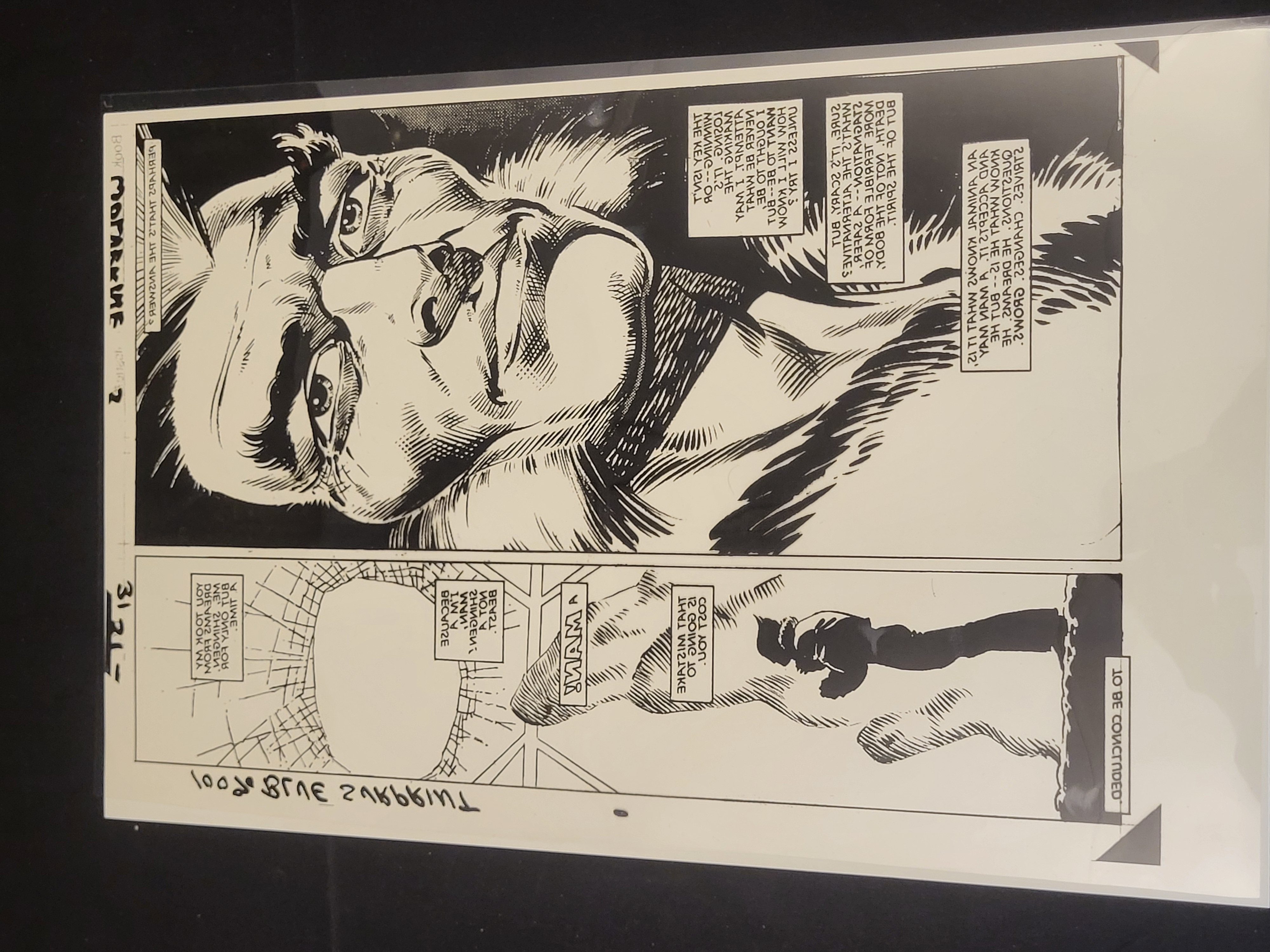 BID PER WHAT YOU SEE IN THE PHOTO, NOT THE AI GENERATED TITLES AND DESCRIPTIONS! A black and white production art photostat for page 2 of a Marvel Wolverine comic book. The page features two panels: the upper panel depicts a close-up of the character’s face, and the lower panel shows a silhouette against an abstract background. All text within the speech bubbles and narrative boxes is mirrored, indicating its function as a production component for the offset printing process. Handwritten notations in the left margin identify the project as Book WOLVERINE and Page 2, accompanied by the numerical code 3121-. A handwritten note at the bottom edge reads 100% BLUE PRINT. The item is housed in a clear plastic protective sleeve.