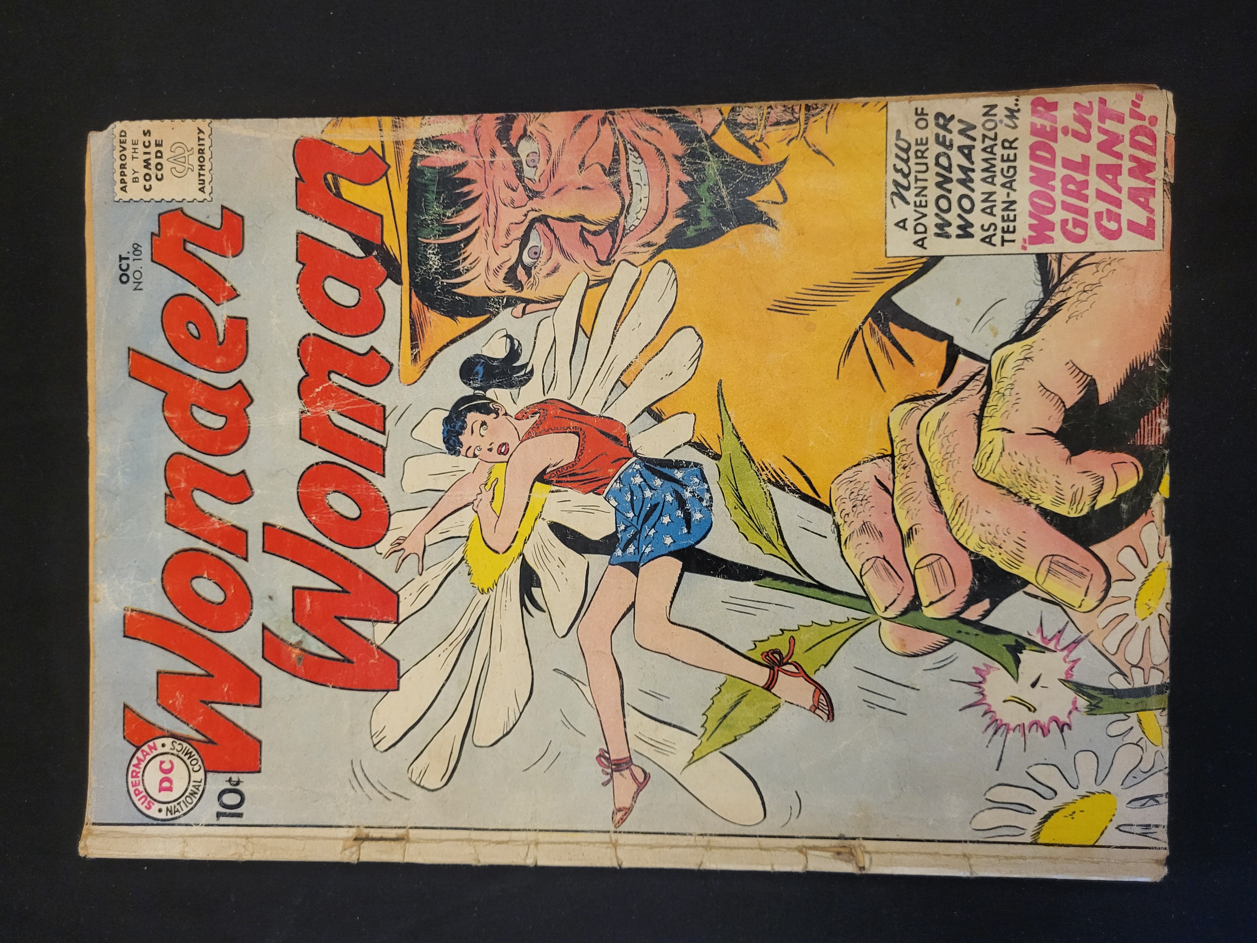 BID PER WHAT YOU SEE IN THE PHOTO, NOT THE AI GENERATED TITLES AND DESCRIPTIONS! A vintage copy of Wonder Woman issue no. 109, published by DC Comics and dated October 1959. This Silver Age comic book features the cover story titled Wonder Girl in Giant Land! with illustrations depicting a teenage Wonder Girl being held by a giant over a daisy. The front cover includes the original 10-cent retail price and the Superman DC National Comics seal in the lower-left corner. The back cover features a full-page color advertisement for 150 Civil War Soldiers by Josely Co. The item is a standard staple-bound comic book.