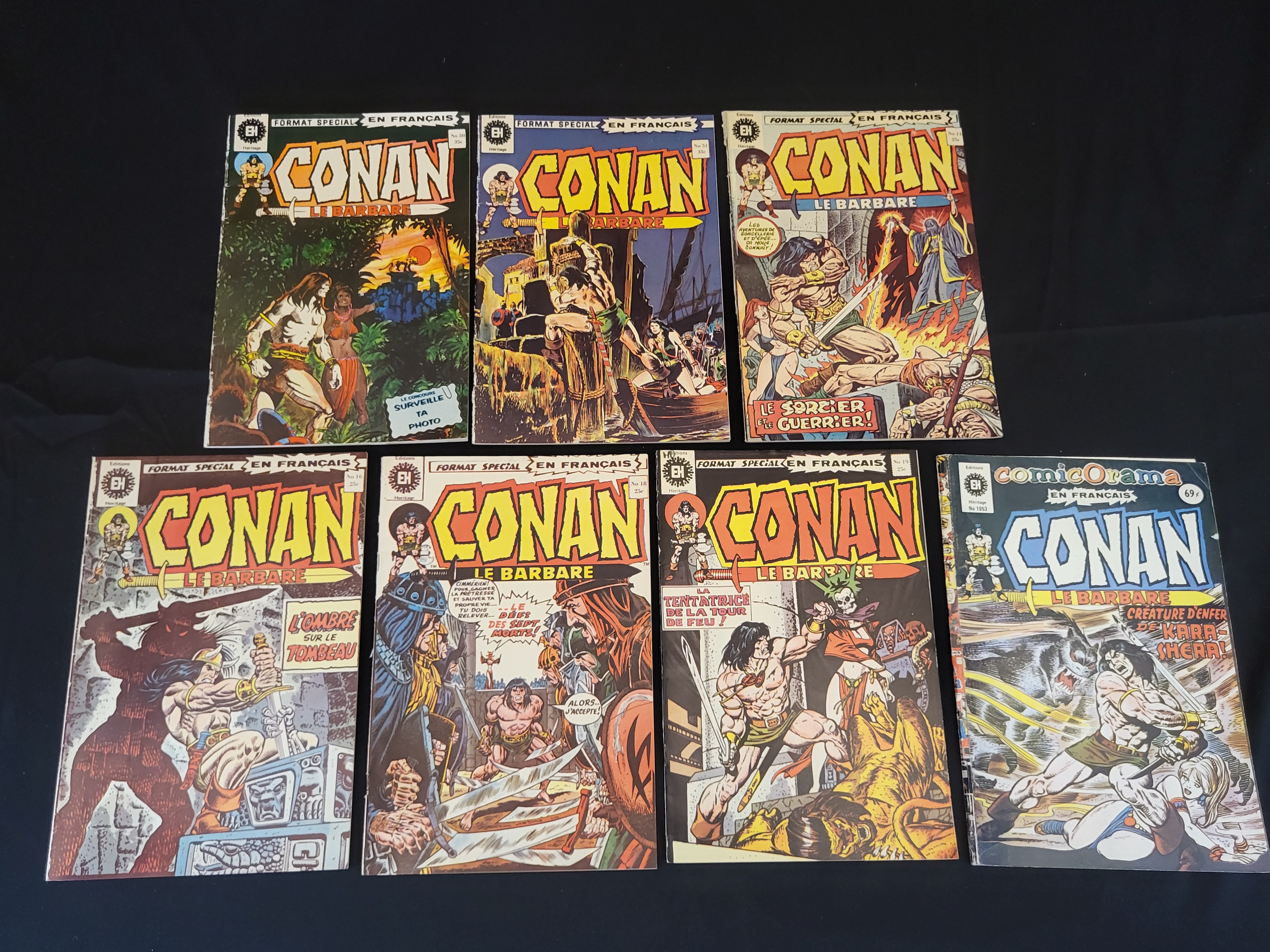 BID PER WHAT YOU SEE IN THE PHOTO, NOT THE AI GENERATED TITLES AND DESCRIPTIONS! A collection of vintage French-language comic books titled Conan le Barbare, published by Éditions Héritage. The group includes various issues from the Format Special EN FRANÇAIS series, including numbers 16, 18, 19, 30, 31, and 34, as well as a comicOrama edition, number 1053. These staple-bound paper publications feature fantasy cover illustrations and interior content translated from the original Marvel Comics series. The reverse covers display period-specific advertisements for titles such as Daktari, Bobino et Bobinette, and a collage of other Héritage publications including Thor, Hulk, and Spider-Man.