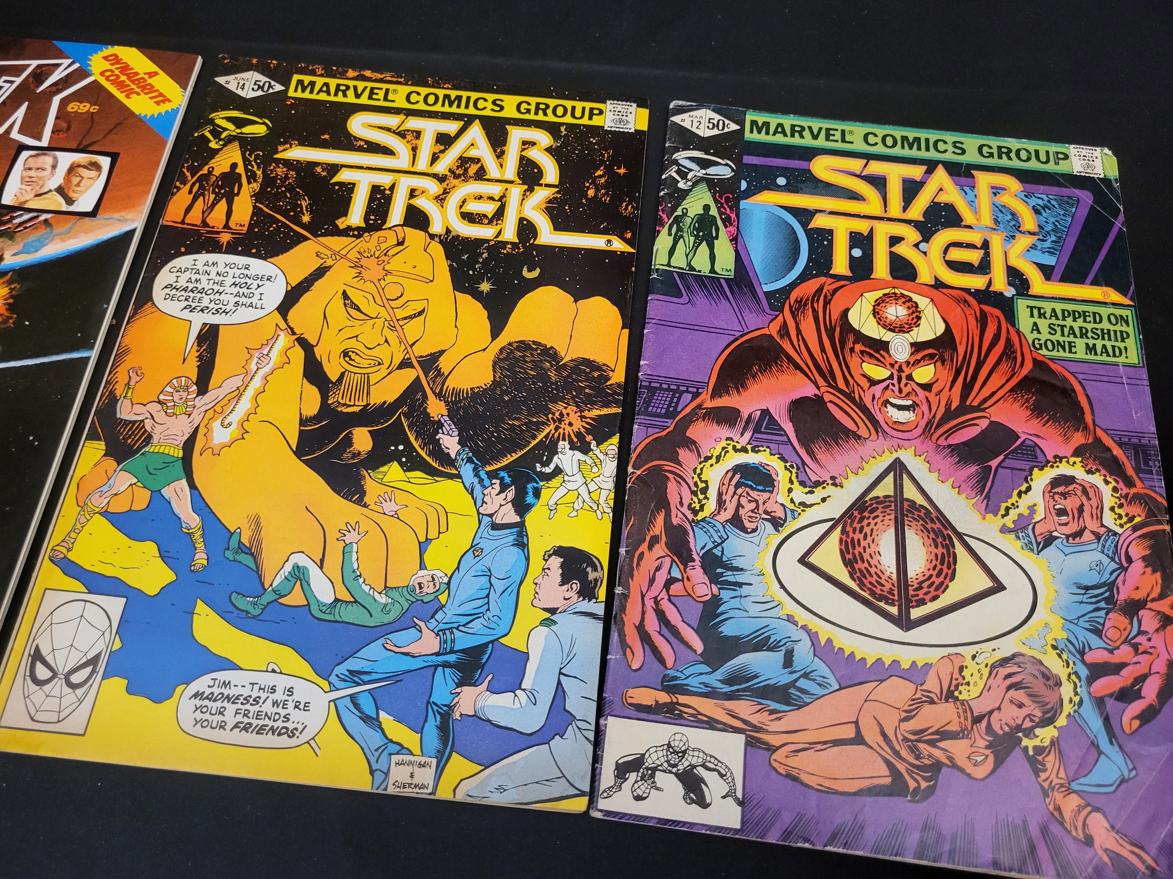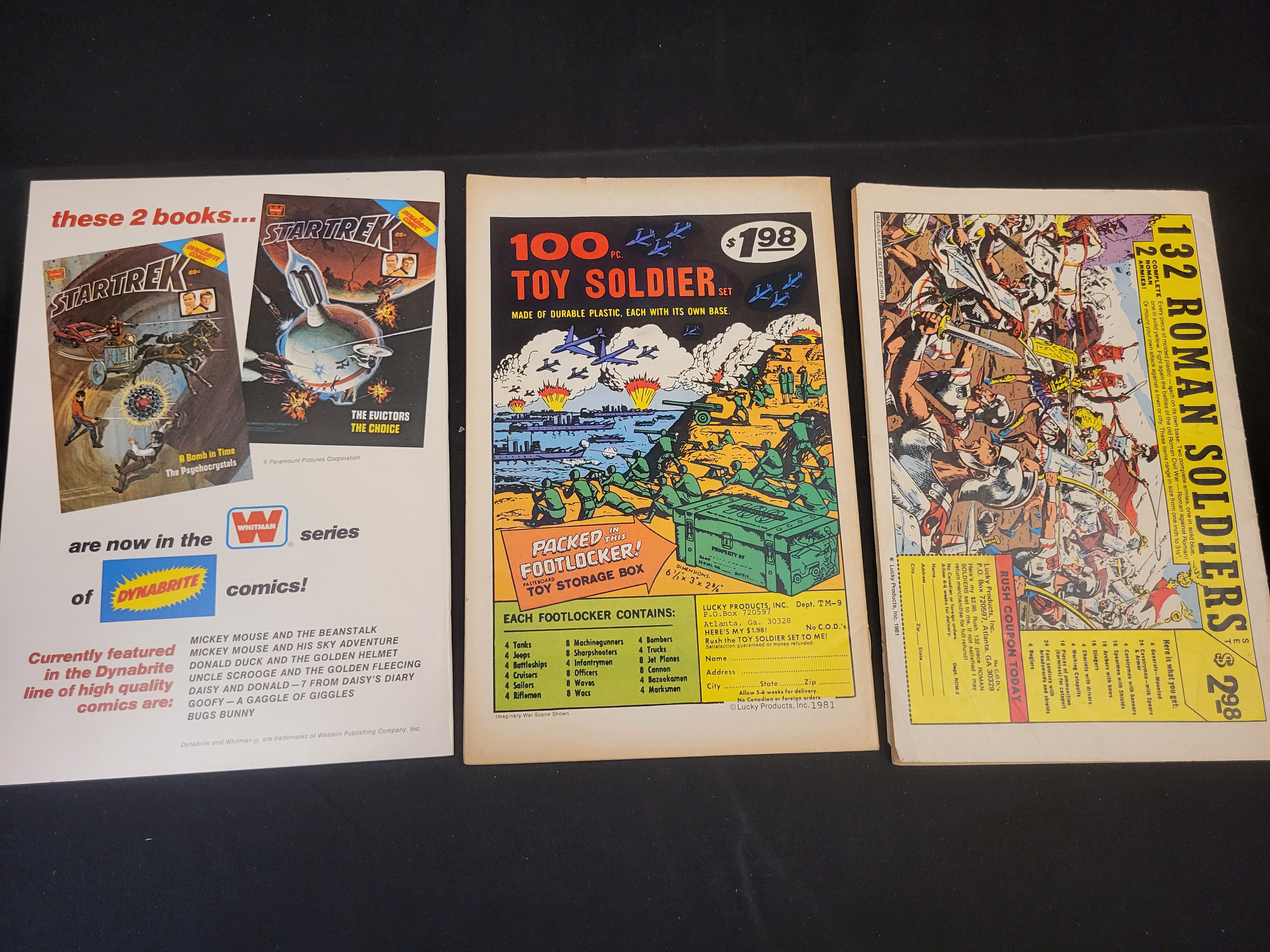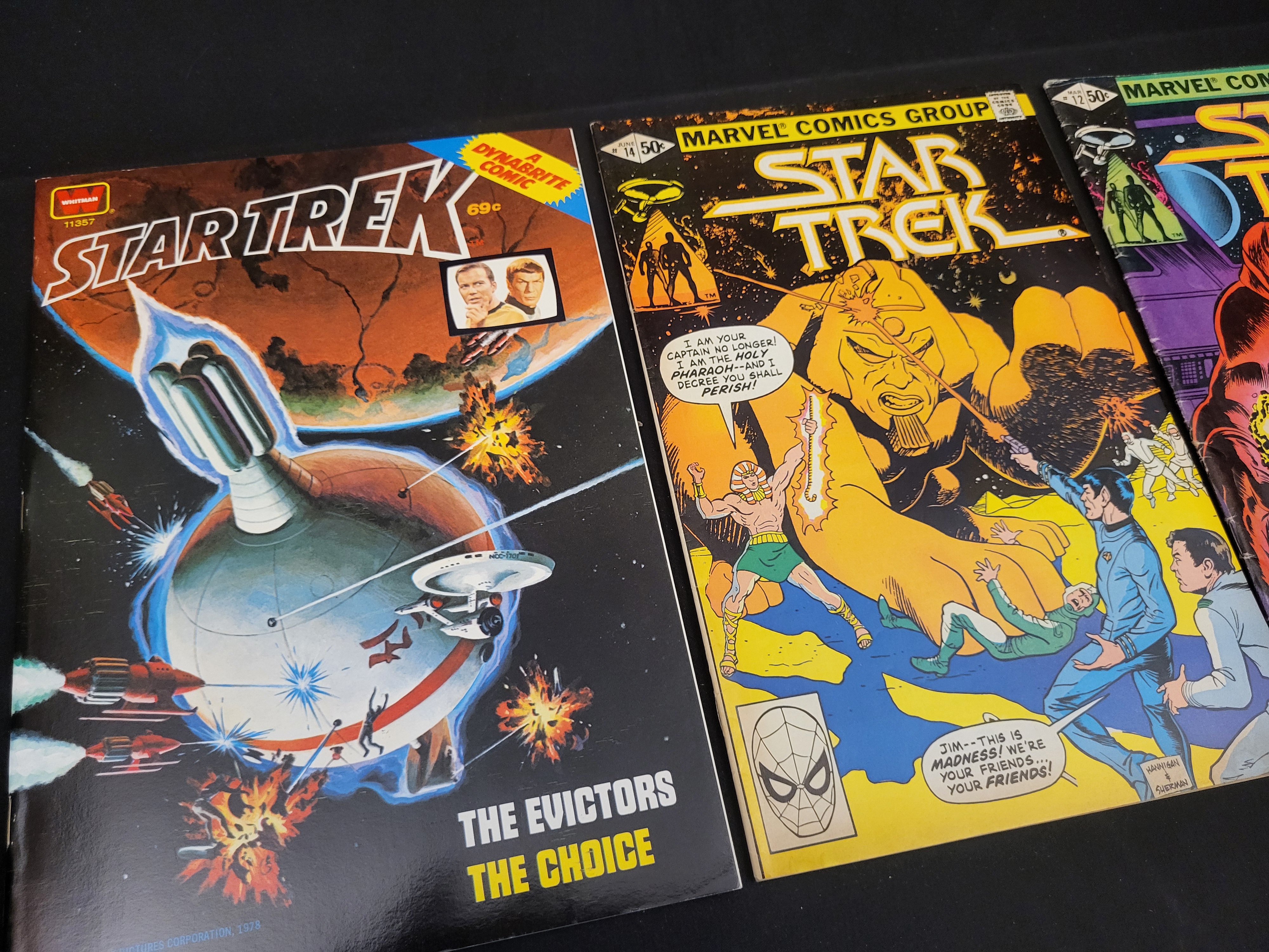 BID PER WHAT YOU SEE IN THE PHOTO, NOT THE AI GENERATED TITLES AND DESCRIPTIONS! A trio of vintage Star Trek comic books comprising two Marvel Comics Group issues and one Whitman Dynabrite edition. The Marvel issues consist of Volume 2, No. 12 (March 1981), titled Trapped on a Starship Gone Mad!, and No. 14 (June 1981). The Whitman Dynabrite edition, issue 11357 (c. 1979), contains the stories The Evictors and The Choice. These staple-bound paper publications feature vibrant cover art and period-appropriate advertisements on the reverse, including promotions for plastic toy soldier sets and other contemporary comic titles.