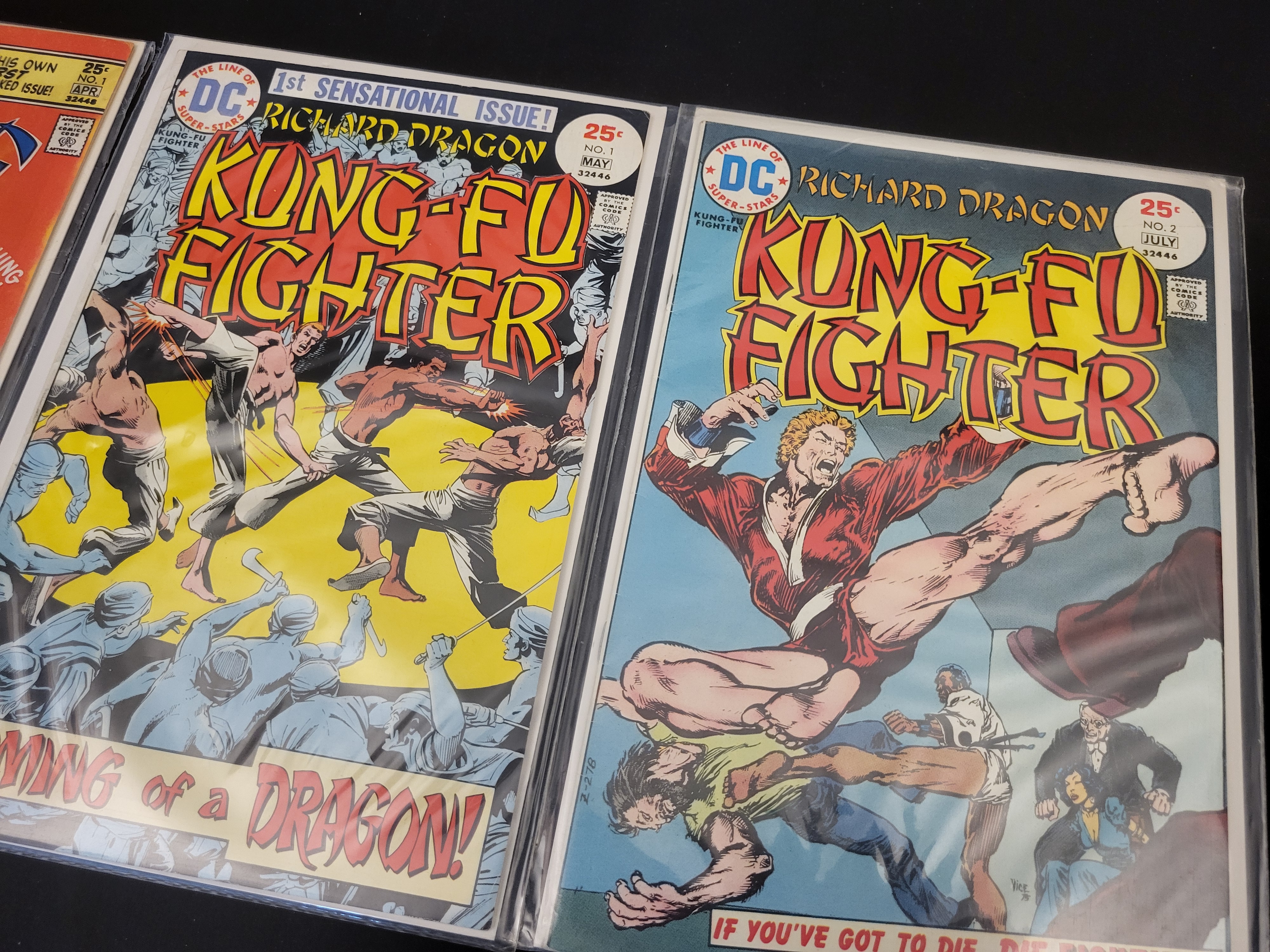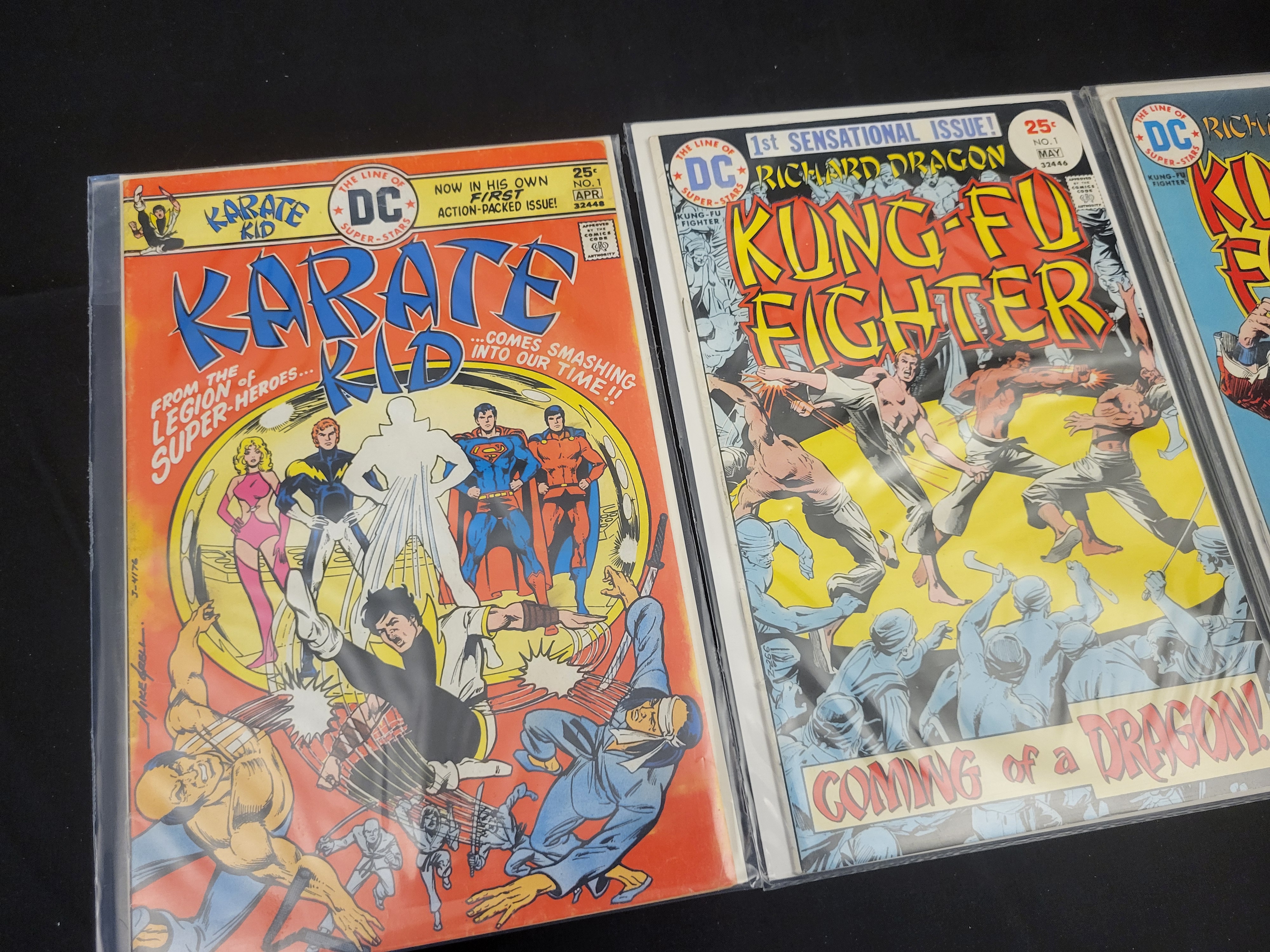 BID PER WHAT YOU SEE IN THE PHOTO, NOT THE AI GENERATED TITLES AND DESCRIPTIONS! This group of vintage DC comic books from the mid-1970s features martial arts-themed titles published by DC Comics. The selection includes Richard Dragon, Kung-Fu Fighter No. 1 (May 1975), Richard Dragon, Kung-Fu Fighter No. 2 (July 1975), and Karate Kid No. 1 (April 1976). These Bronze Age publications carry a 25-cent cover price and feature The Line of DC Super-Stars branding alongside the Comics Code Authority seal. Richard Dragon, Kung-Fu Fighter No. 1 is identified as the first appearance of the characters Richard Dragon and Ben Turner, the latter associated with the Suicide Squad. Each comic is printed on standard paper stock with stapled spines and is individually housed in a clear protective sleeve with a cardboard backing.