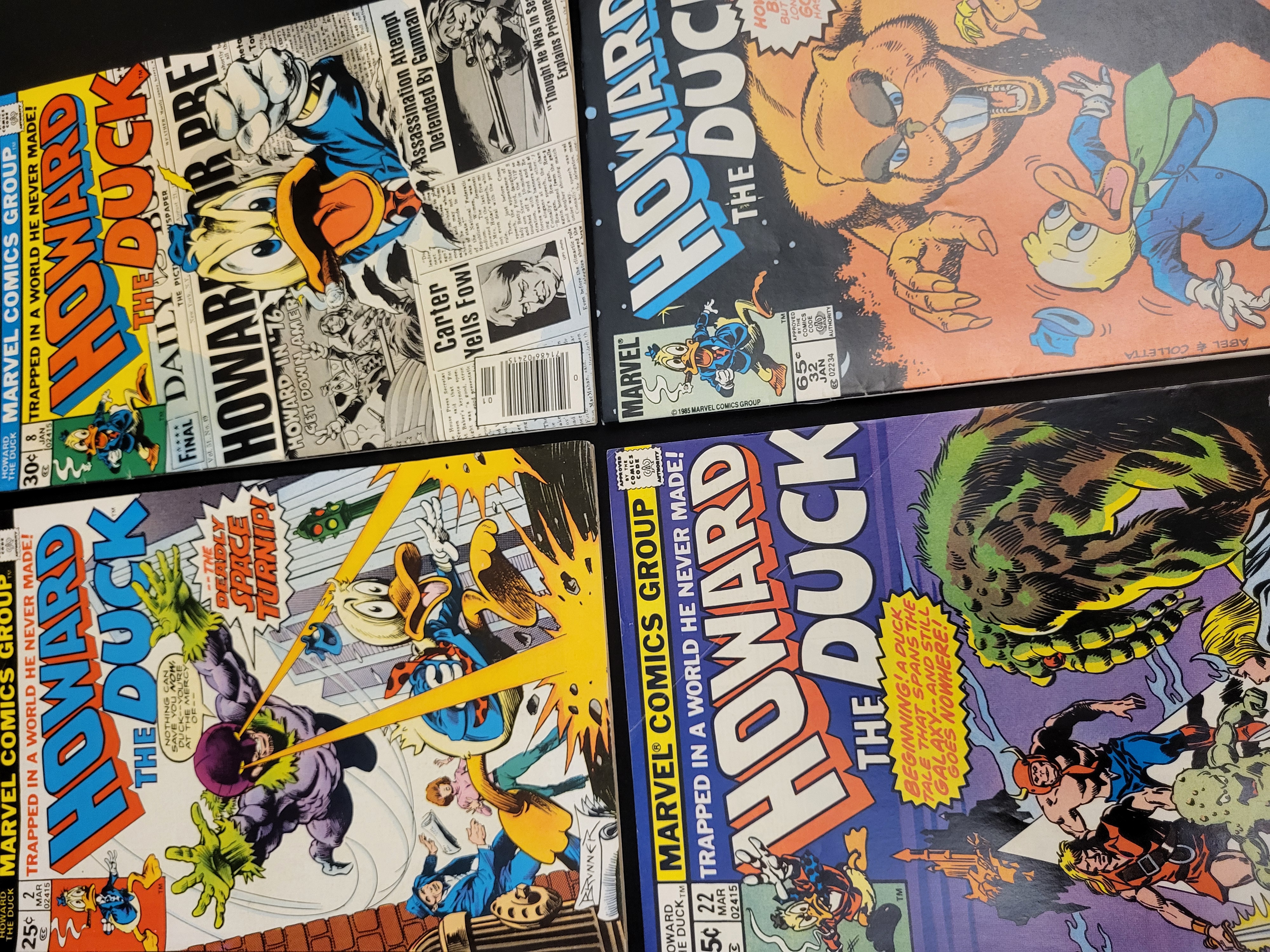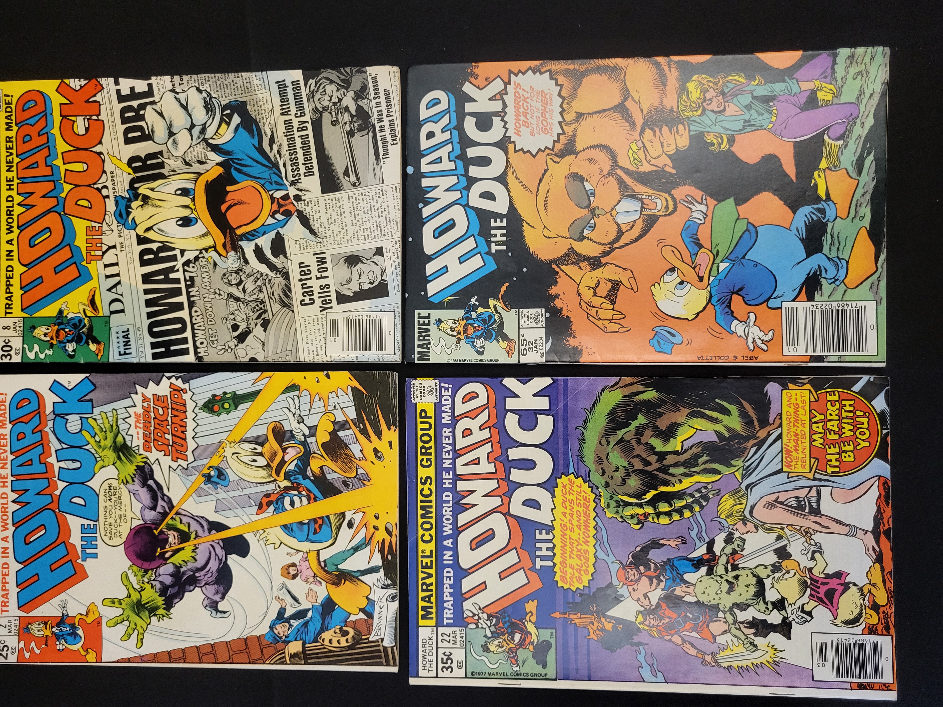BID PER WHAT YOU SEE IN THE PHOTO, NOT THE AI GENERATED TITLES AND DESCRIPTIONS! A group of vintage comic books featuring Howard the Duck, published by Marvel Comics Group between 1976 and 1985. The collection includes issue number 2 (March 1976) featuring the storyline The Deadly Space Turnip!, issue number 8 (January 1977) featuring the Howard for President satirical campaign, issue number 22 (March 1978), and issue number 32 (January 1985). These are staple-bound paper publications with original cover prices ranging from 25 cents to 65 cents. The issues represent the Bronze and Copper Ages of Marvel Comics and feature various cover artists and writers associated with the series.