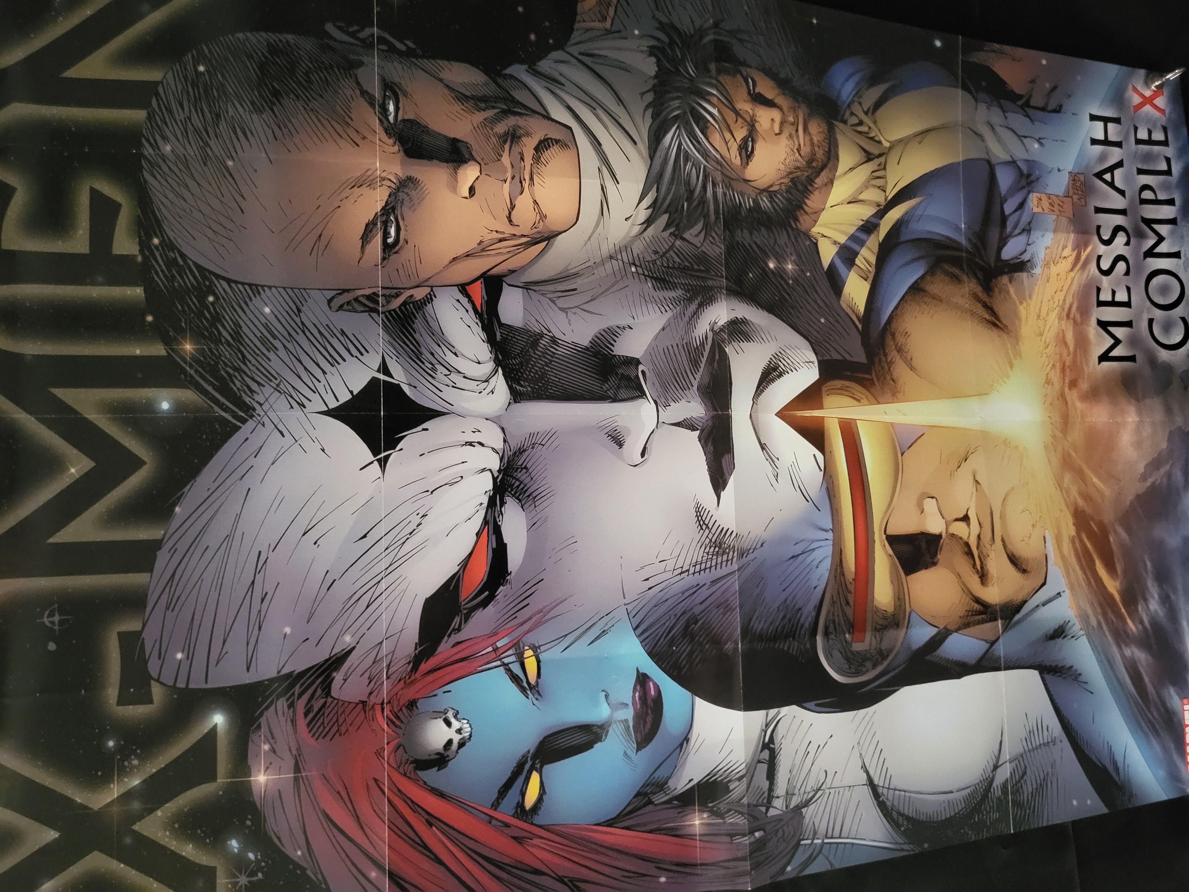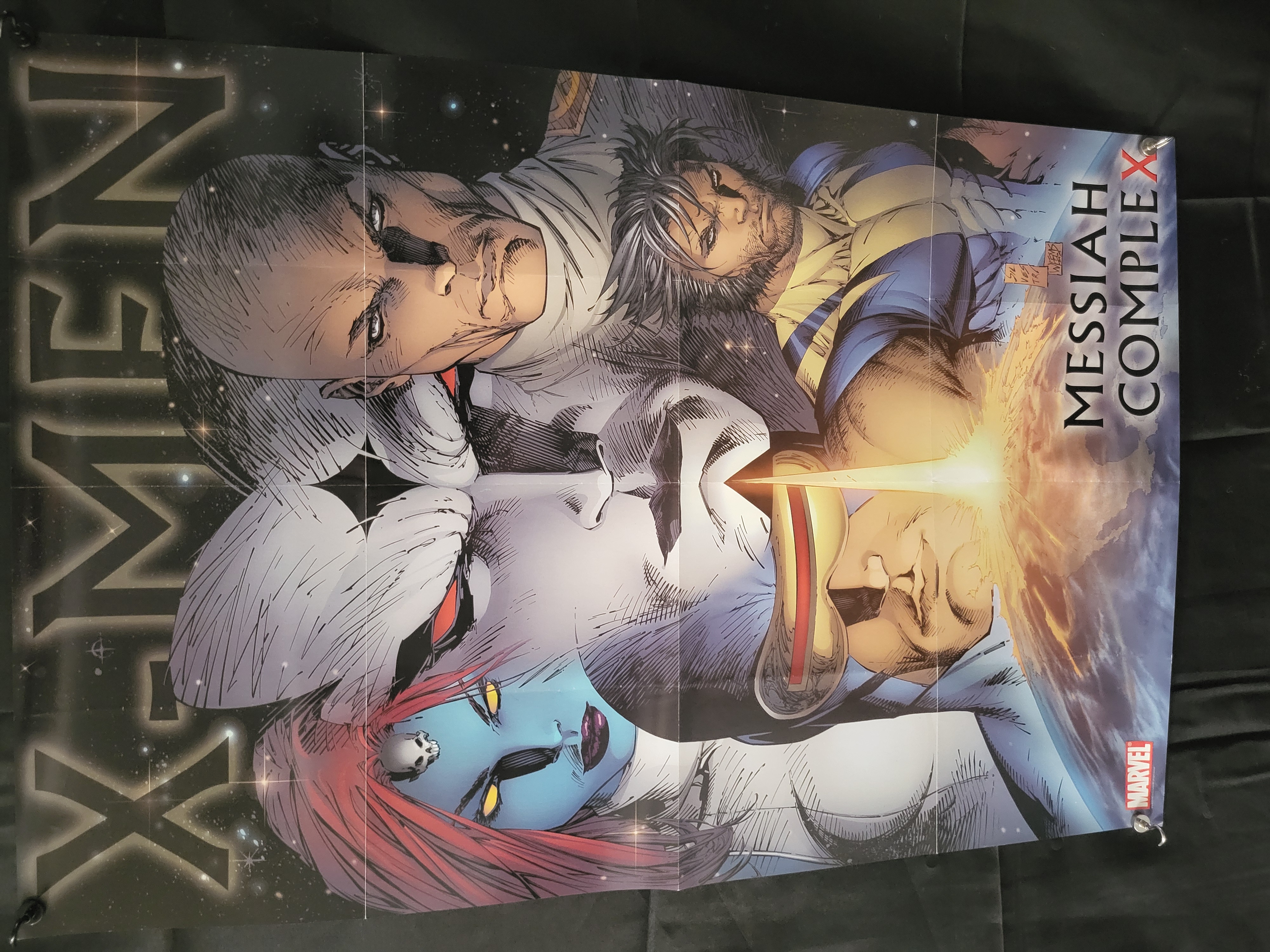BID PER WHAT YOU SEE IN THE PHOTO, NOT THE AI GENERATED TITLES AND DESCRIPTIONS! This Marvel Comics promotional poster, produced circa 2007, features artwork for the X-Men: Messiah Complex crossover storyline. The illustration is credited to artists Marc Silvestri and Joe Weems and depicts several characters including Professor X, Wolverine, Cyclops, and Mystique set against a starfield background. The layout features large, stylized X-MEN text oriented vertically along the left edge, with the words MESSIAH COMPLEX and the red Marvel logo positioned on the right. The item is a color-printed paper promotional insert.